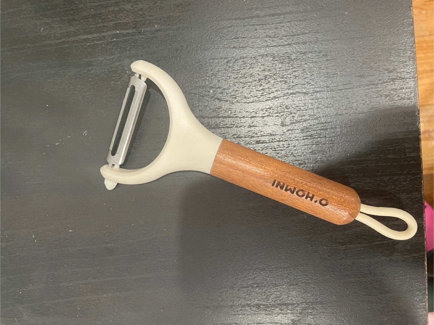 This is an INWOH.O swivel peeler with a wood-grain handle. Its blade is made of stainless steel. Swivel head for easy peeling.