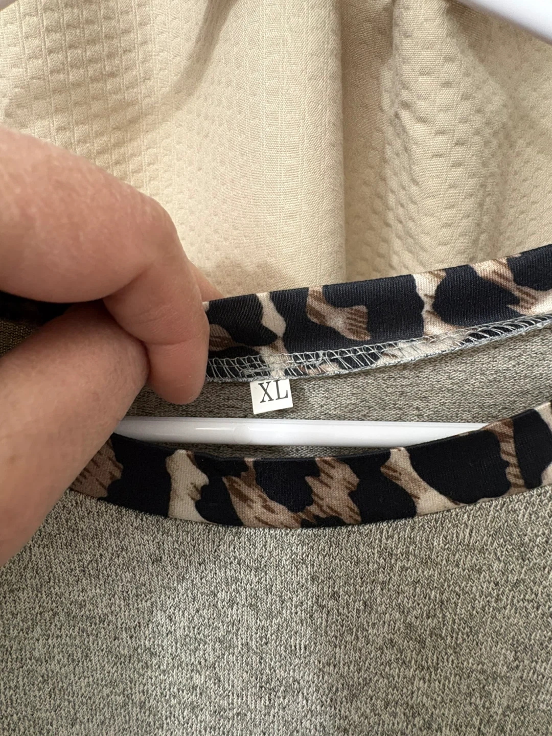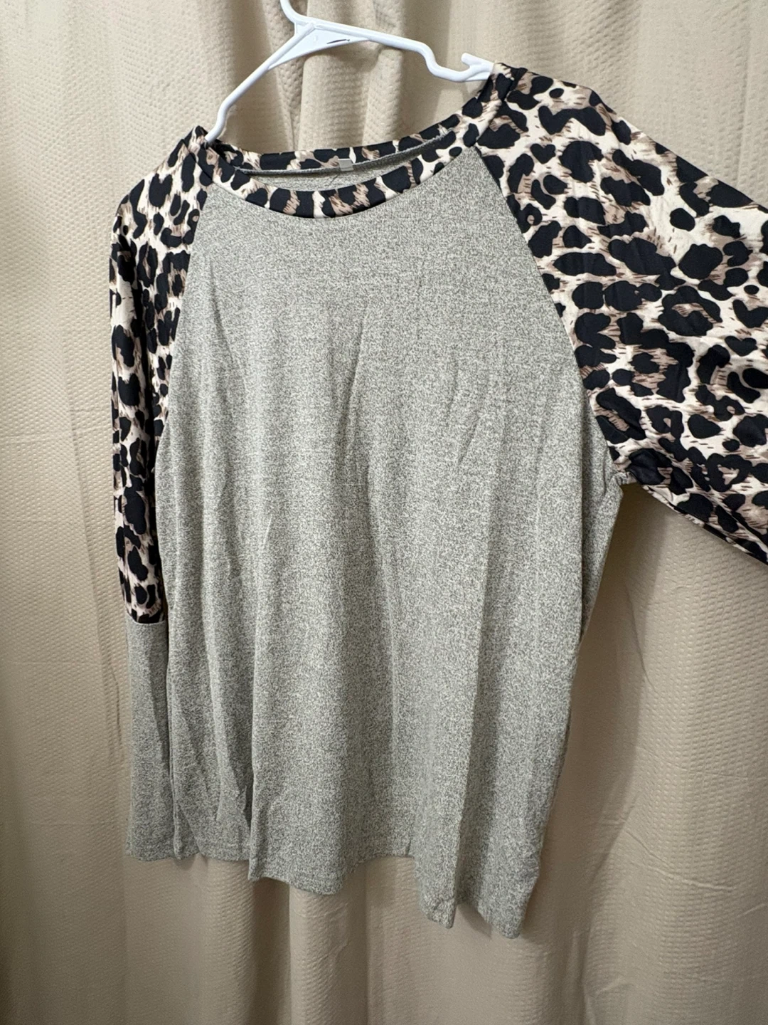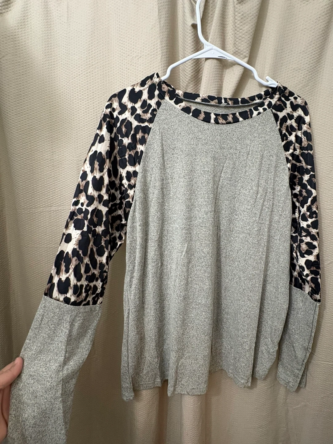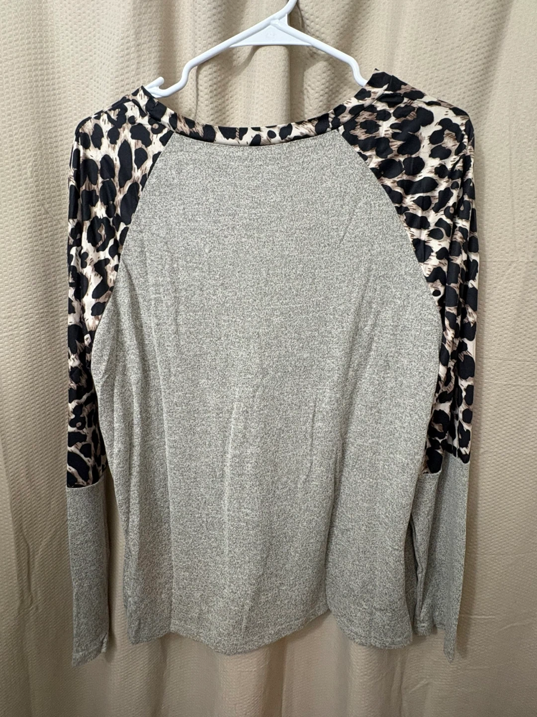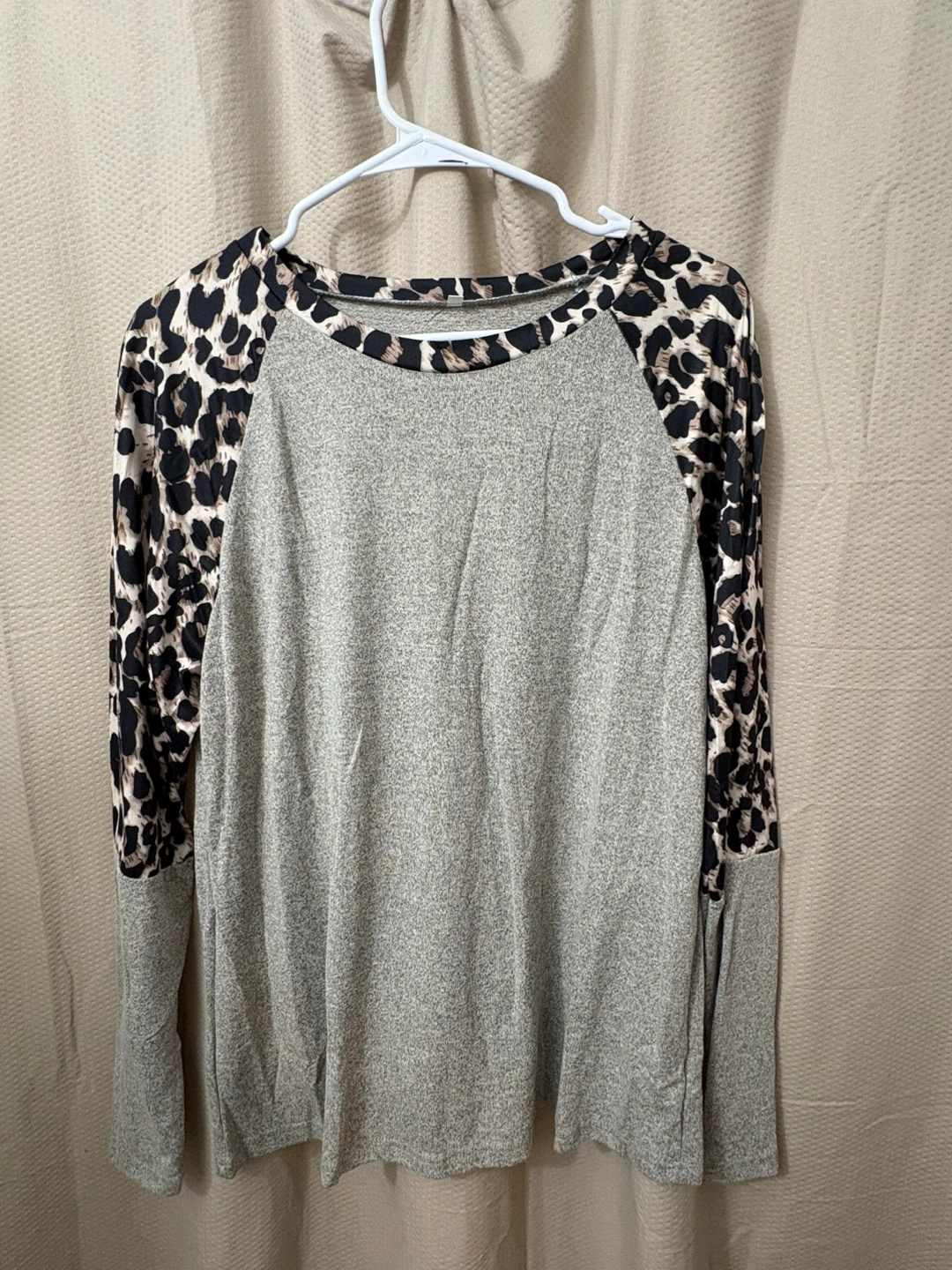 This women's long sleeve top features a grey heathered body with black and brown leopard print sleeves and neckline trim. It's a size XL. This top is great for casual wear.