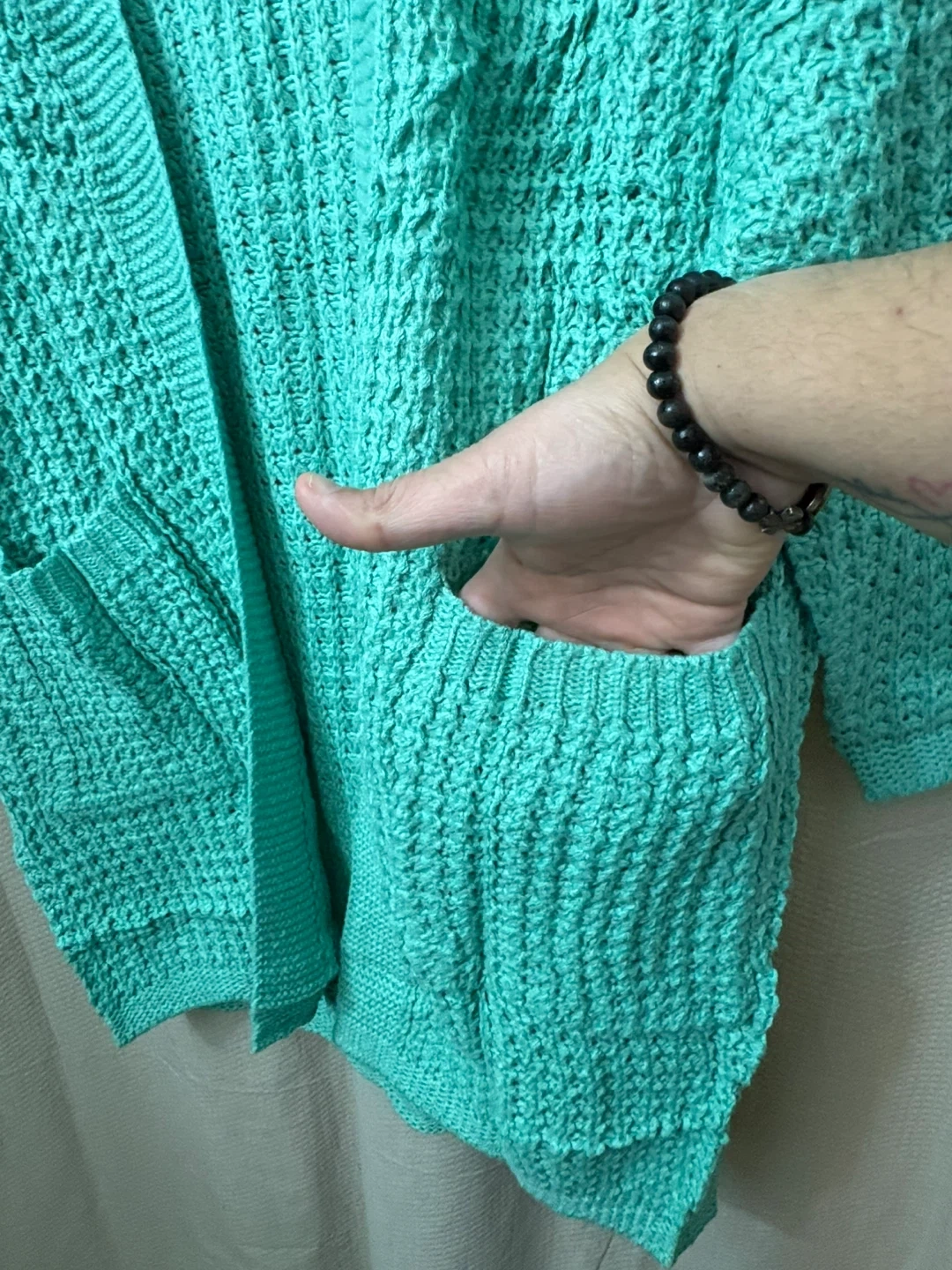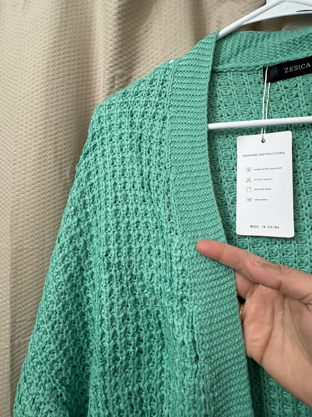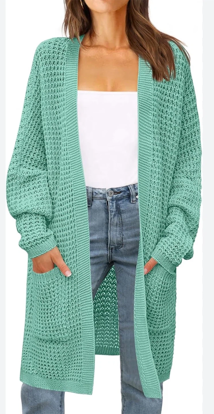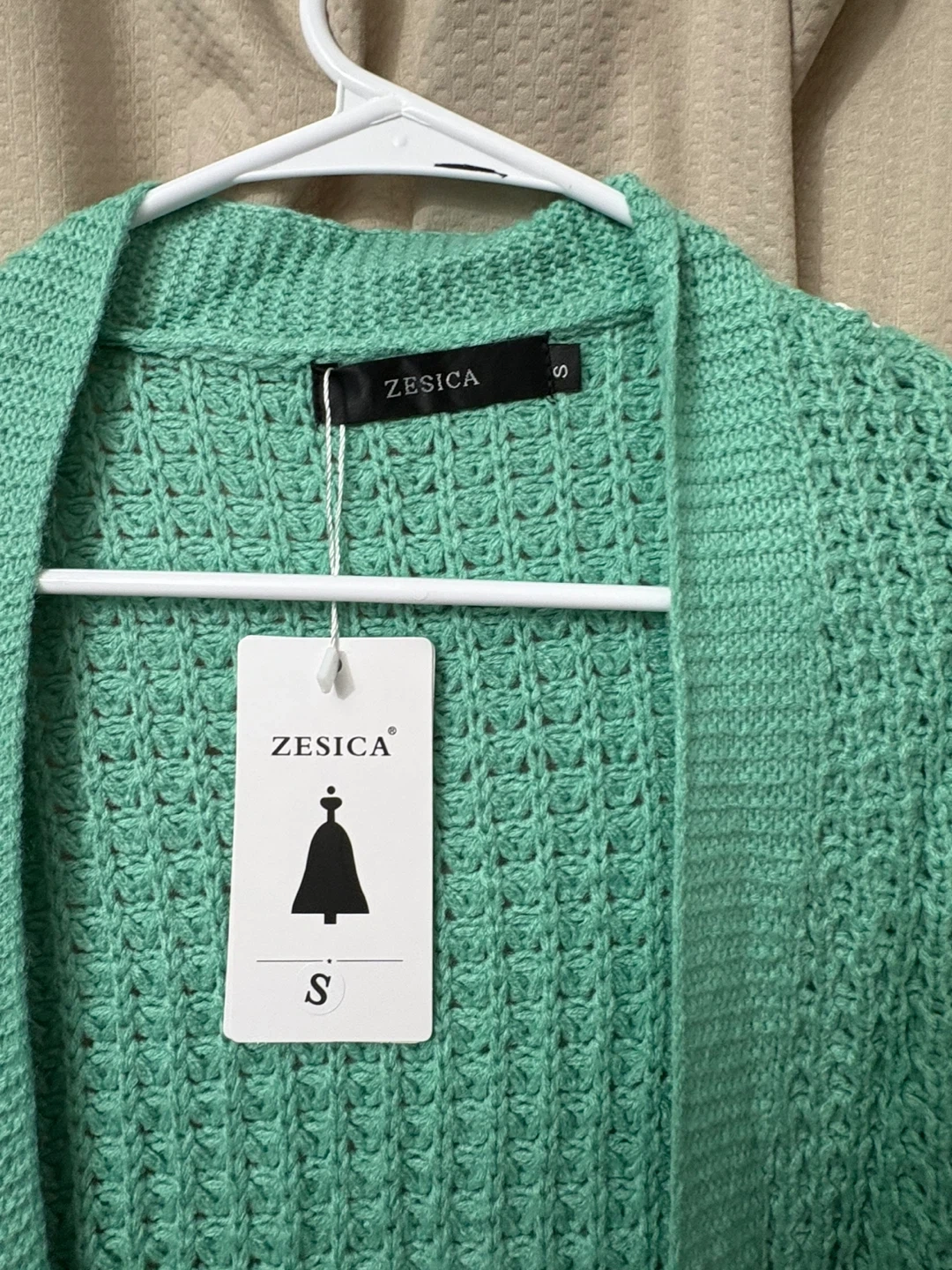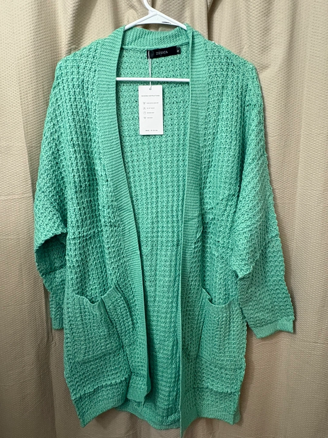 This Zesica cardigan sweater is made with a textured knit fabric and features an open front design with two front pockets. It's a size S and comes in a lovely mint green color. Perfect for layering over any outfit!