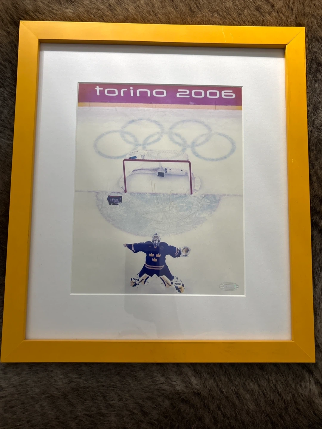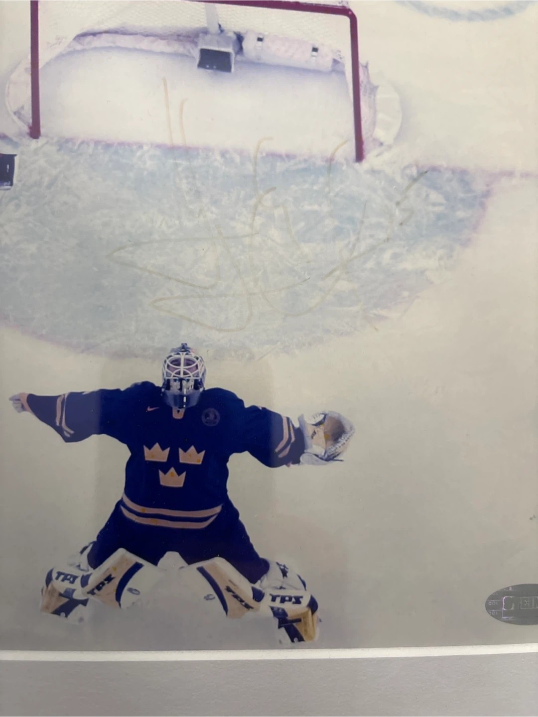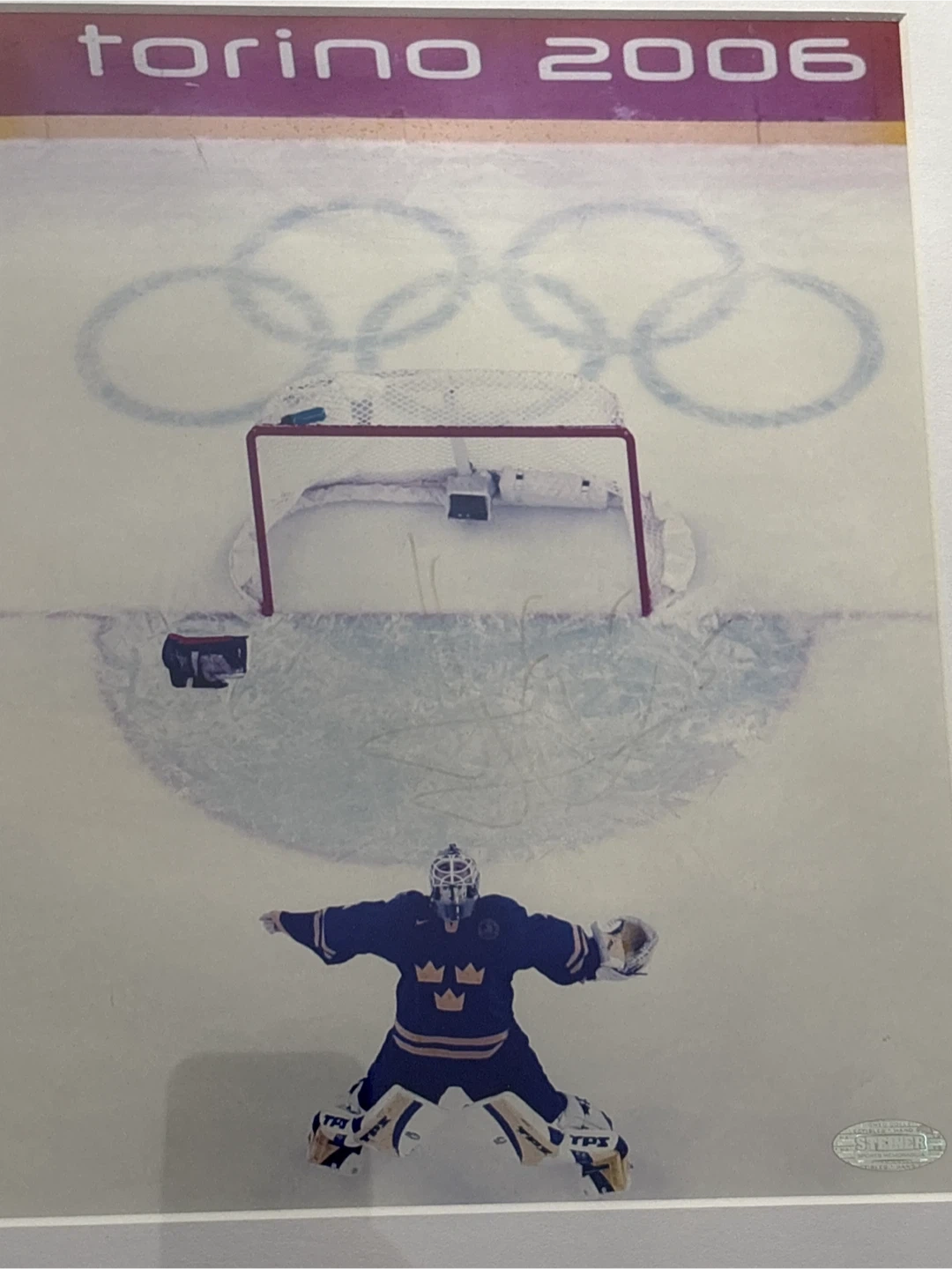 Framed photo from the Torino 2006 Olympics featuring a Swedish hockey goalie, autographed by Henrik Lundqvist #5. (Signature fade due to light exposure) Includes Steiner Sports Memorabilia authentication. Ready to hang. 13x15 inches