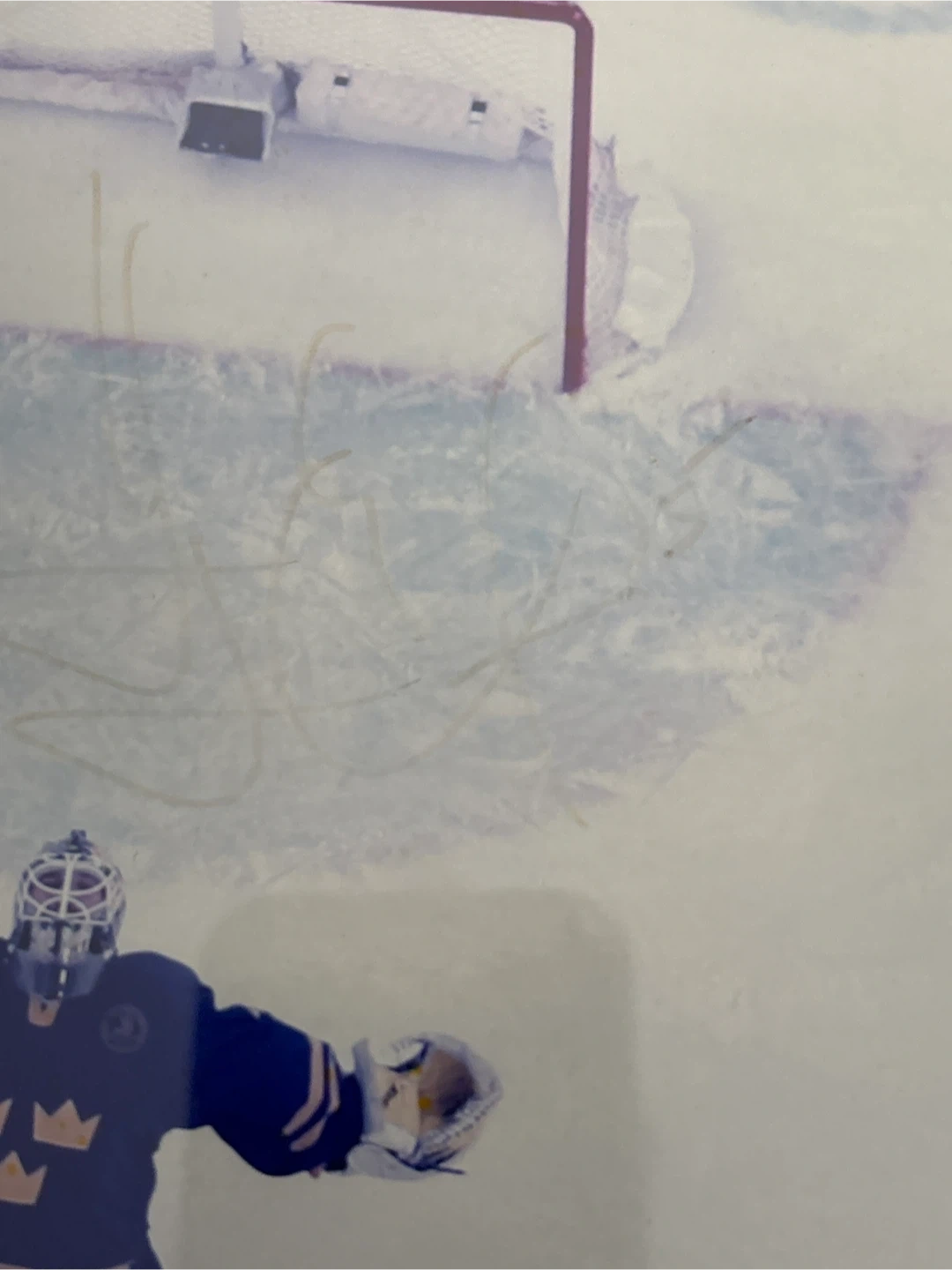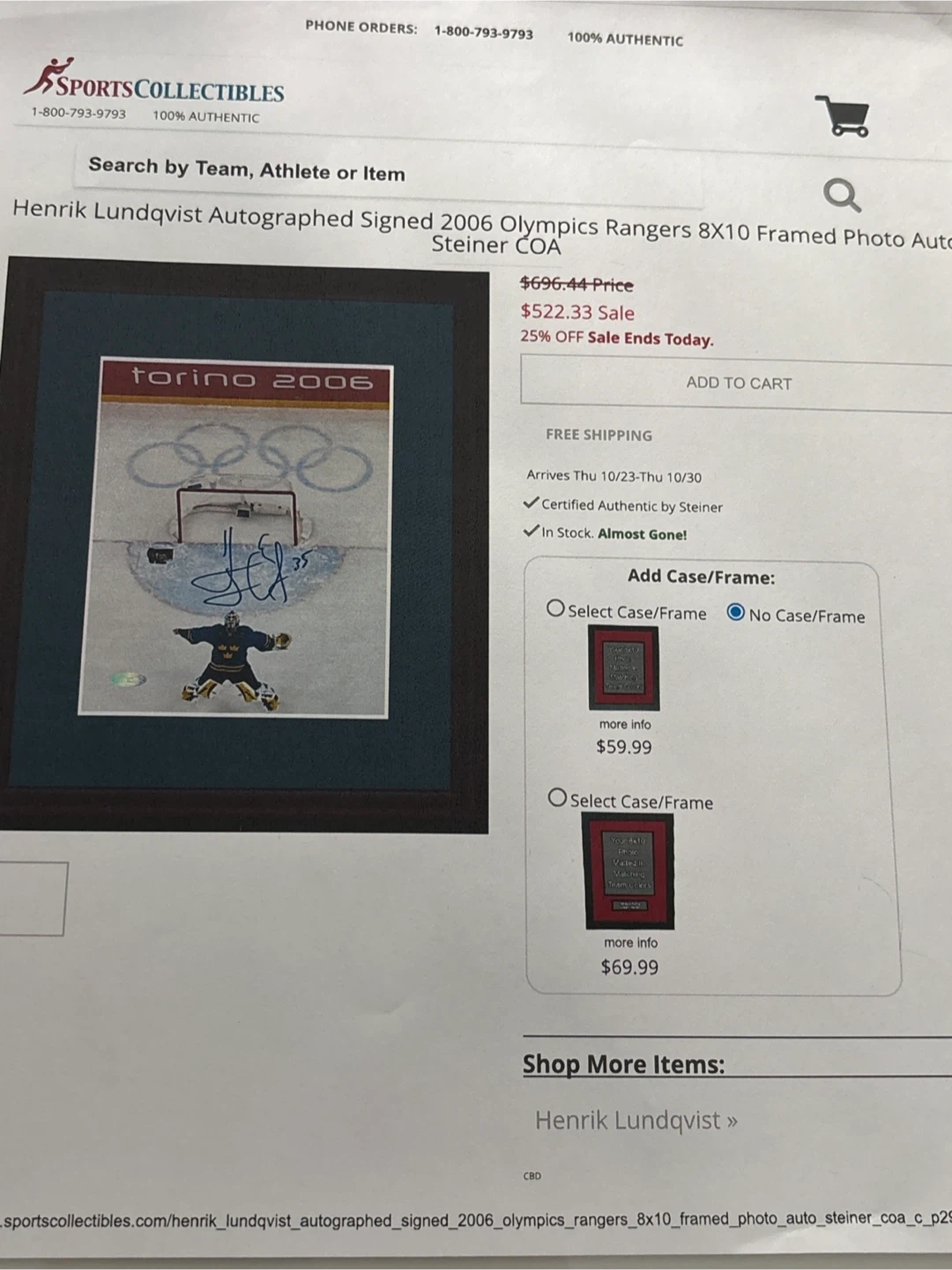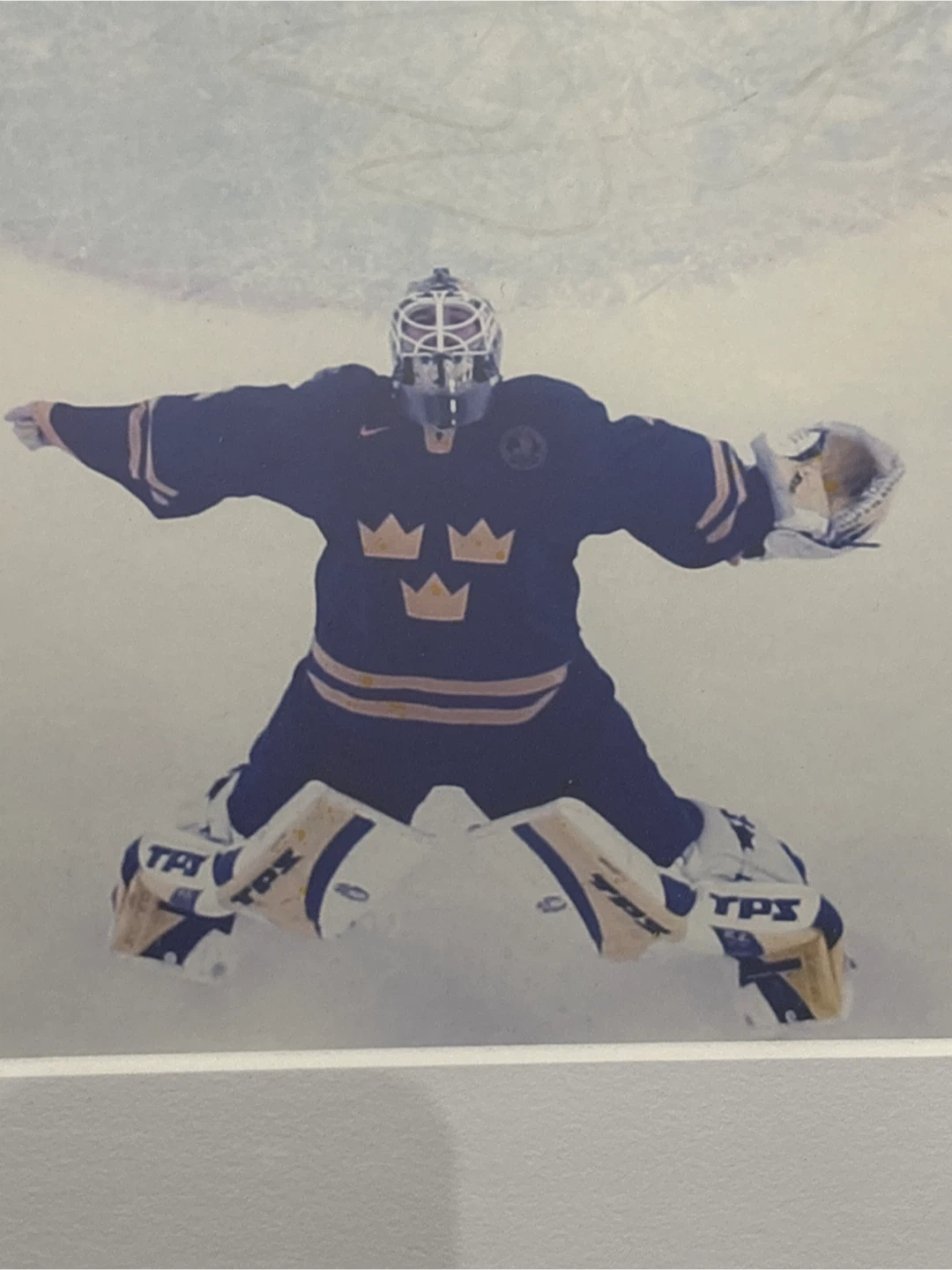 Framed photo from the Torino 2006 Olympics featuring a Swedish hockey goalie, autographed by Henrik Lundqvist #5. (Signature fade due to light exposure) Includes Steiner Sports Memorabilia authentication. Ready to hang. 13x15 inches