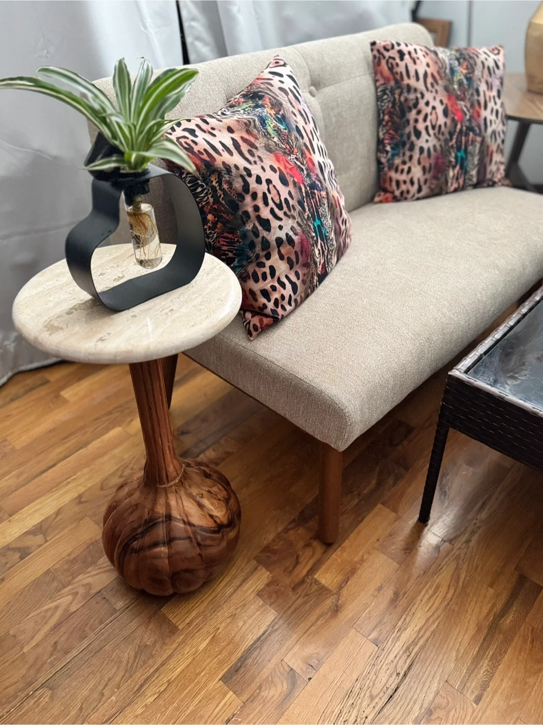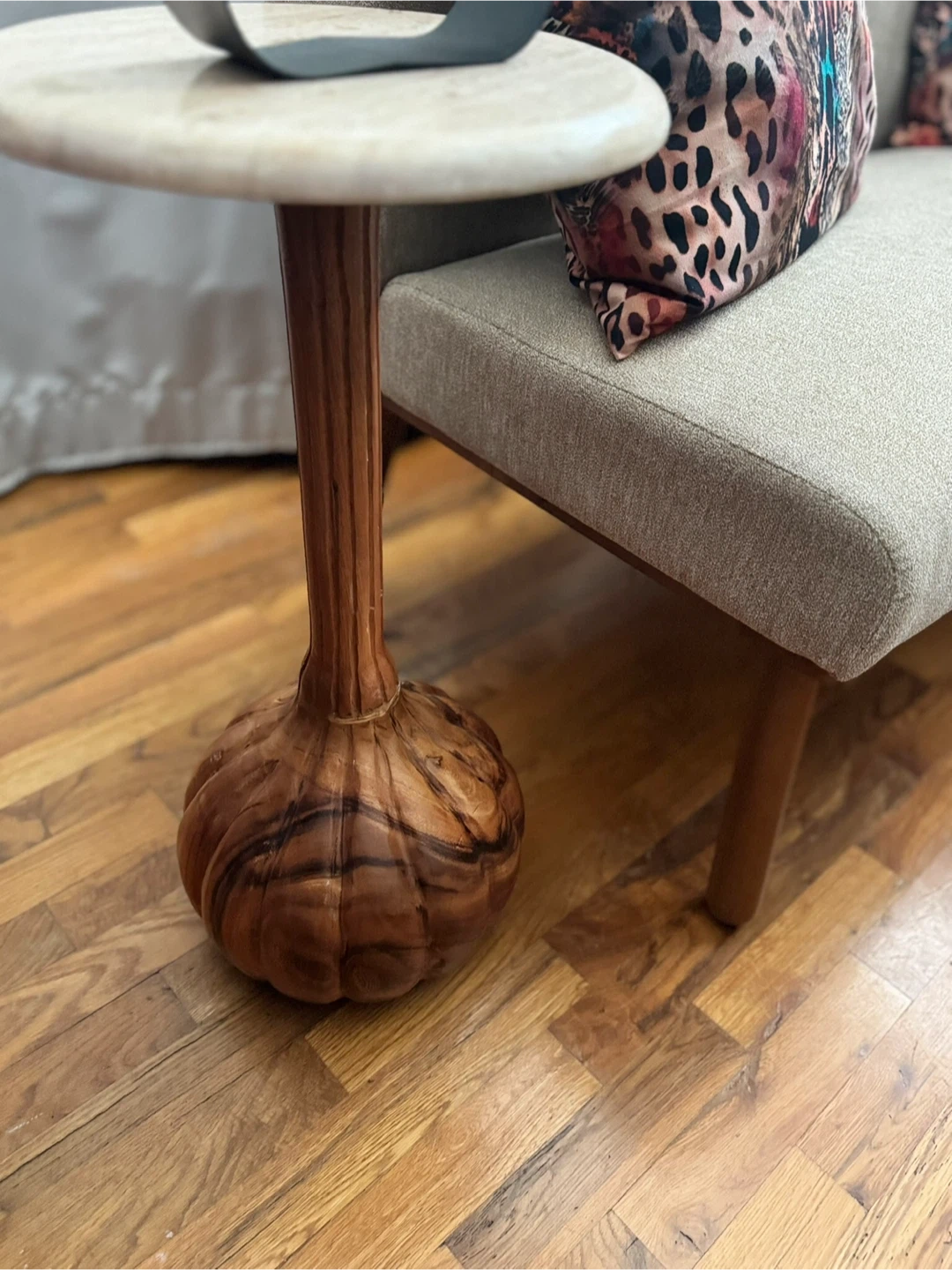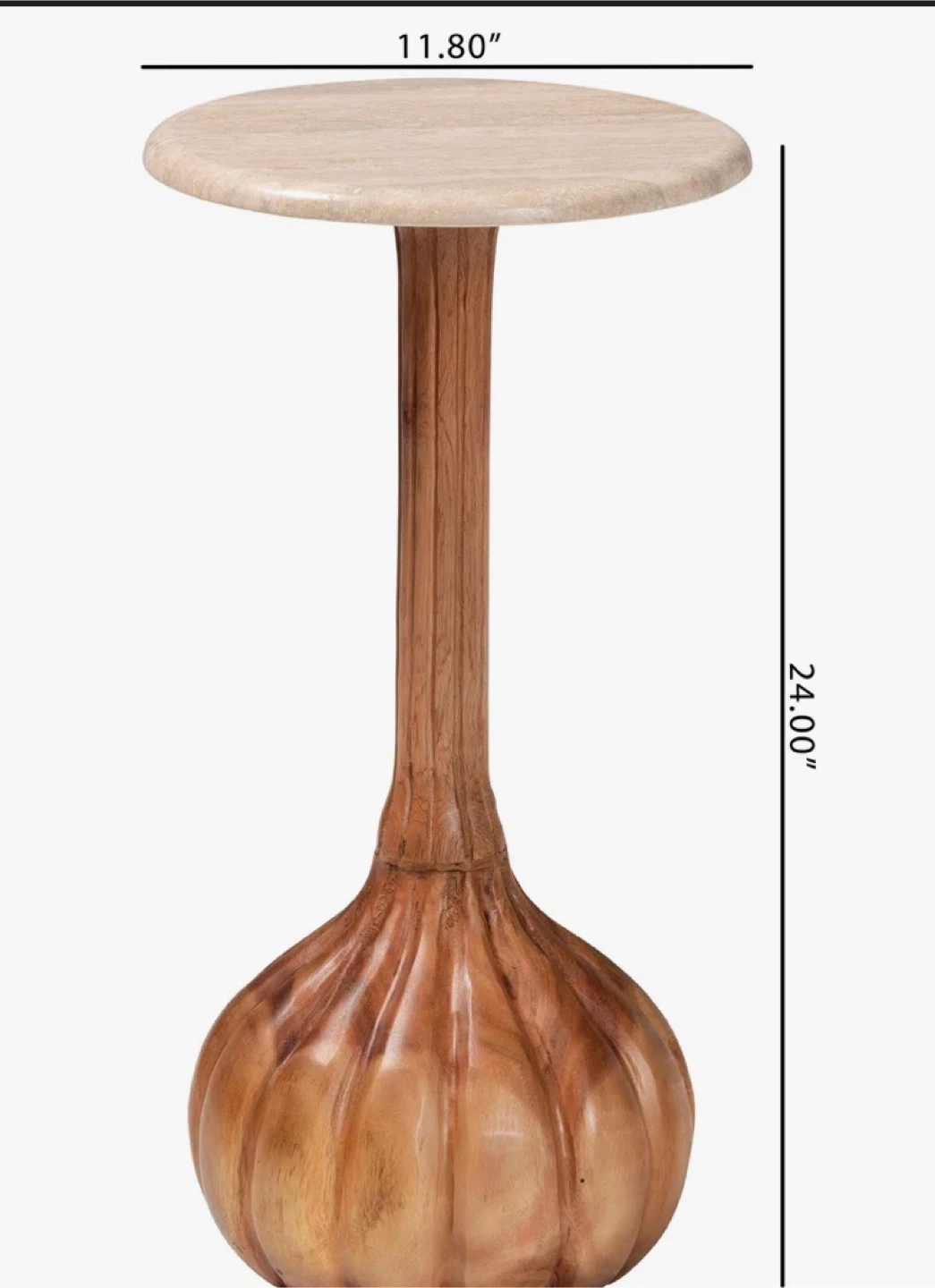This eye-catching side table features a marble top and a carved wooden base shaped like a garlic bulb. It's a unique statement piece for any room. The table is approximately 22 inches tall with a 12-inch diameter top.