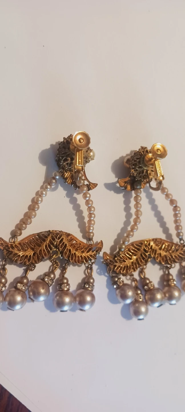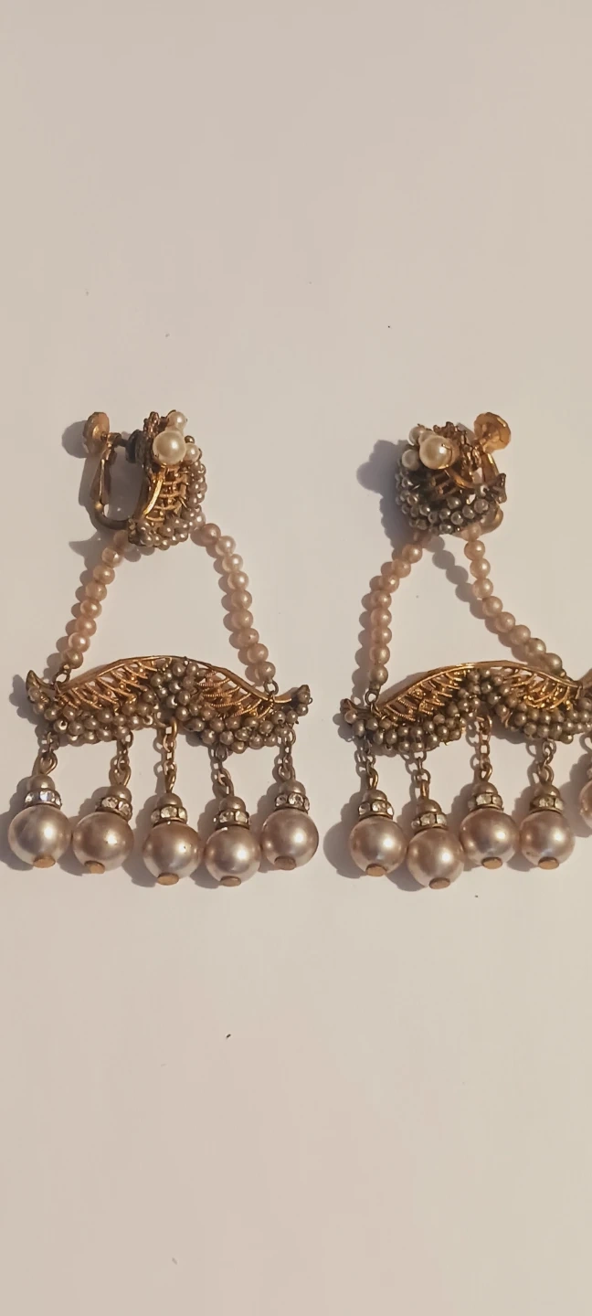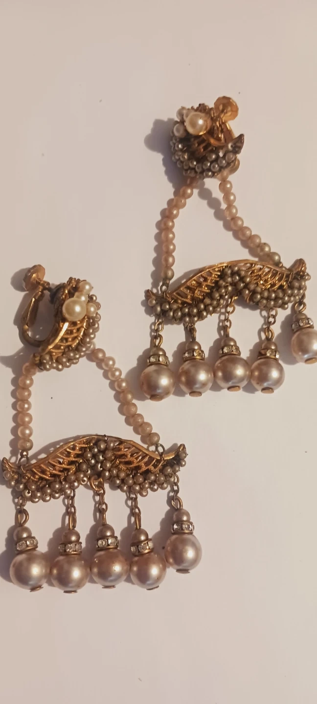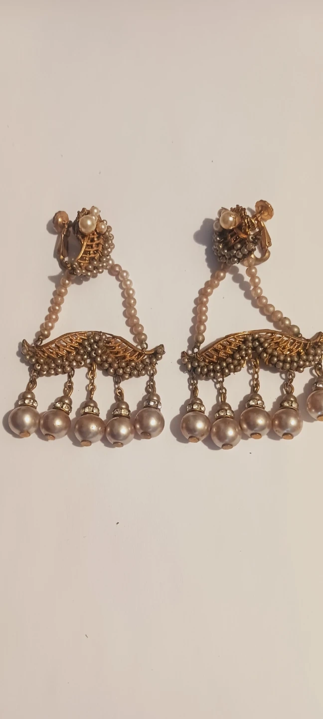 VERY RARE COLLECTIBLE ANTIQUE 1930s AUTHENTIC SIGNED MIRIAM HASKELL ICONIC GRANDIOSE BAROQUE PEARLS DANGLING CHANDELIER CLIP-ON EARRINGS. These are beautiful vintage clip-on earrings. They feature Baroque pearls, small beads, and rhinestone accents. The design is intricate and elegant. Excellent condition. 3"×2". ALL MY PRICES ARE NEGOTIABLE !!
