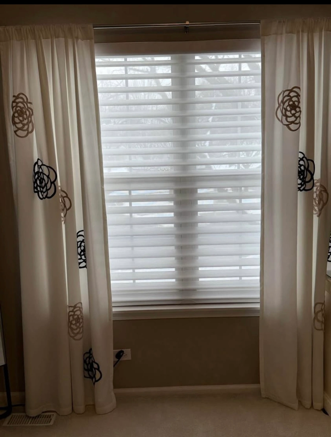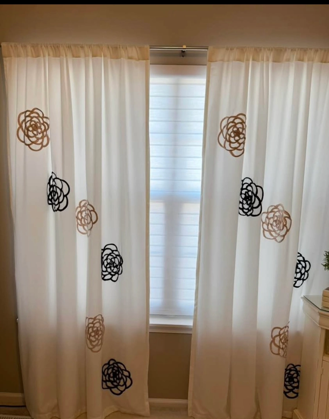 84" fully lined curtain panels (2) Feels like silk but washable Decorative black and taupe appliqués on each white panel for a bit of whimsy and decor Curtain rod ready Very nice window decor for bedroom, family room, office or kitchen Pet free/smoke free home