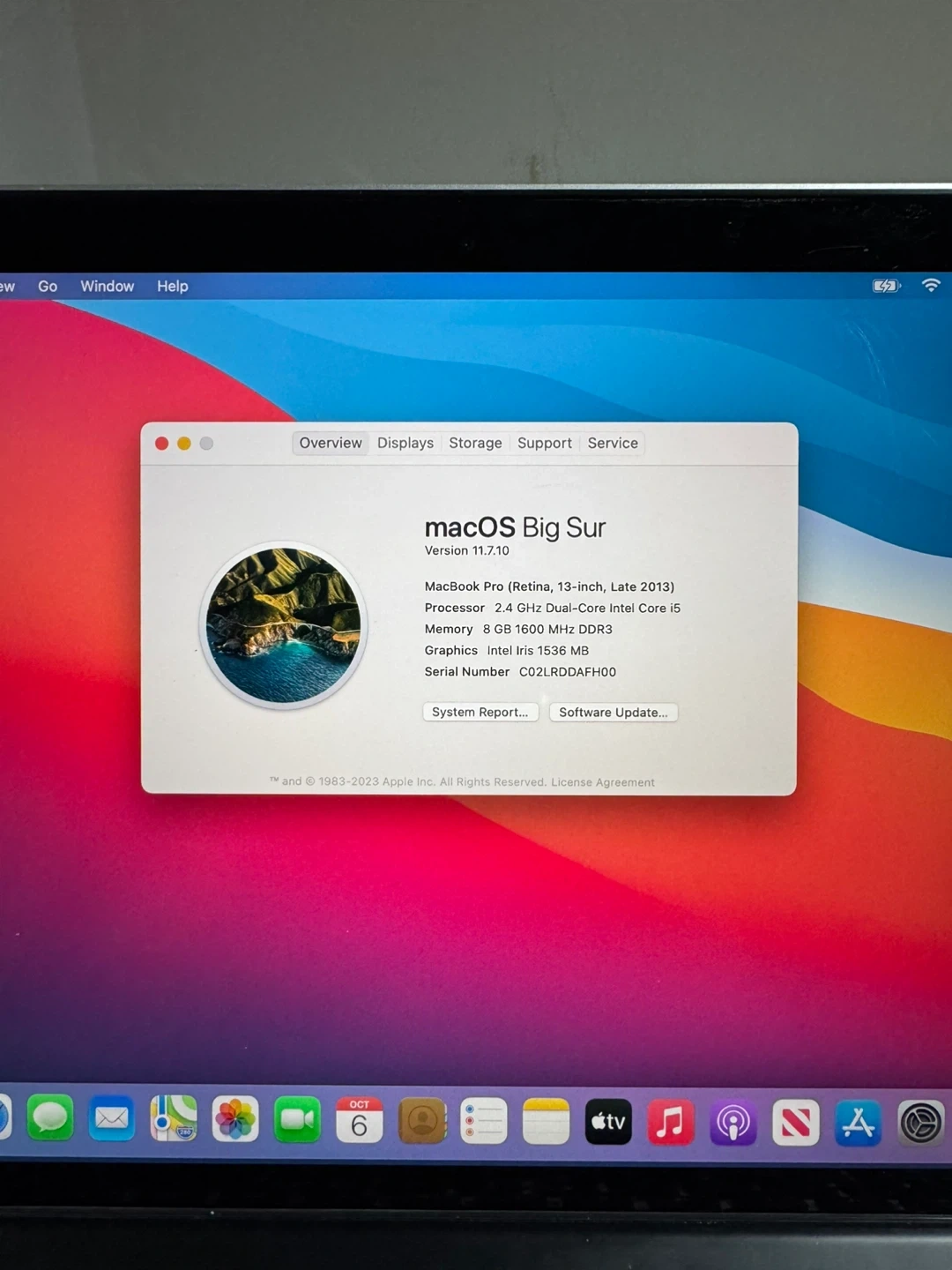 Selling a MacBook Pro (Retina, 13-inch, Late 2013) running macOS Big Sur version 11.7.10 Specs: - Processor: 2.4 GHz Dual-Core Intel Core i5 - Memory: 8 GB 1600 MHz DDR3 - Graphics: Intel Iris 1536 MB - 256 GB Solid State PCI-Express Drive - Serial Number: C02LRDDAFH00 Comes with a charger