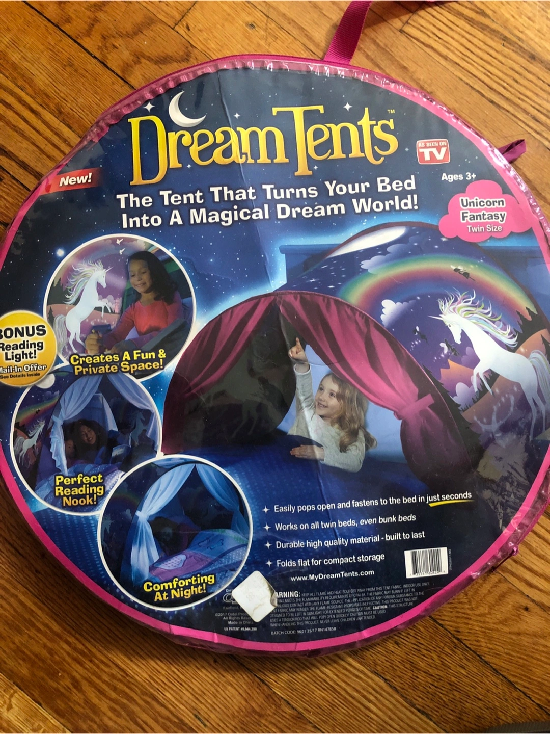 Dream Tents turn your bed into a magical dream world! It easily pops open and fastens to the bed in just seconds. It works on all twin beds, even bunk beds. It's made of durable high-quality material and built to last! Folds flat for compact storage
