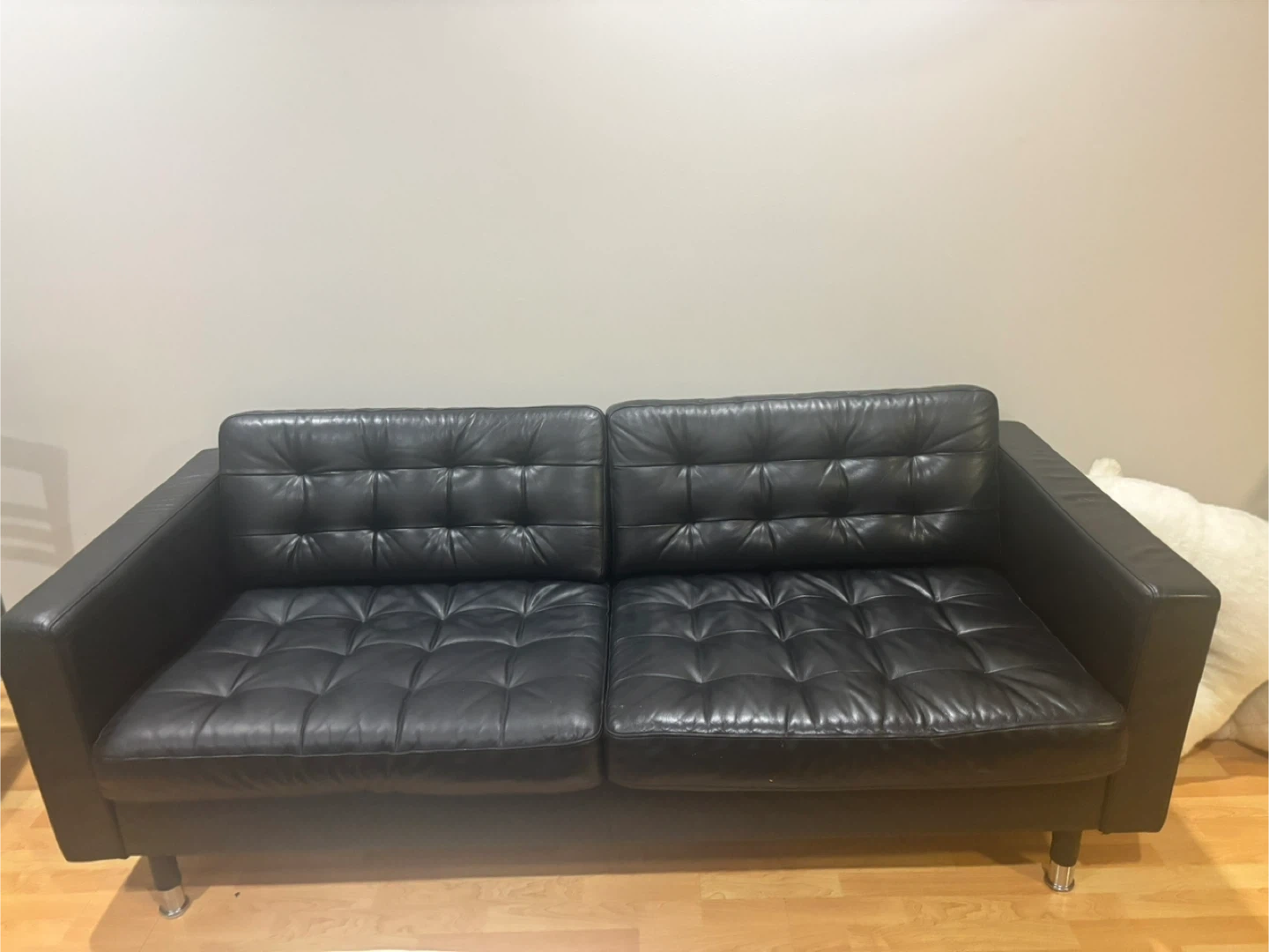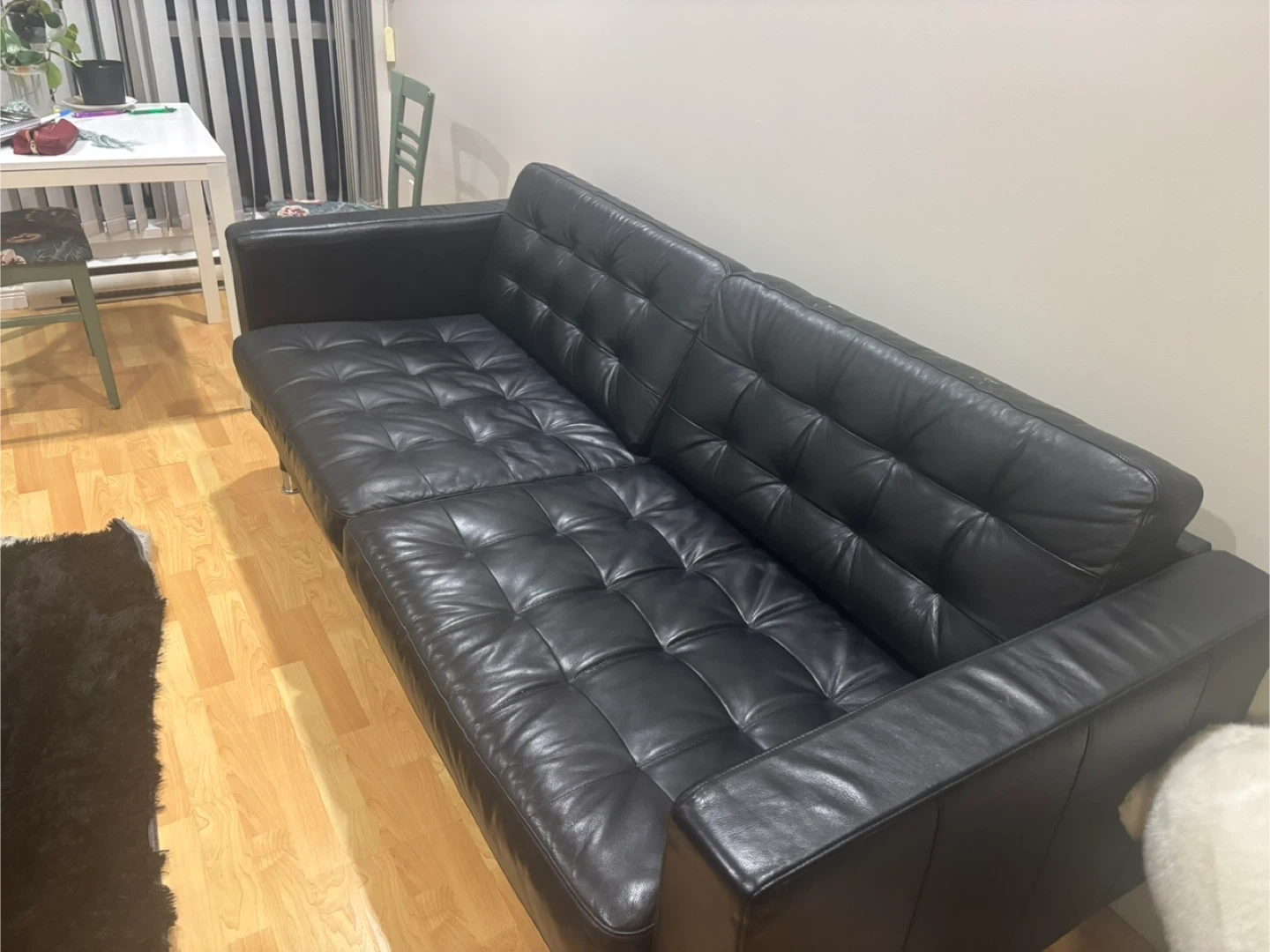 A stylish black leather sofa with deep tufting on the seats and back cushions. It's a comfortable couch with a modern look. Adds a touch of elegance to any living space!