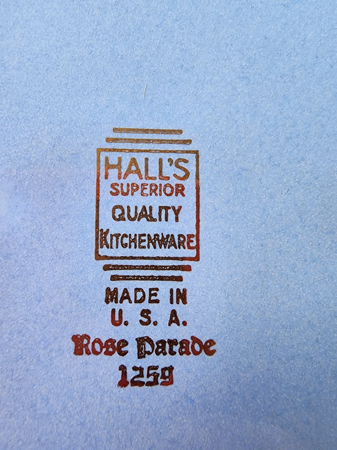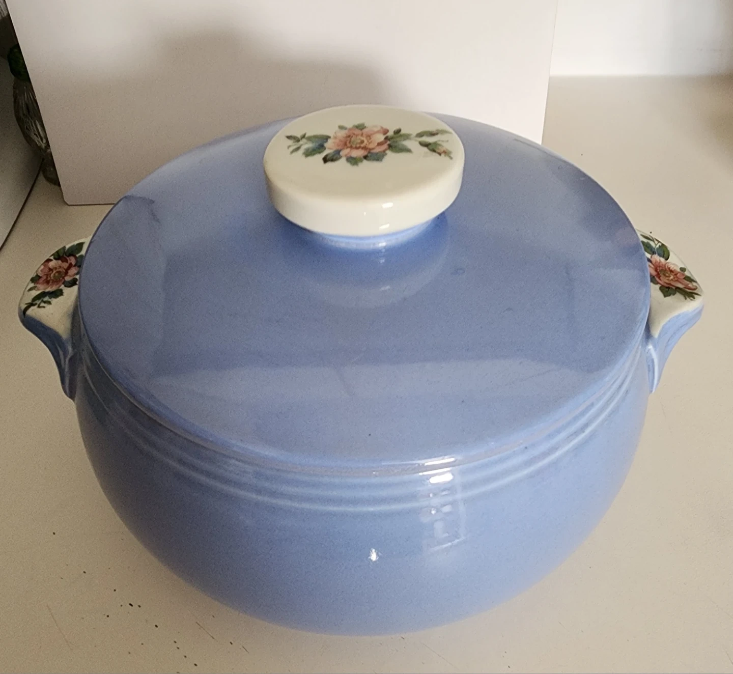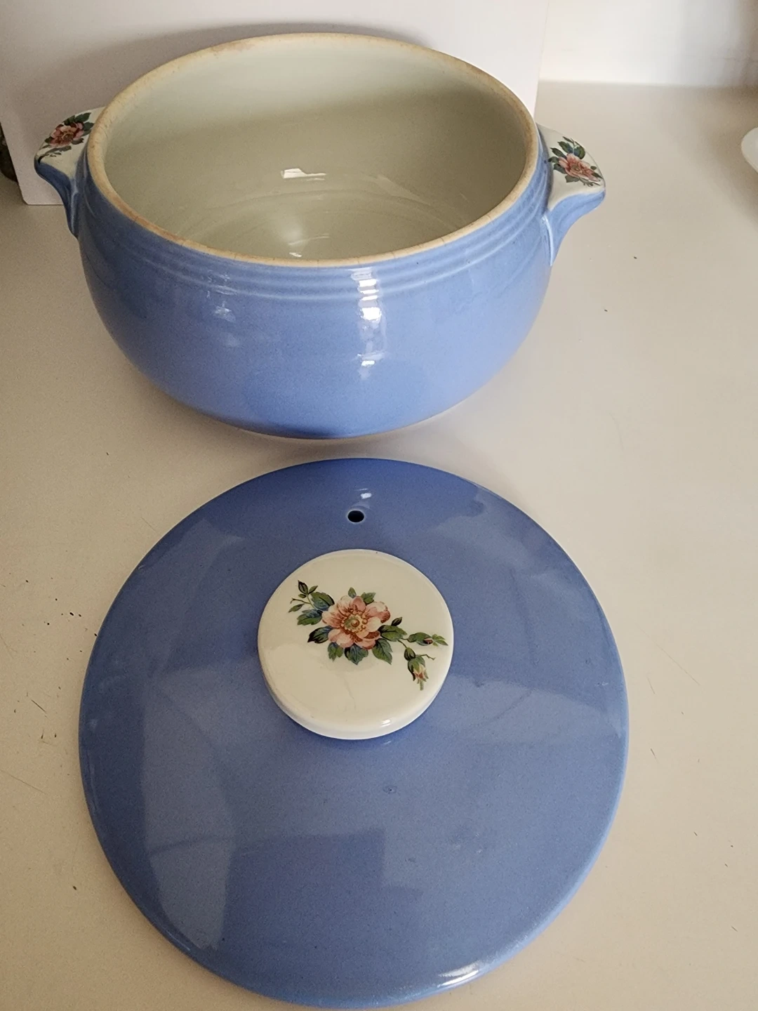 This vintage dish features a lovely blue exterior and a floral Rose design on the lid and handles. It's made in the U.S.A.