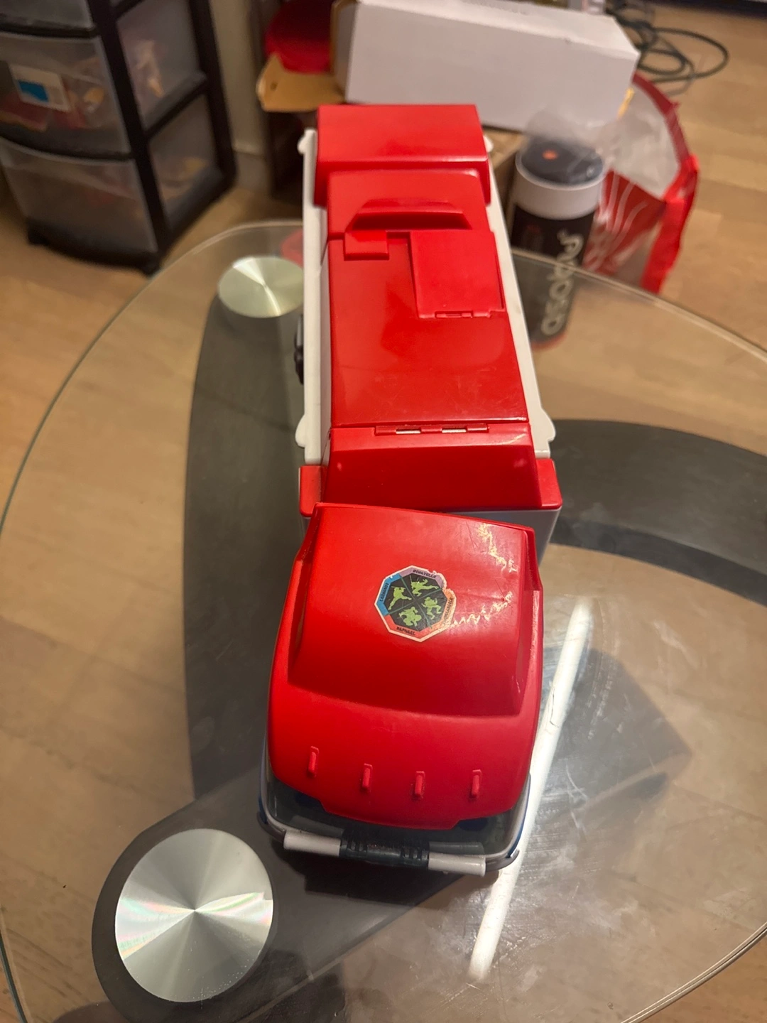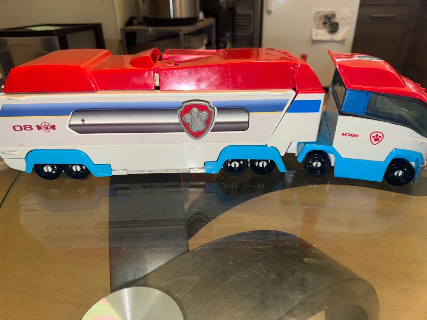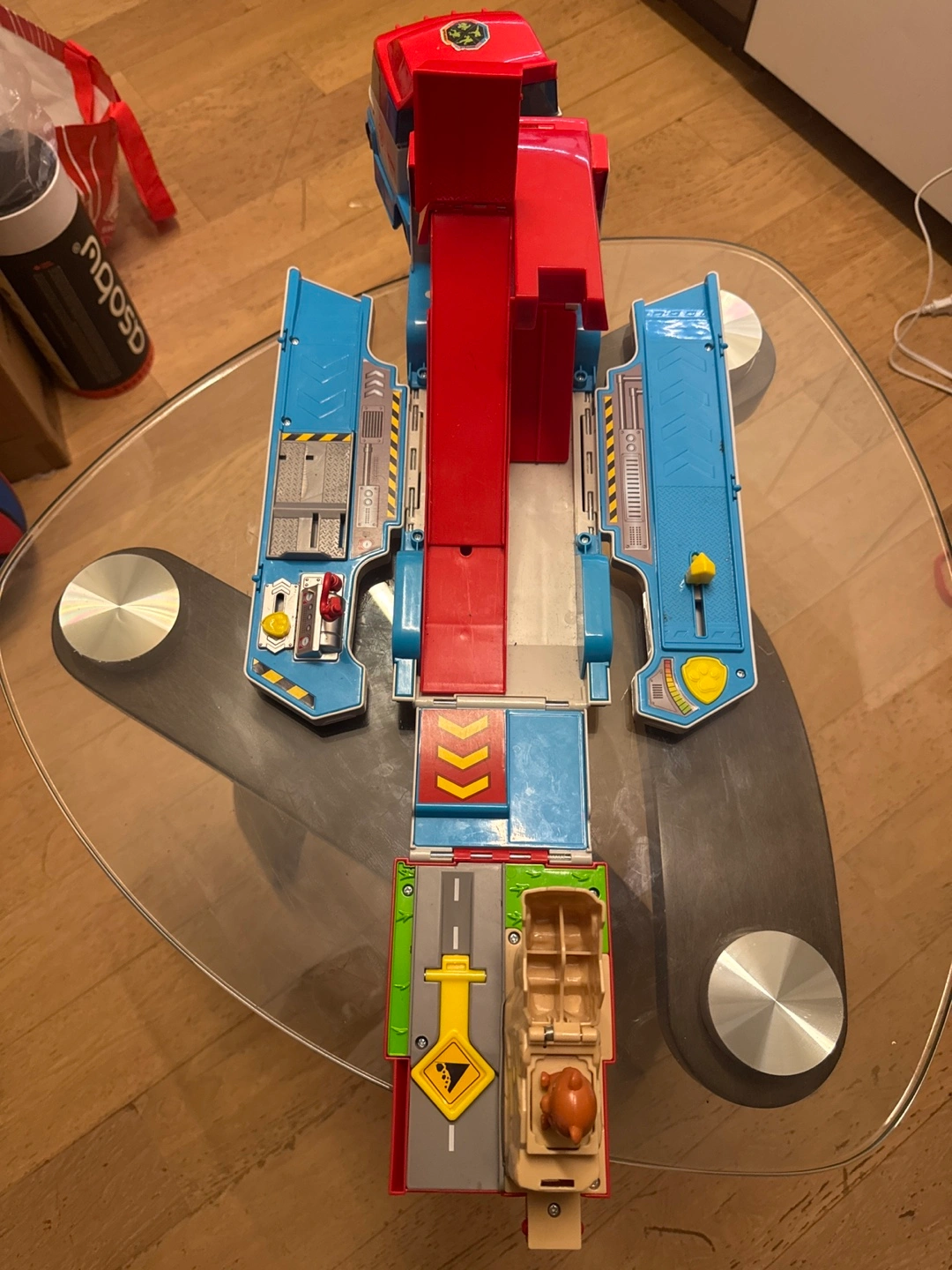 Paw Patrol Ryder's Ultimate Rescue Truck. Features a transforming truck and ramp. Includes small animal figure. Some wear and tear.