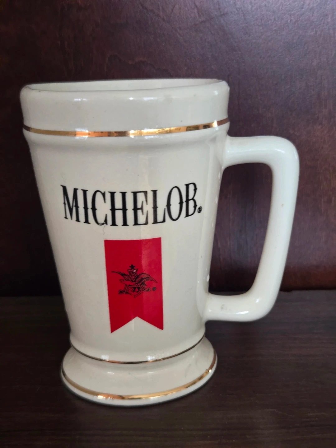 Vintage white ceramic beer mug with Michelob branding and gold trim. It's a sturdy mug perfect for enjoying your favorite beverages.