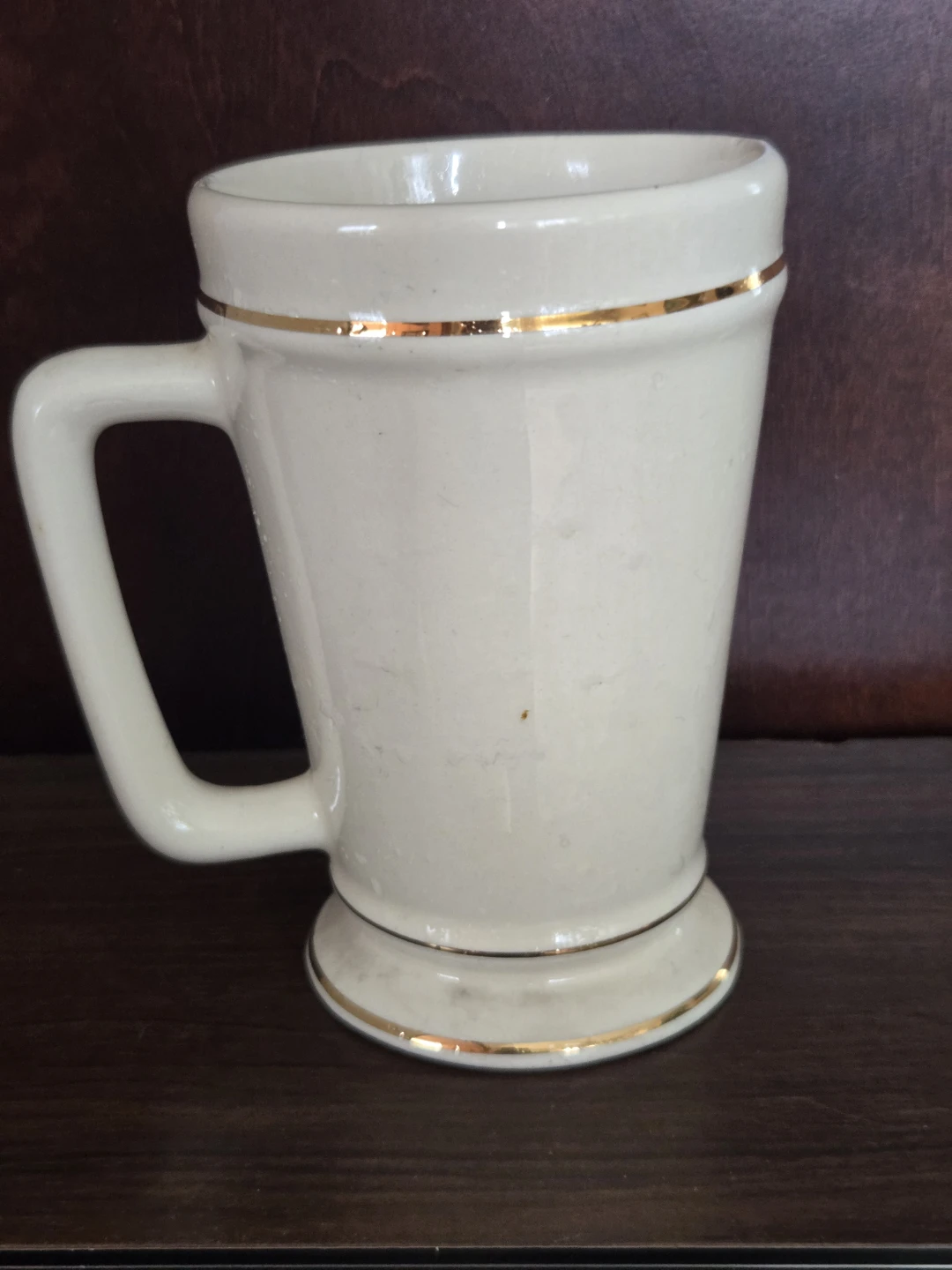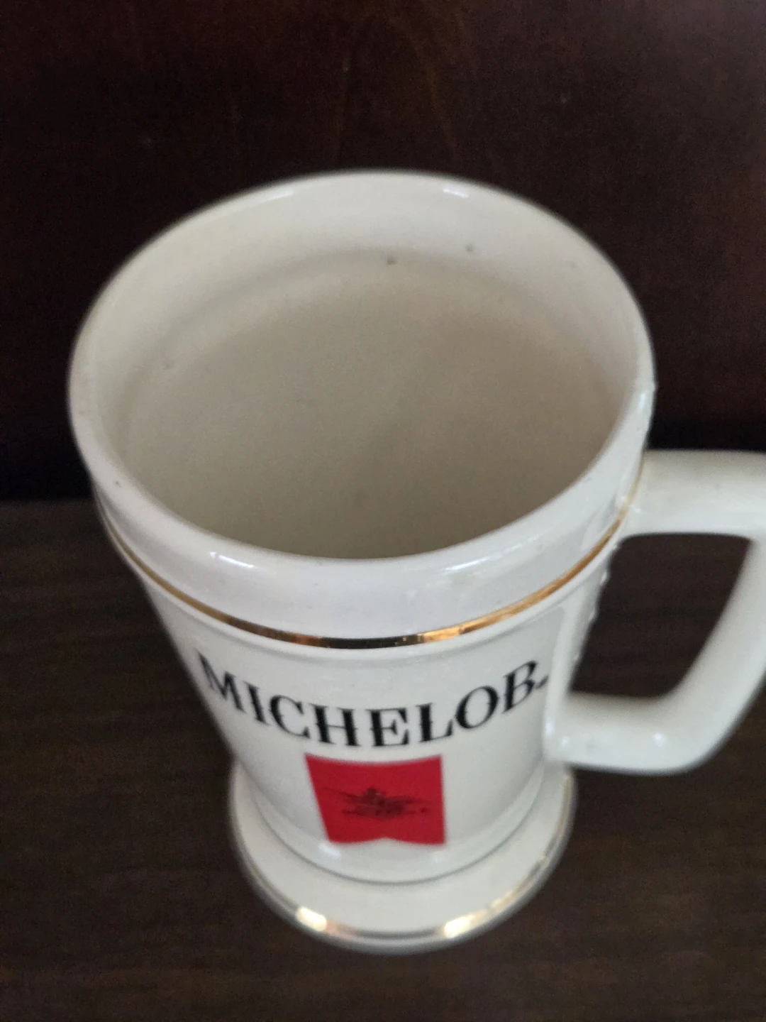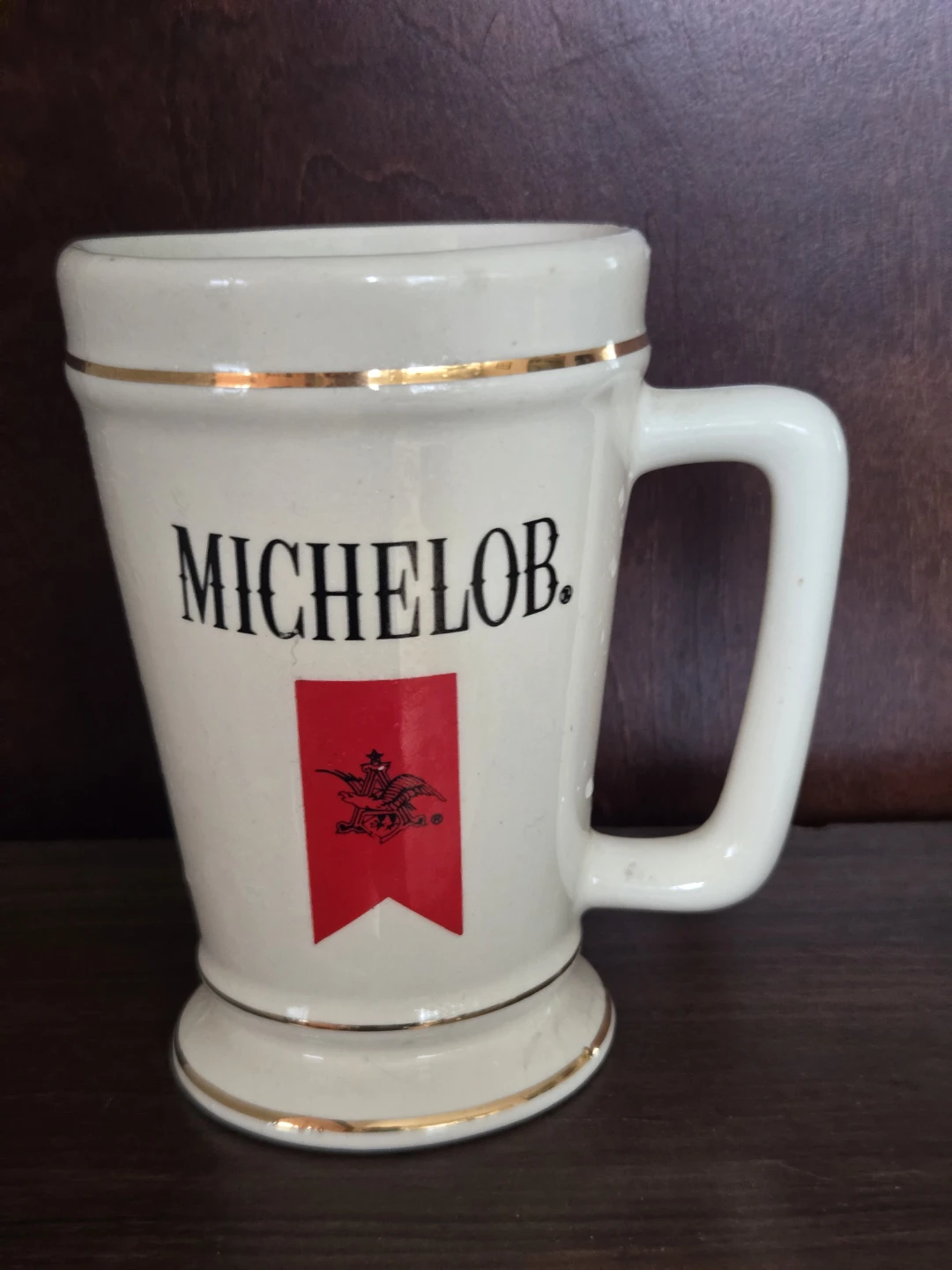 Vintage white ceramic beer mug with Michelob branding and gold trim. It's a sturdy mug perfect for enjoying your favorite beverages.