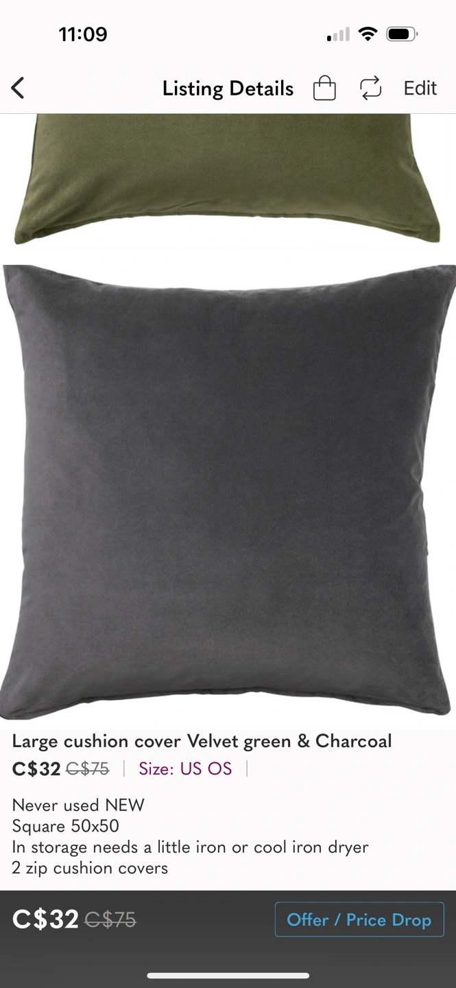 2 Large square cushion covers. Velvet fabric. Green and charcoal. Never used,