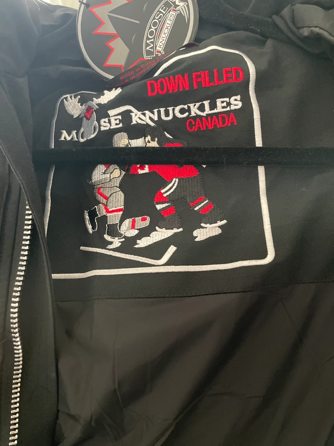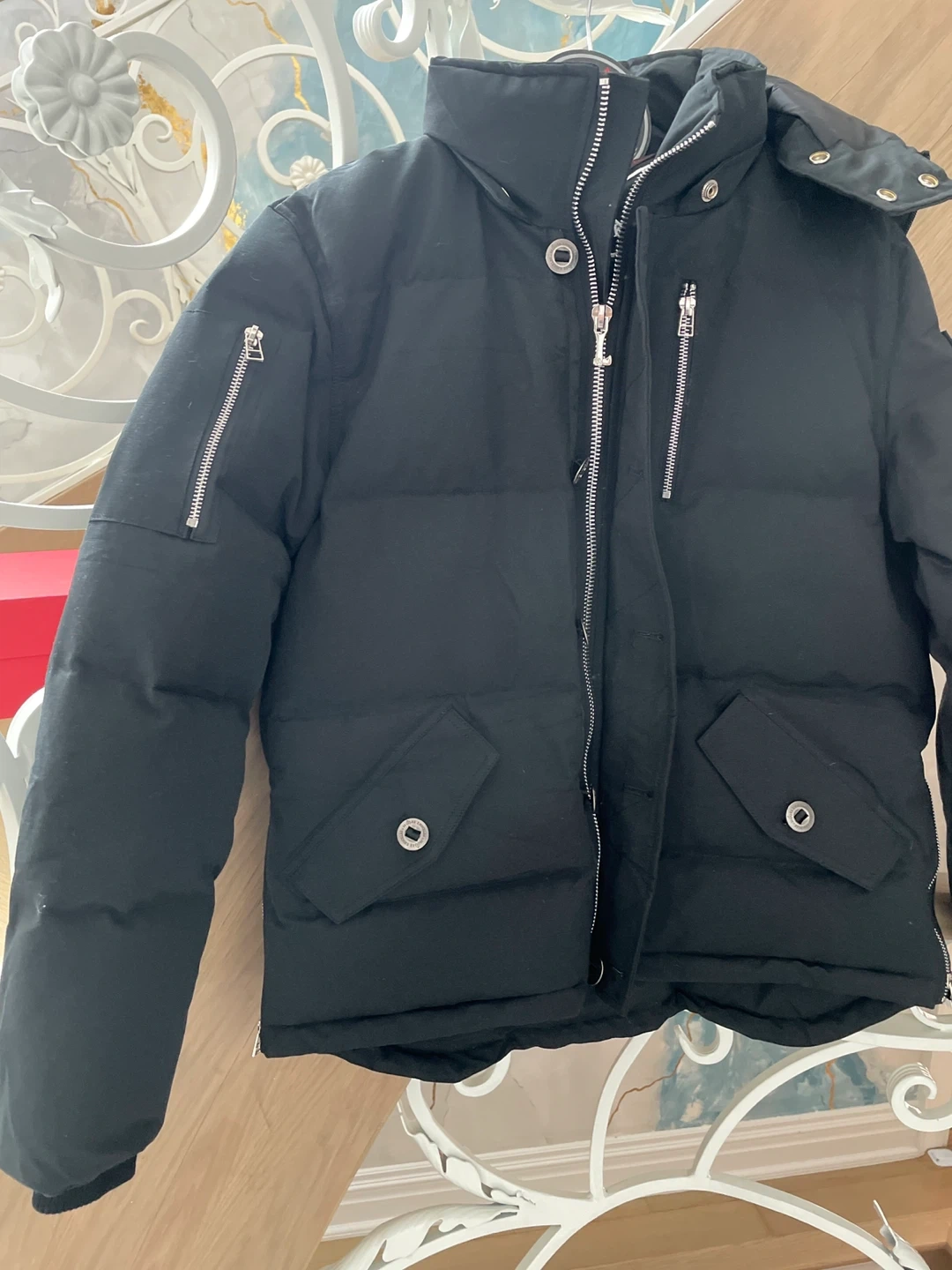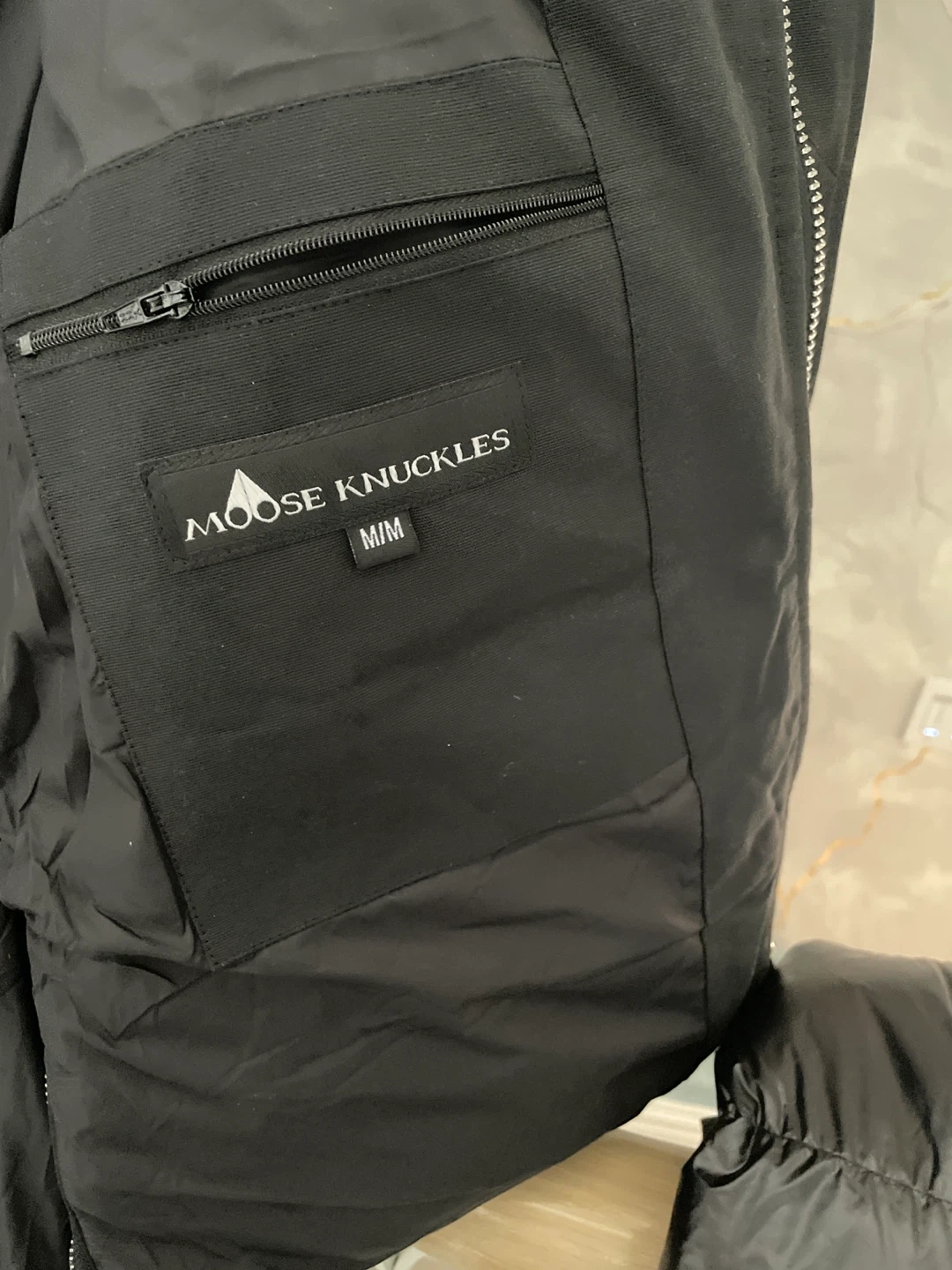 This Moose Knuckles puffer jacket is down-filled and black. It's a size medium/medium. The jacket features a hood and multiple zippered pockets. (This jacket for up to 5.7 ht , arm length up to 32 -33)