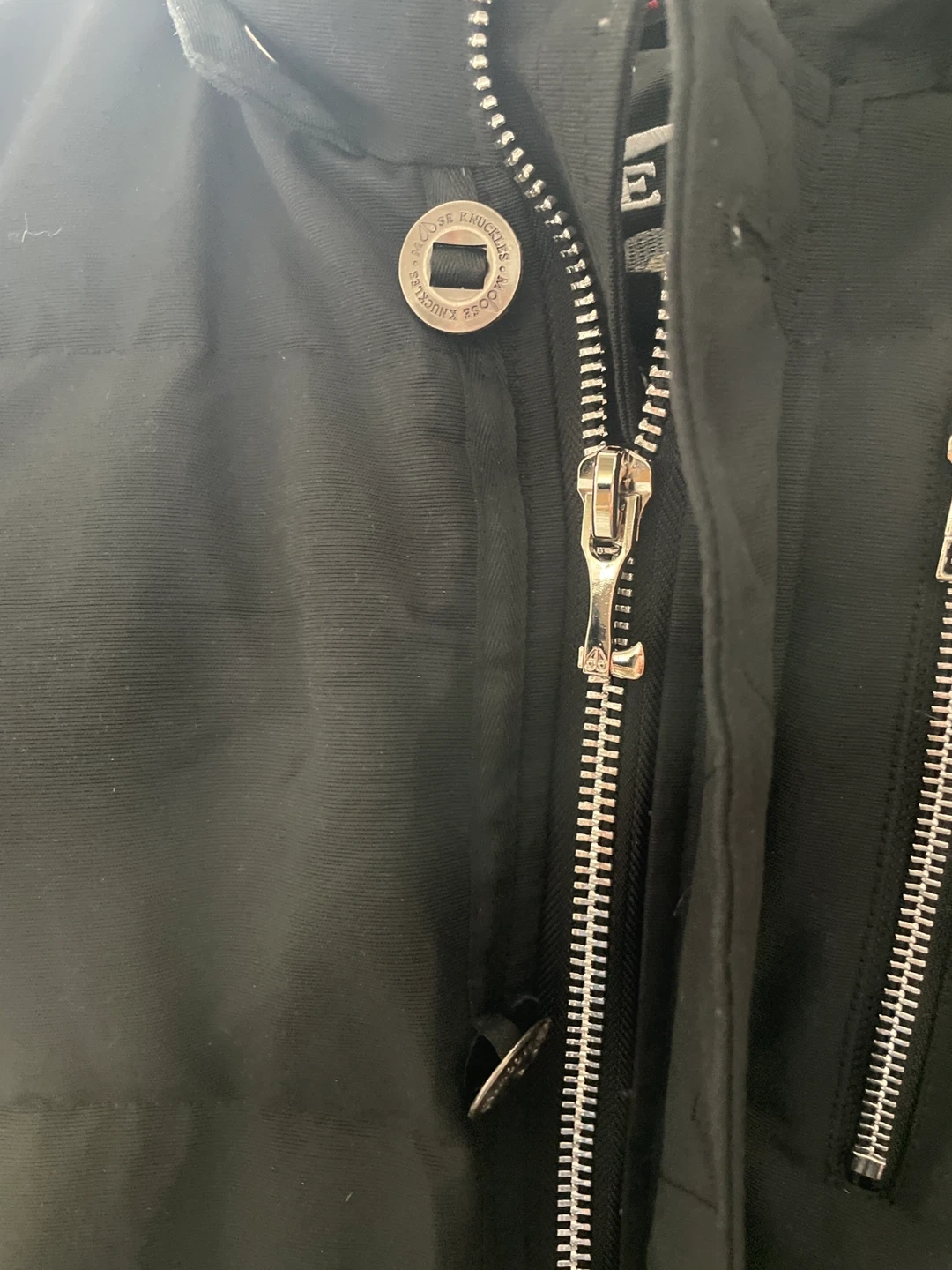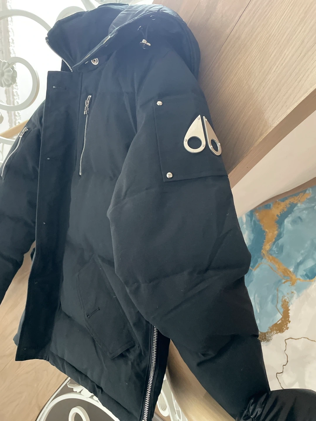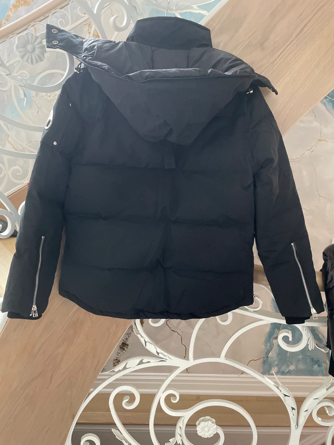 This Moose Knuckles puffer jacket is down-filled and black. It's a size medium/medium. The jacket features a hood and multiple zippered pockets. (This jacket for up to 5.7 ht , arm length up to 32 -33)