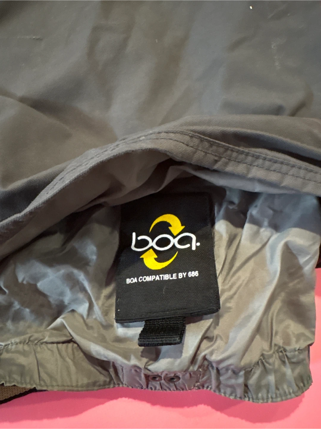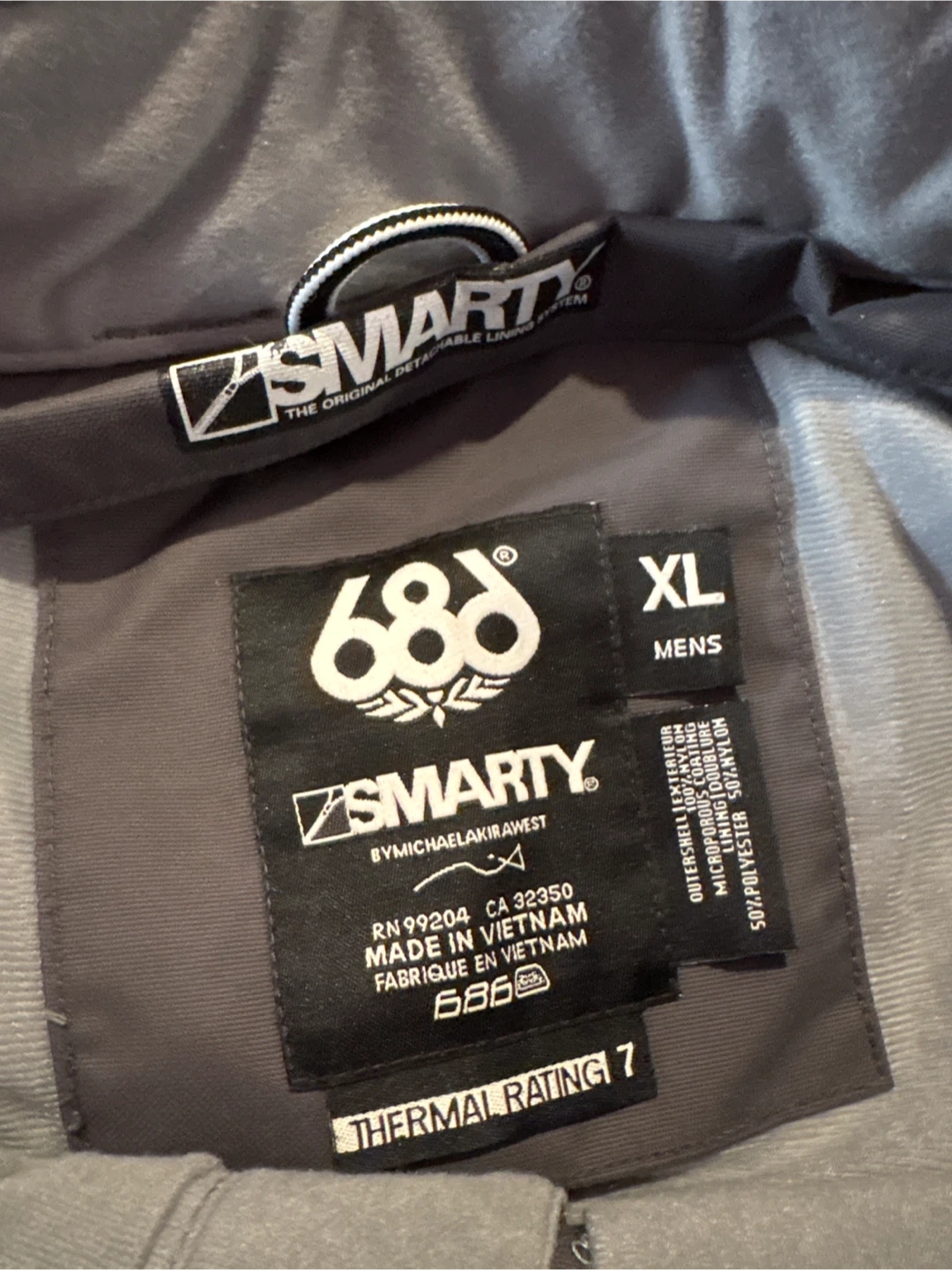 Men's 686 ski or snowboard pants in size XL. Features include BOA compatibility and a removable Smarty lining. Oute shell is 100% polyester with a 50% polyester, 50% nylon lining. Thermal rating of 7.