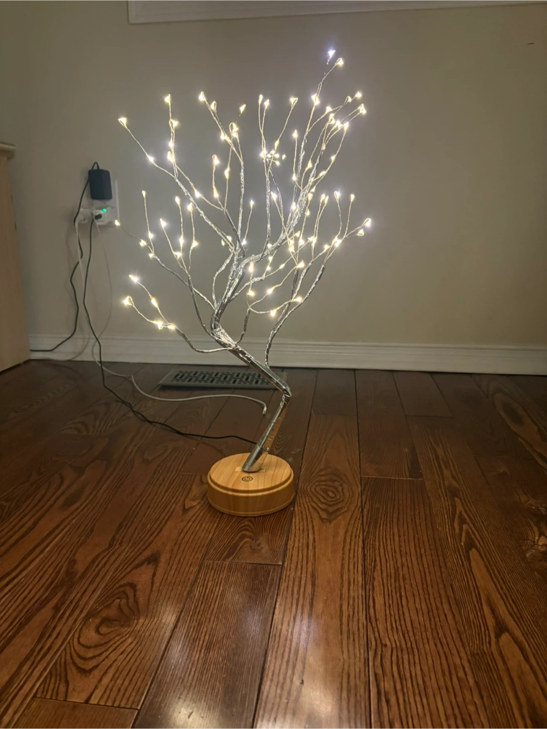 This decorative LED light tree features a whimsical design with numerous small, bright lights. It's powered by a USB cable and has a natural wood-toned base. Add a cozy glow to any room!