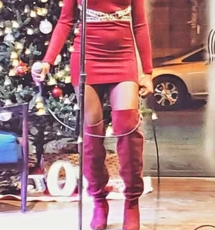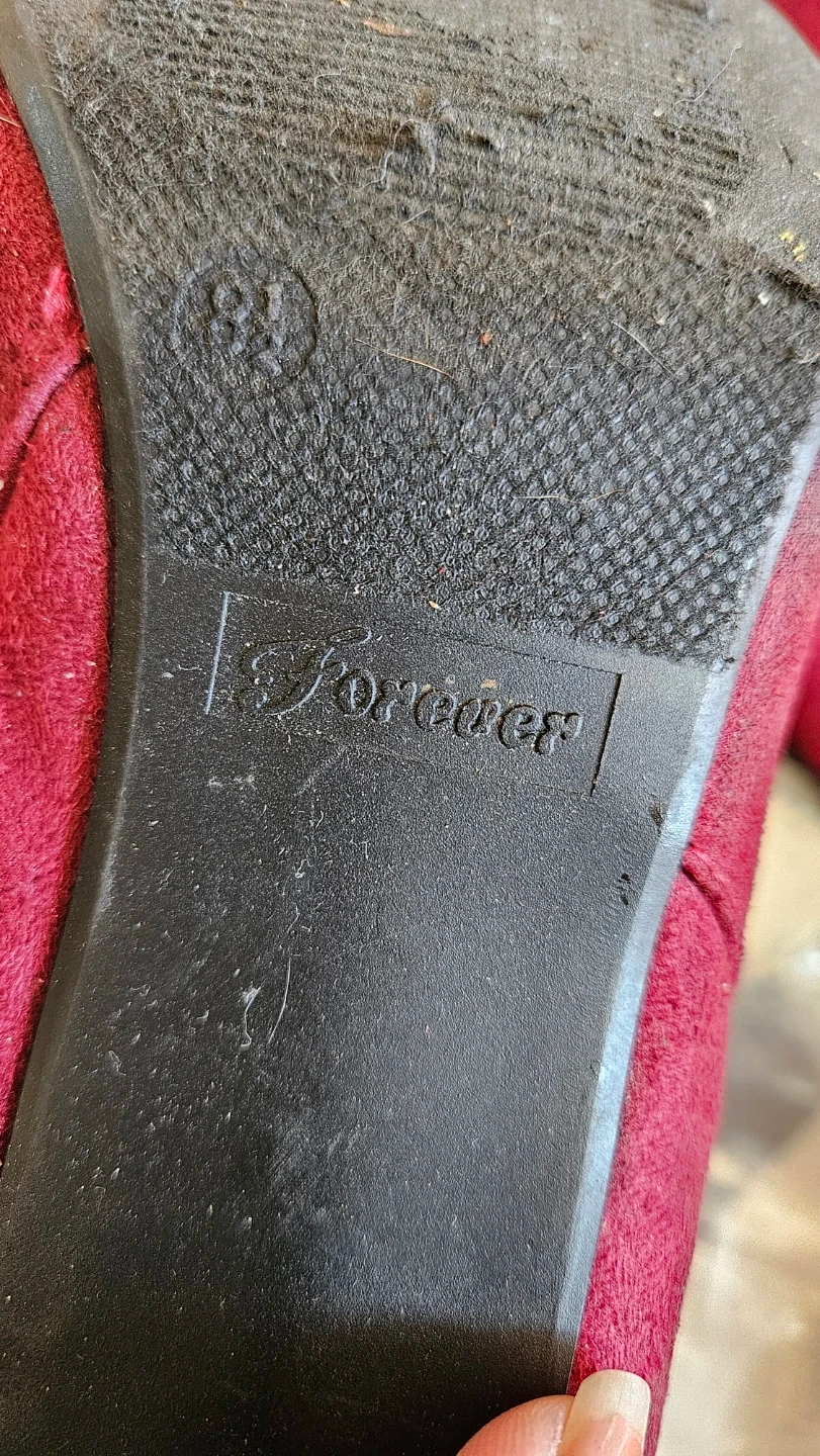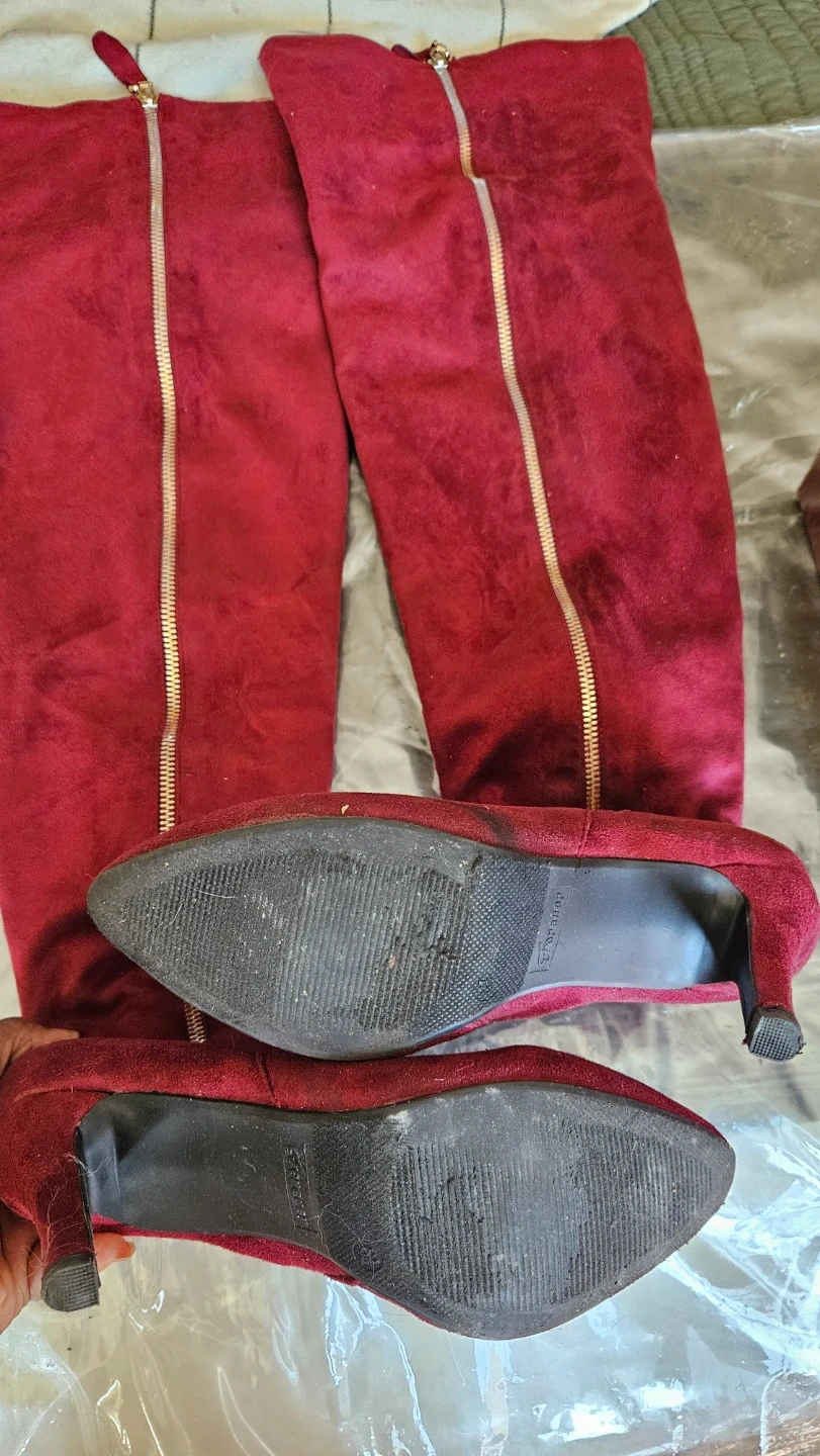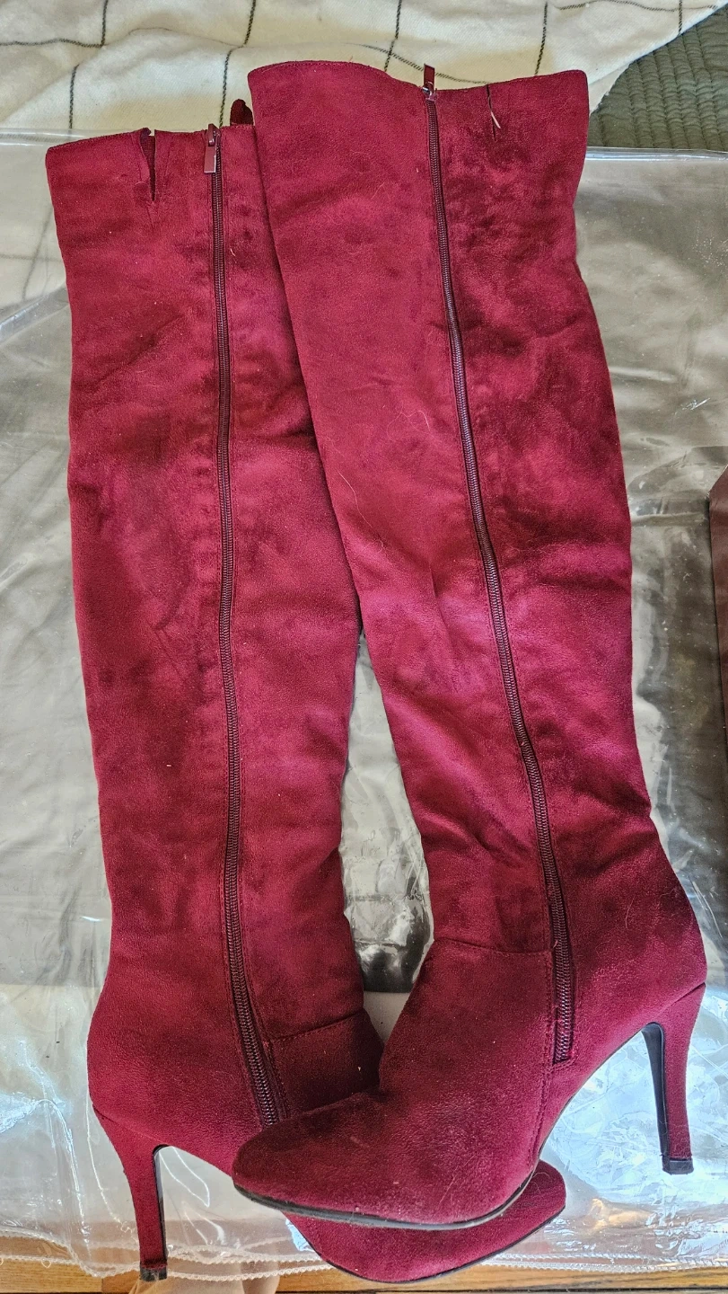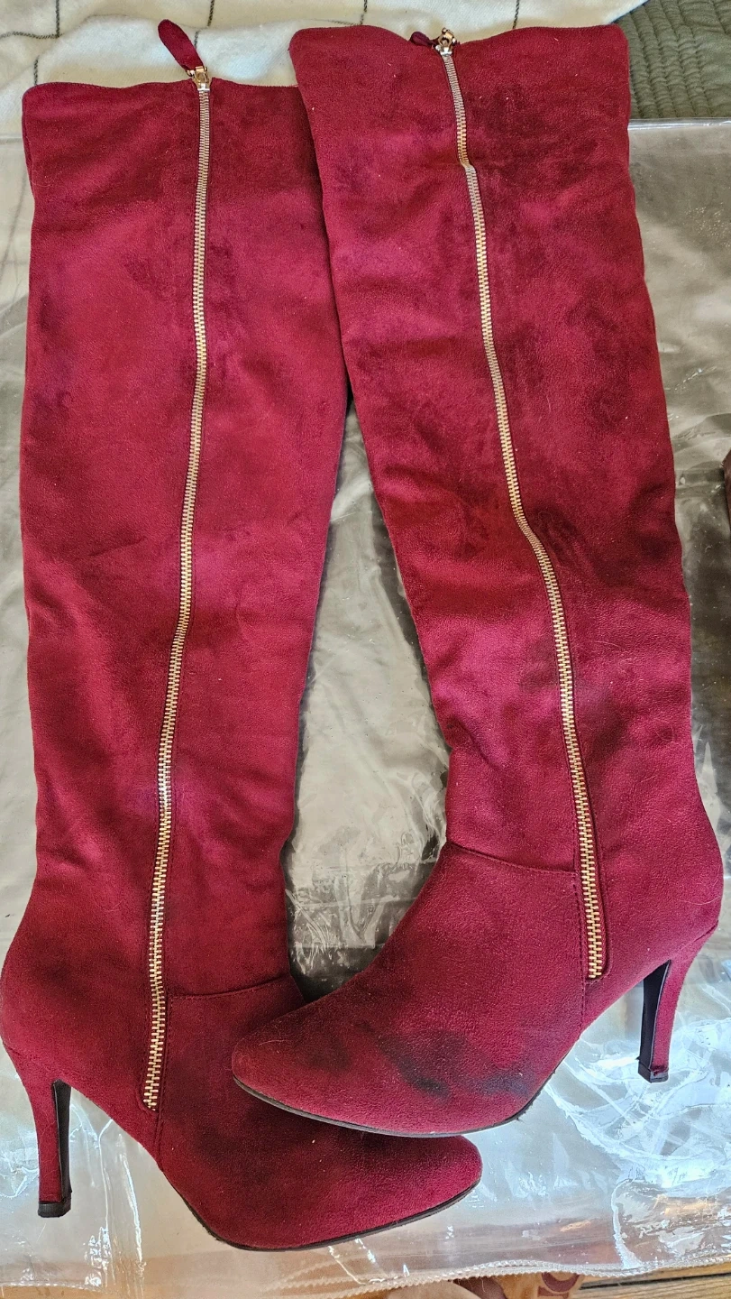These red over-the-knee boots are made from a soft suede-like material. They feature a side zipper for easy on and off. The heel height appears to be around 3 inches. These boots would be great for fall and winter outfits!