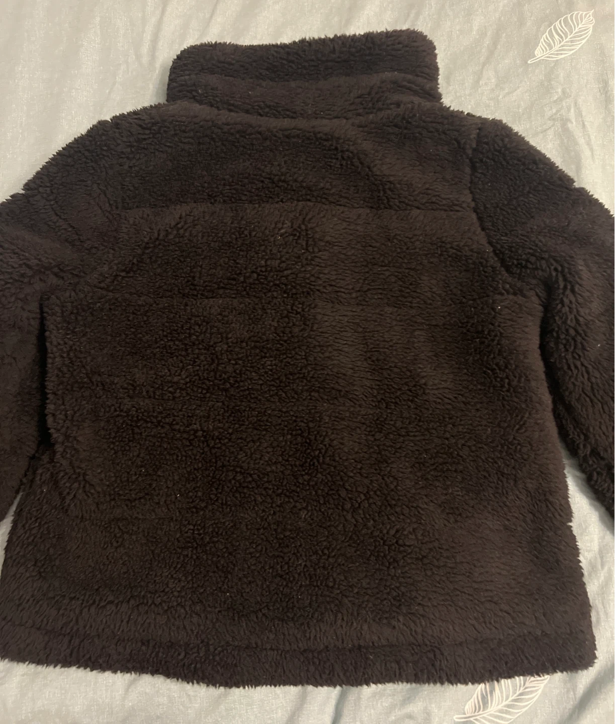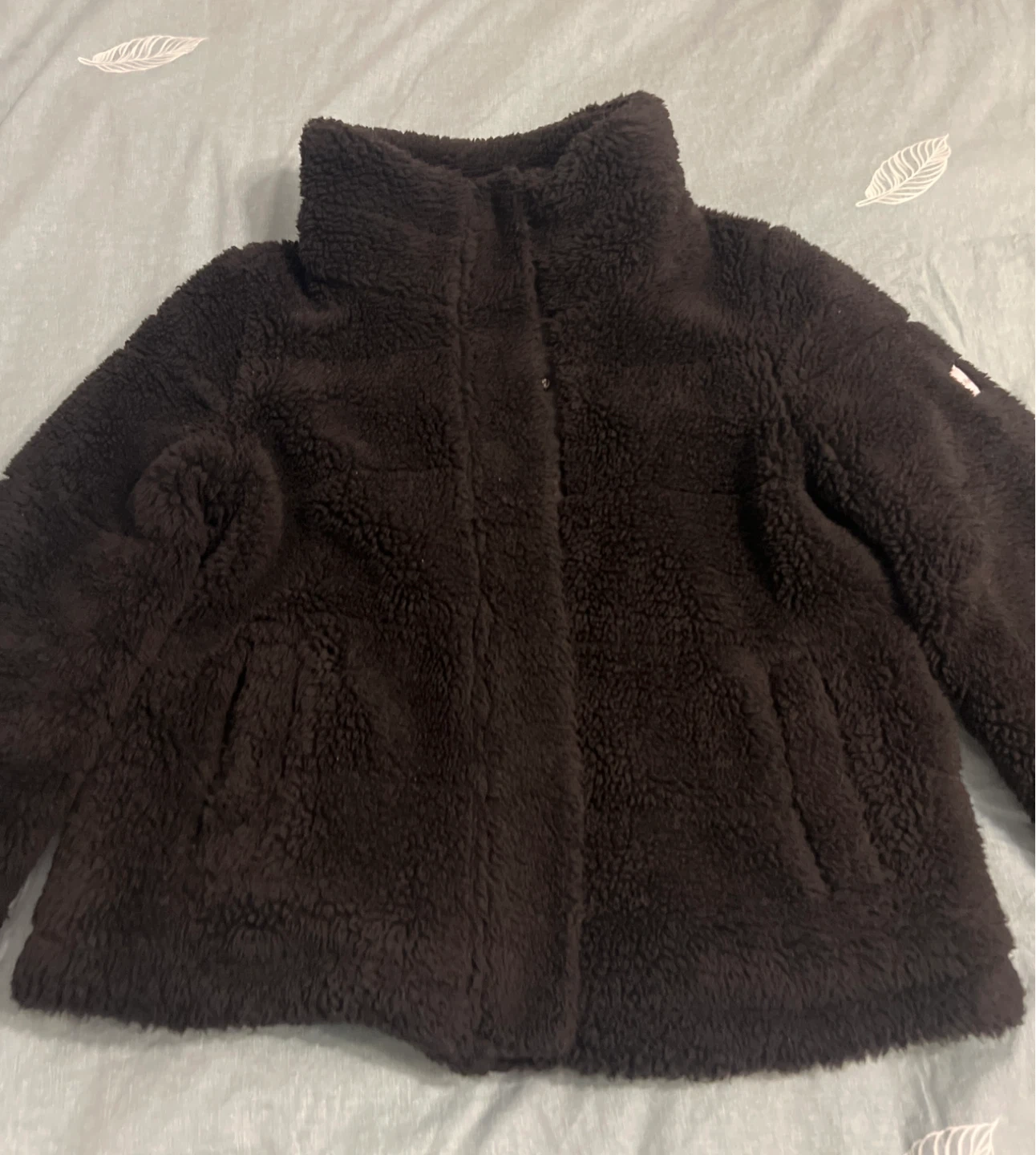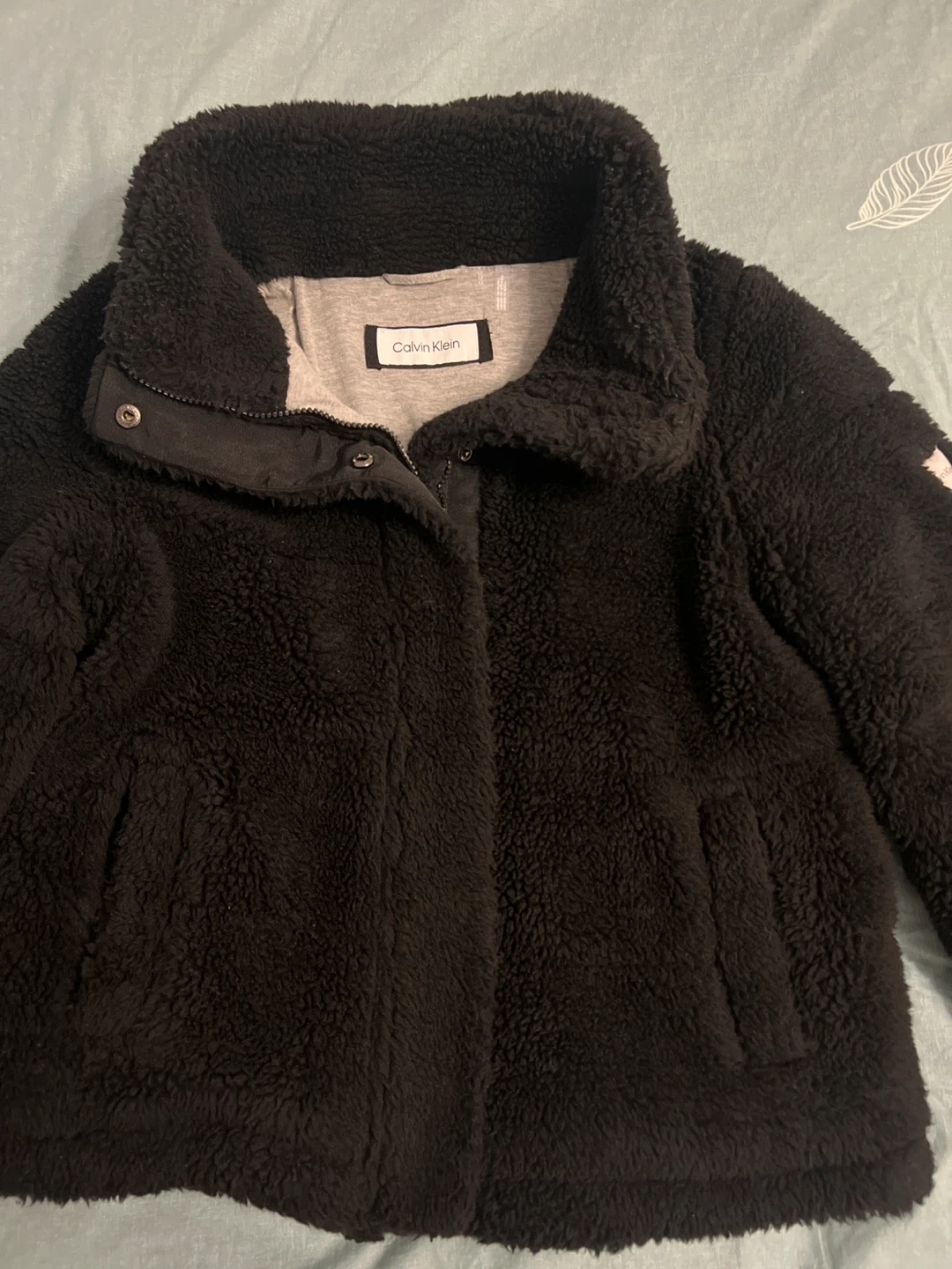 Here's a cozy black sherpa jacket from Calvin Klein! It's perfect for staying warm and stylish. The material is soft and plush, making it super comfortable to wear. It's in great condition and ready for a new home!