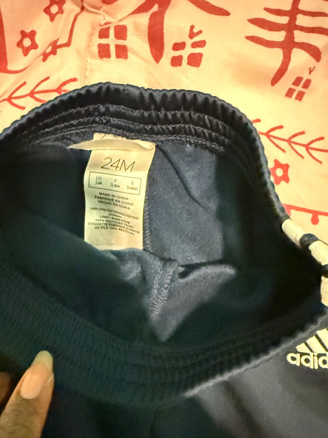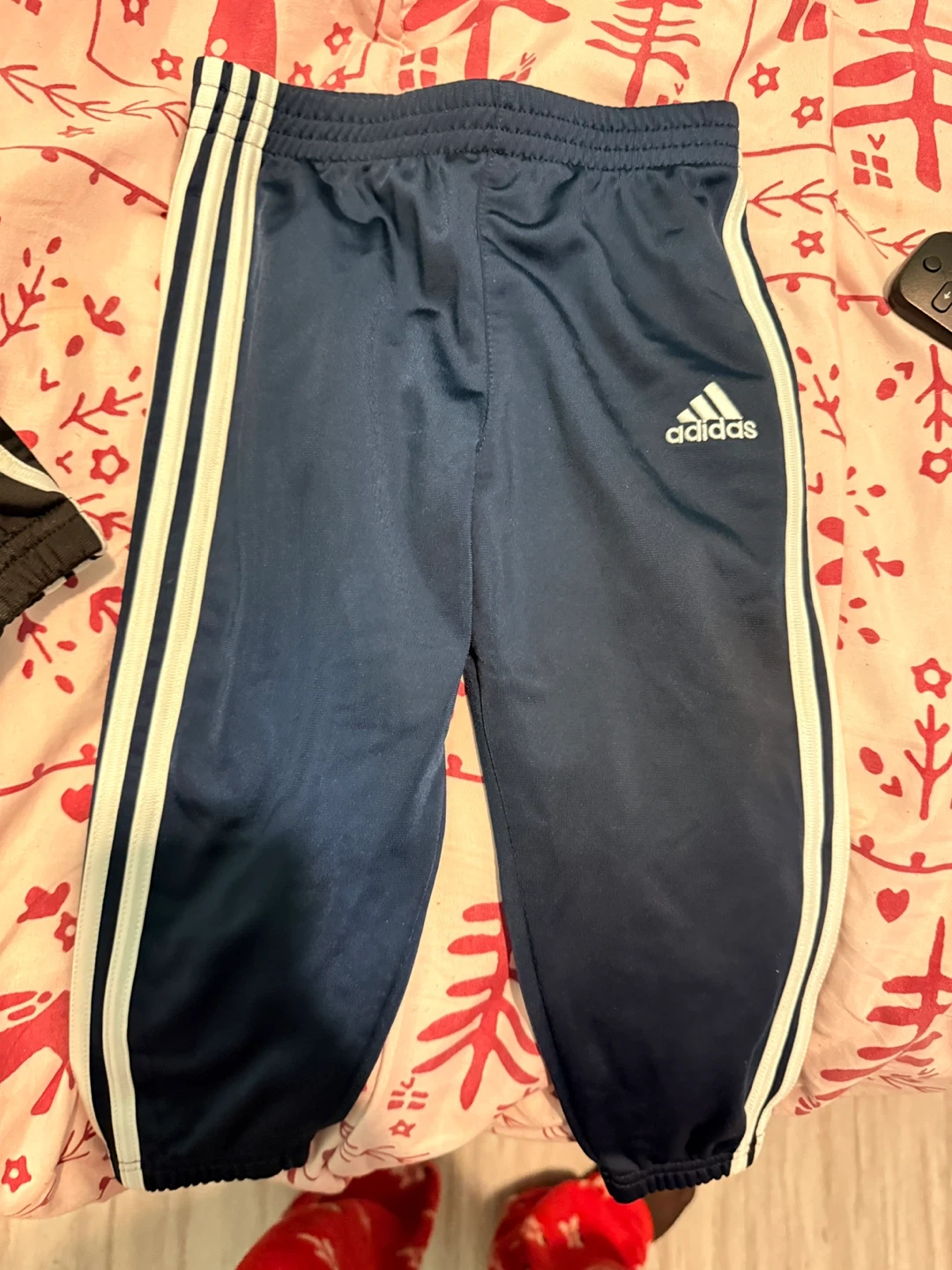 Navy blue Adidas track pants for kids. Size 24 months. Features the classic three stripes down the sides. Made with a blend of polyester and recycled polyester.