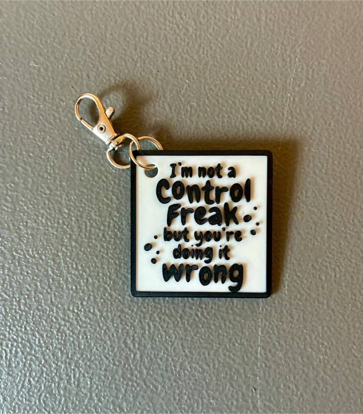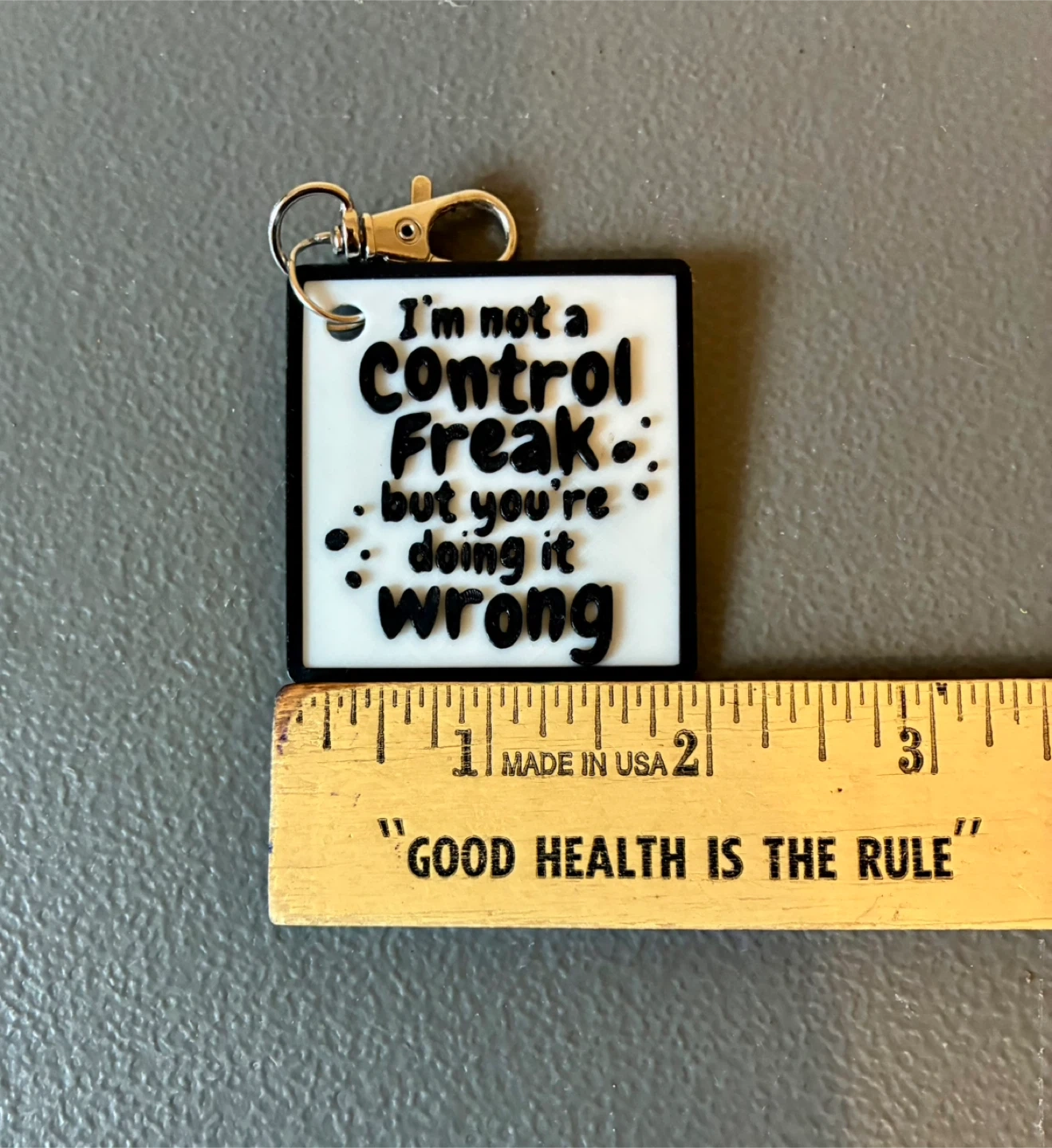 This square keychain features a humorous quote: 'I'm not a Control Freak...but you're doing it wrong'. It's attached to a silver-tone clip and ring. It weighs 0.2 oz and is made of a durable material.