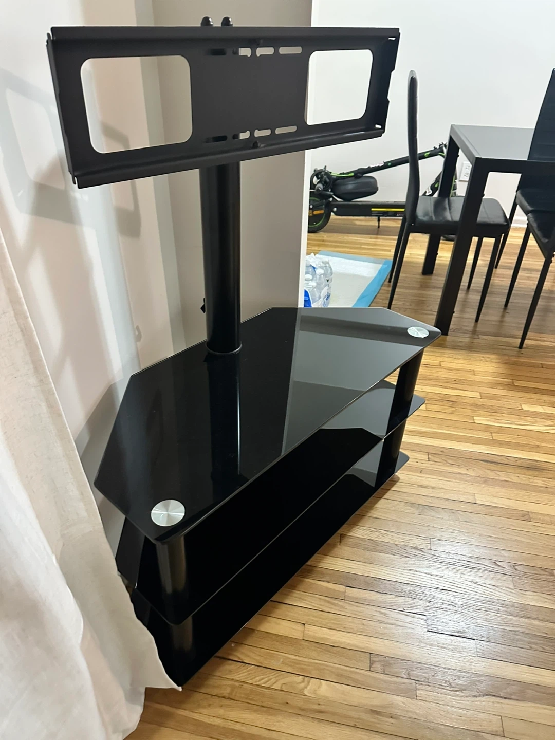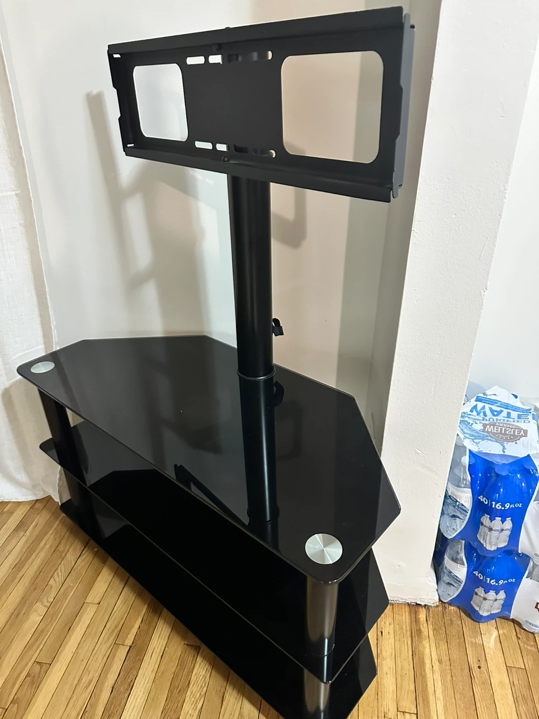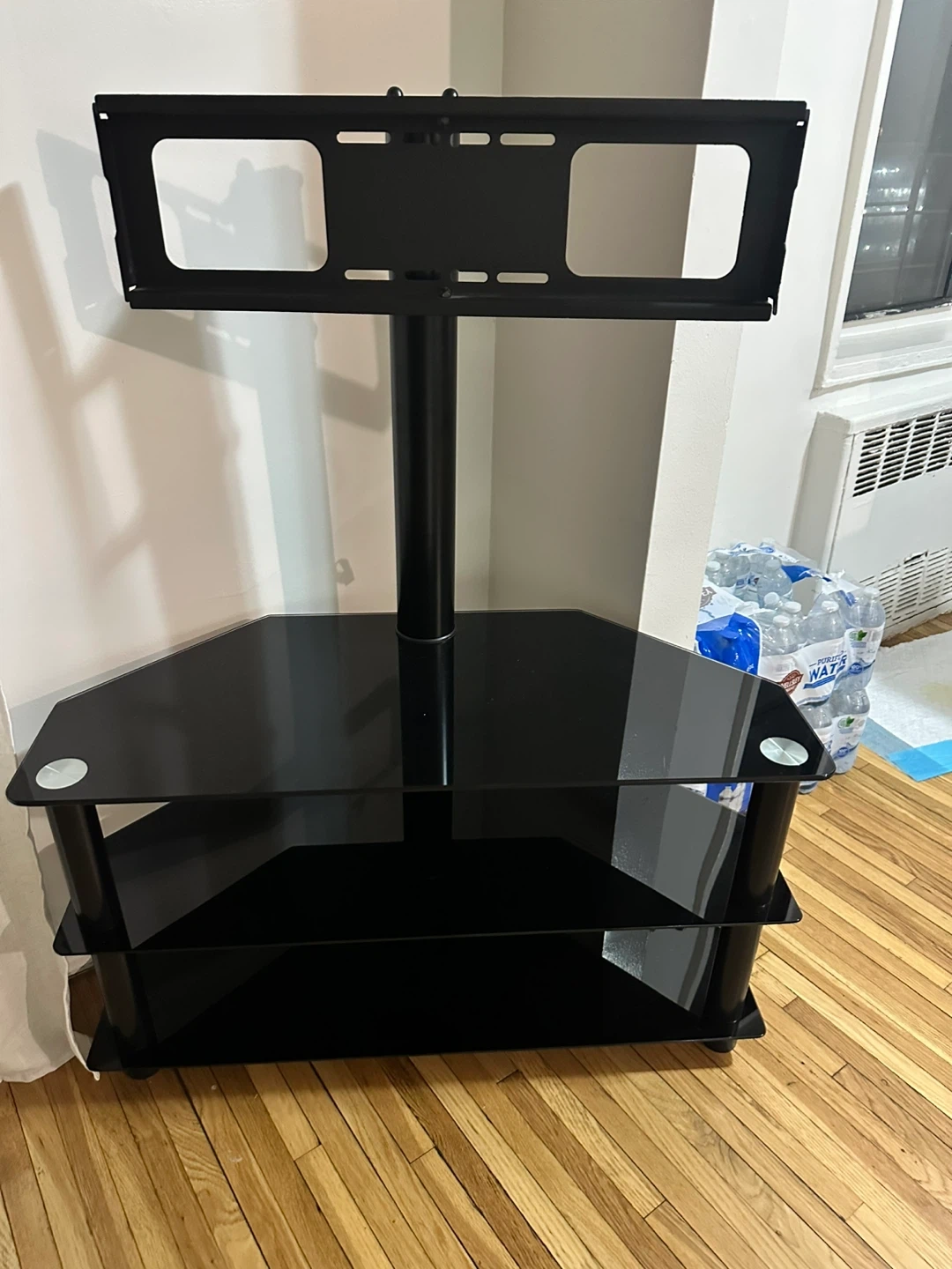 This is a black glass TV stand featuring a mount for your television. It has three tiers for media components. The stand is made of glass and metal. Zona Flushing como nuevo