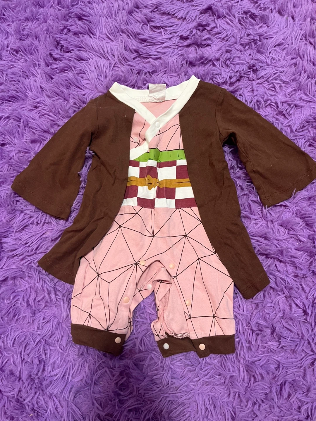 This baby romper is designed to look like Nezuko Kamado's outfit. It features a pink and black geometric pattern on the lower part and a brown jacket overlay with a checkered pattern and bamboo detail on the collar. It has snap closures for easy changing.