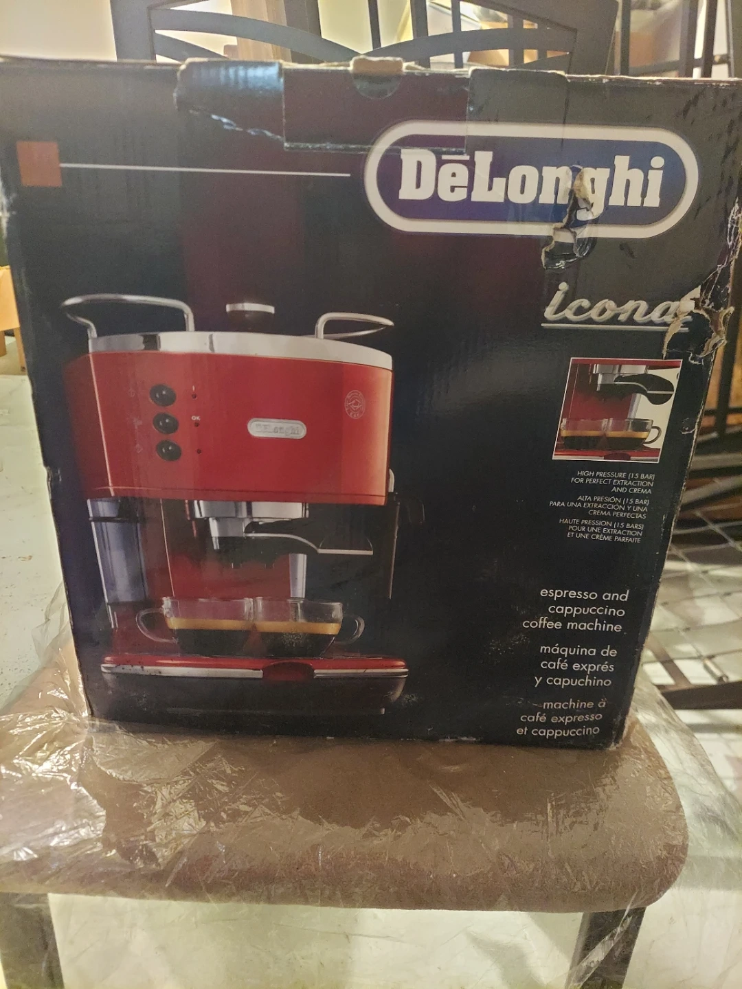 DeLonghi Icona espresso and cappuccino coffee machine. High pressure (15 bar) for perfect extraction and crema. Red color.