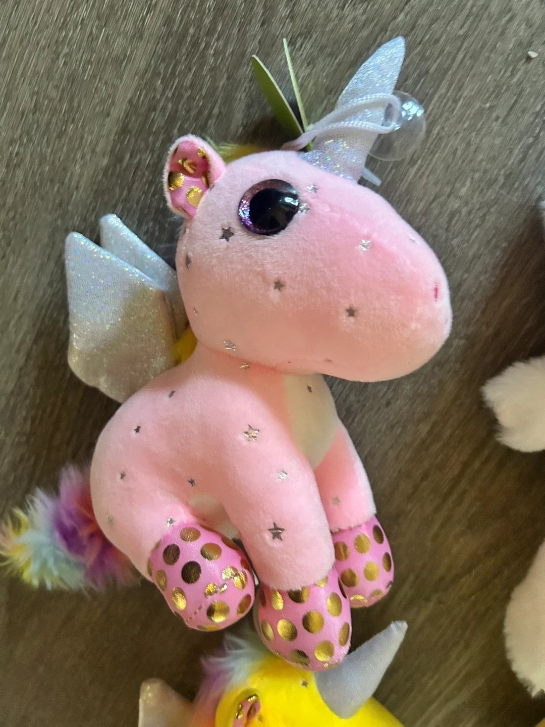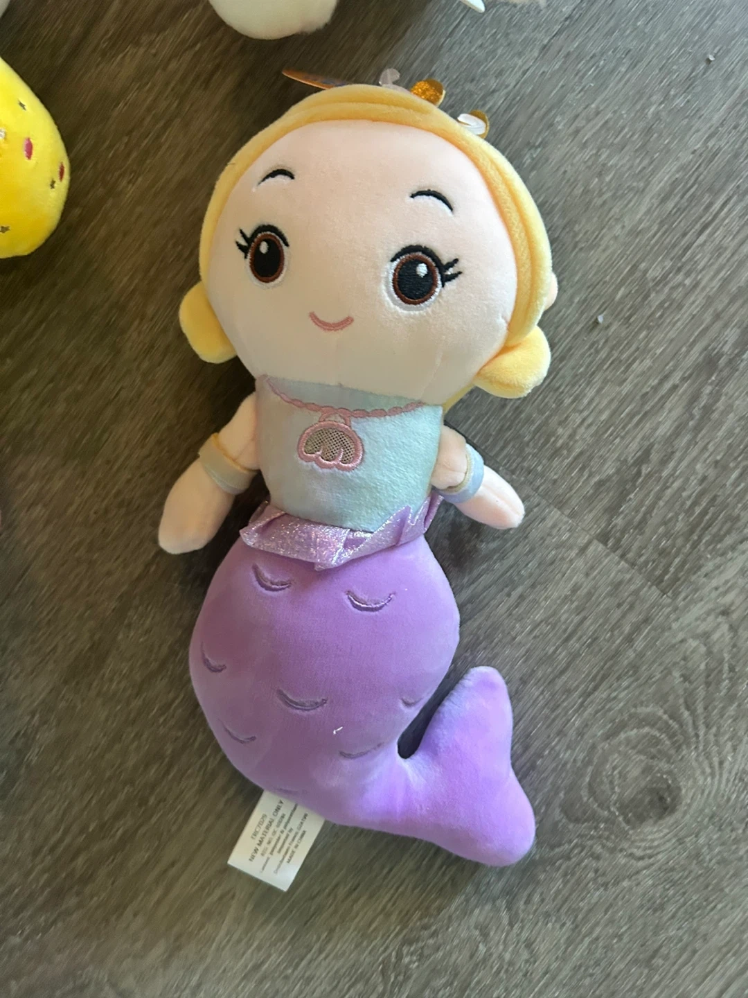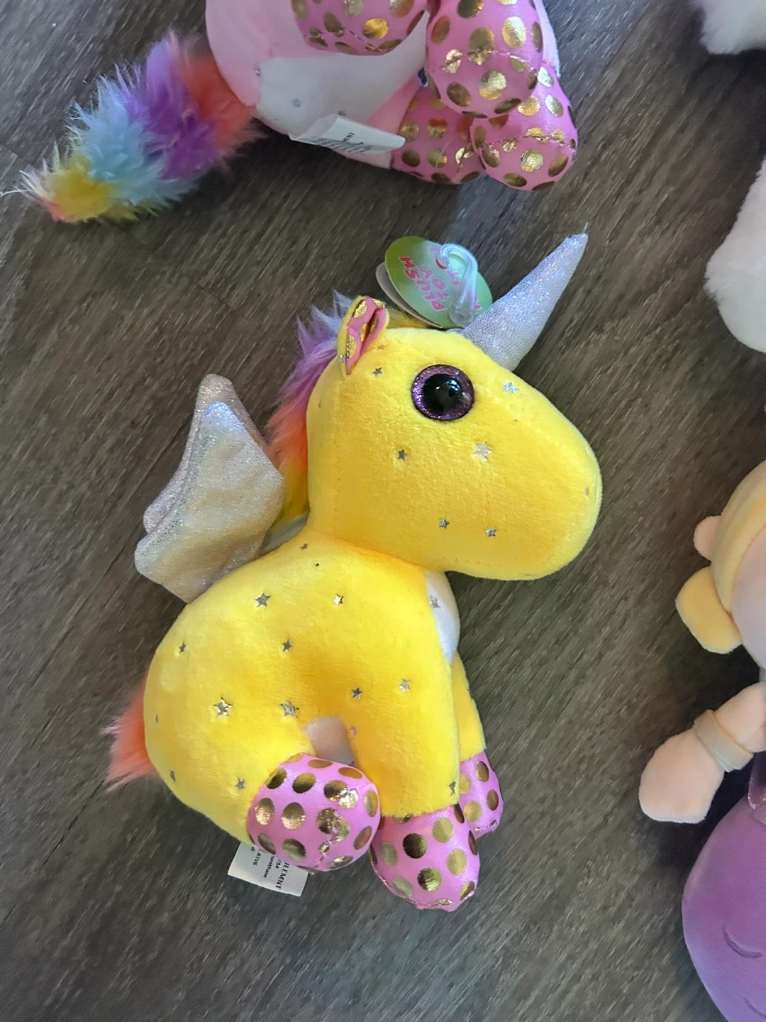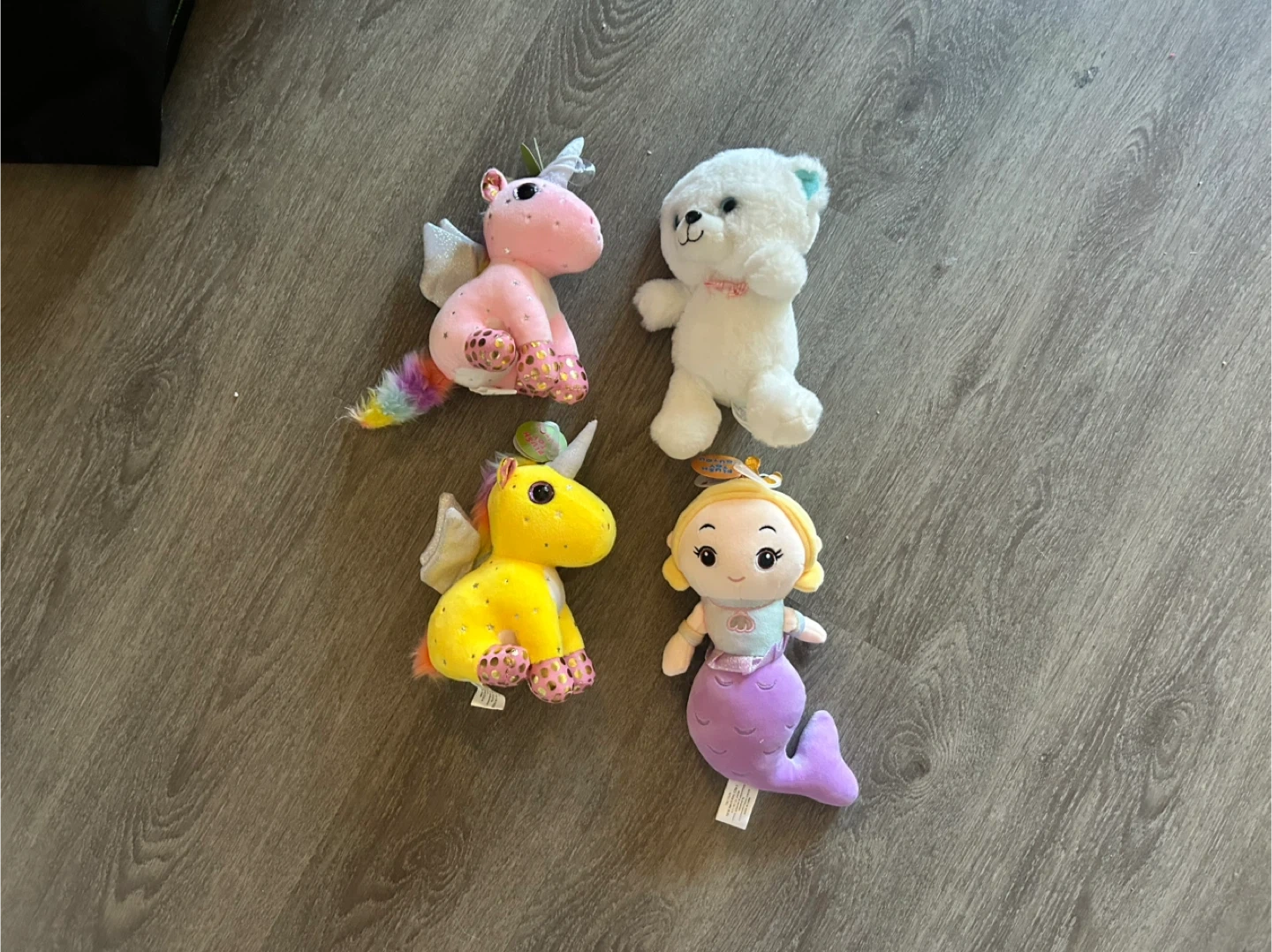 Selling a collection of cute plush toys! Includes a mermaid, a yellow unicorn, a pink unicorn, and a white bear. Perfect for kids or collectors!