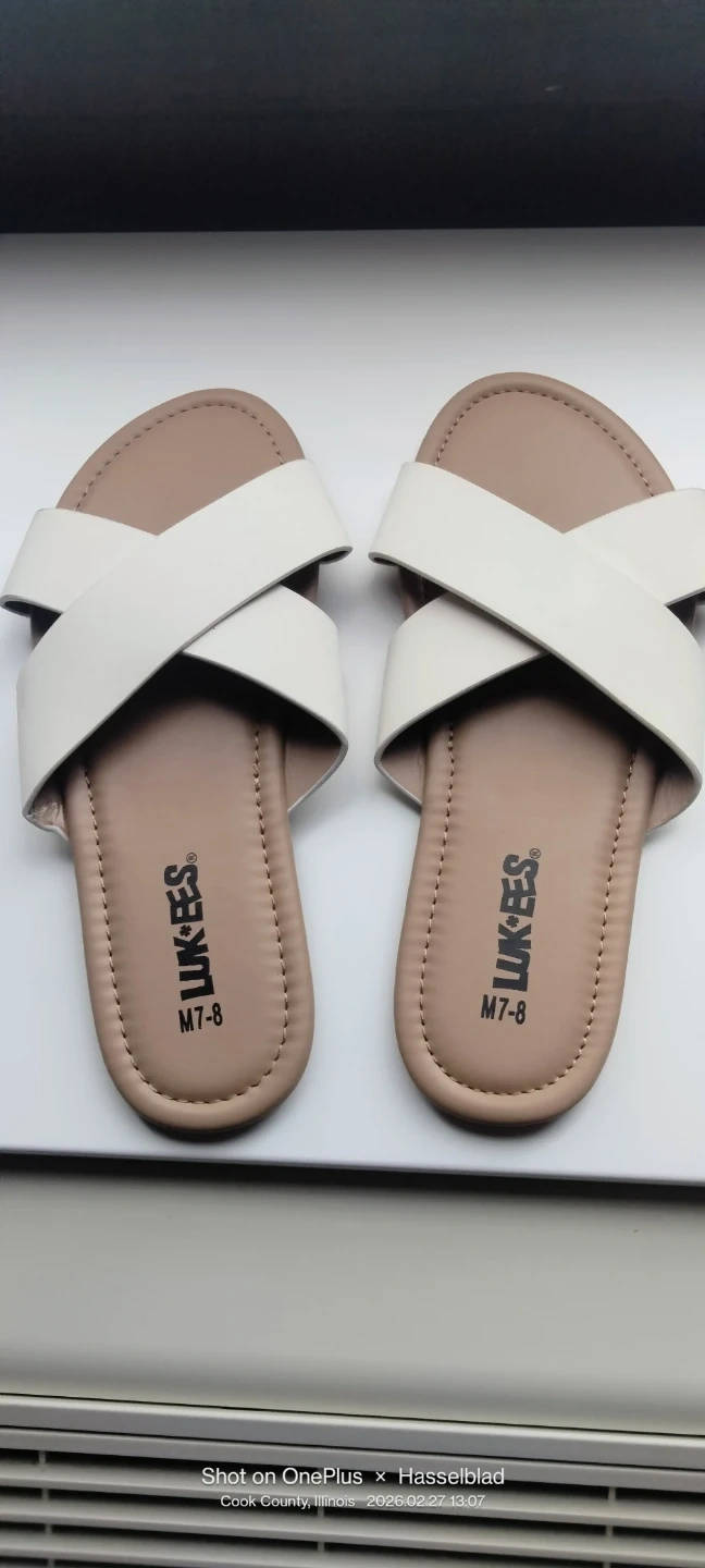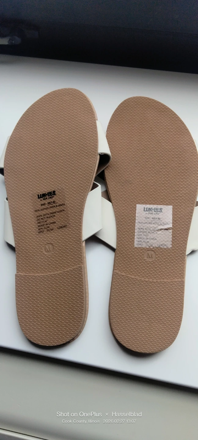 These LUKES flat sandals feature a white crisscross strap design. They are a size M, which corresponds to a 7-8 in US women's sizing. The sole is a natural cork-like material with a durable rubber tread.New without tag.