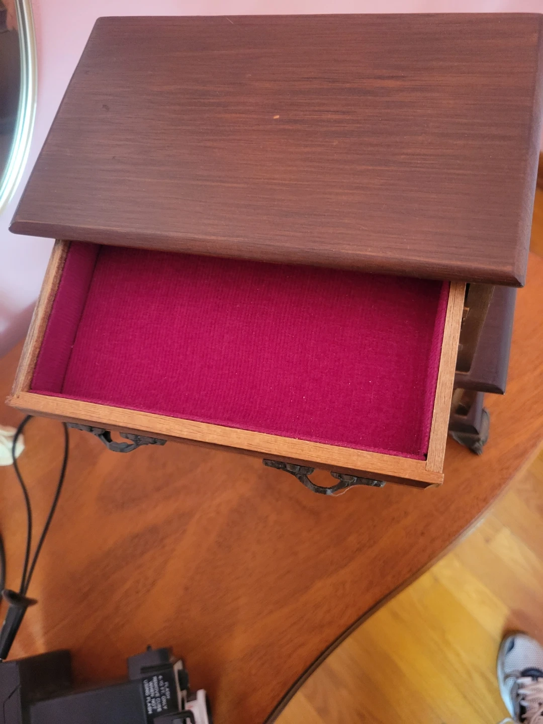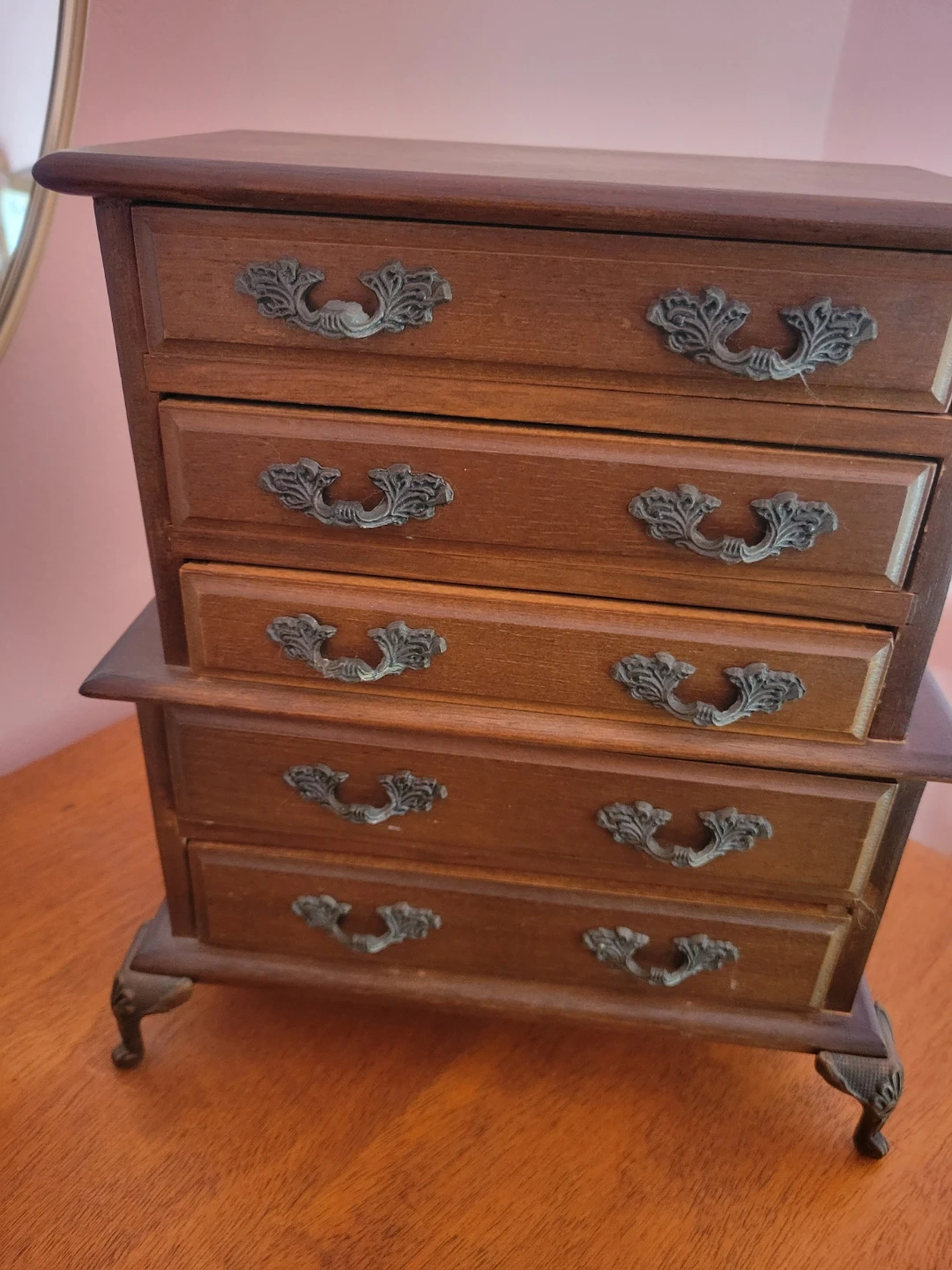 Selling a vintage wooden jewelry box with multiple drawers. It has a dark wood finish and ornate metal drawer pulls. The inside of the drawers are lined with a soft, red fabric. It's perfect for storing your precious jewelry!