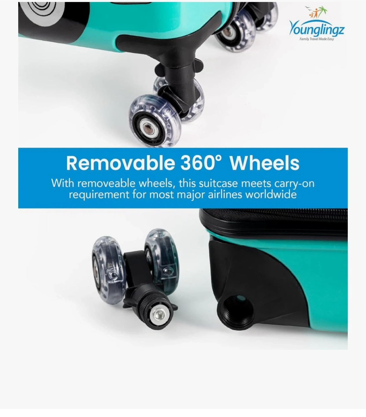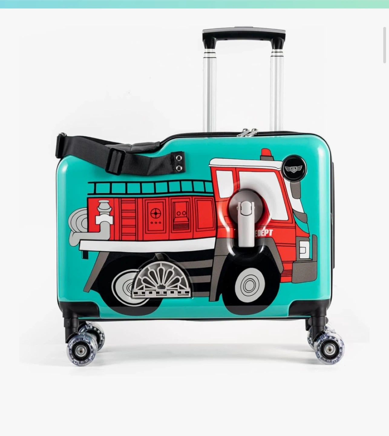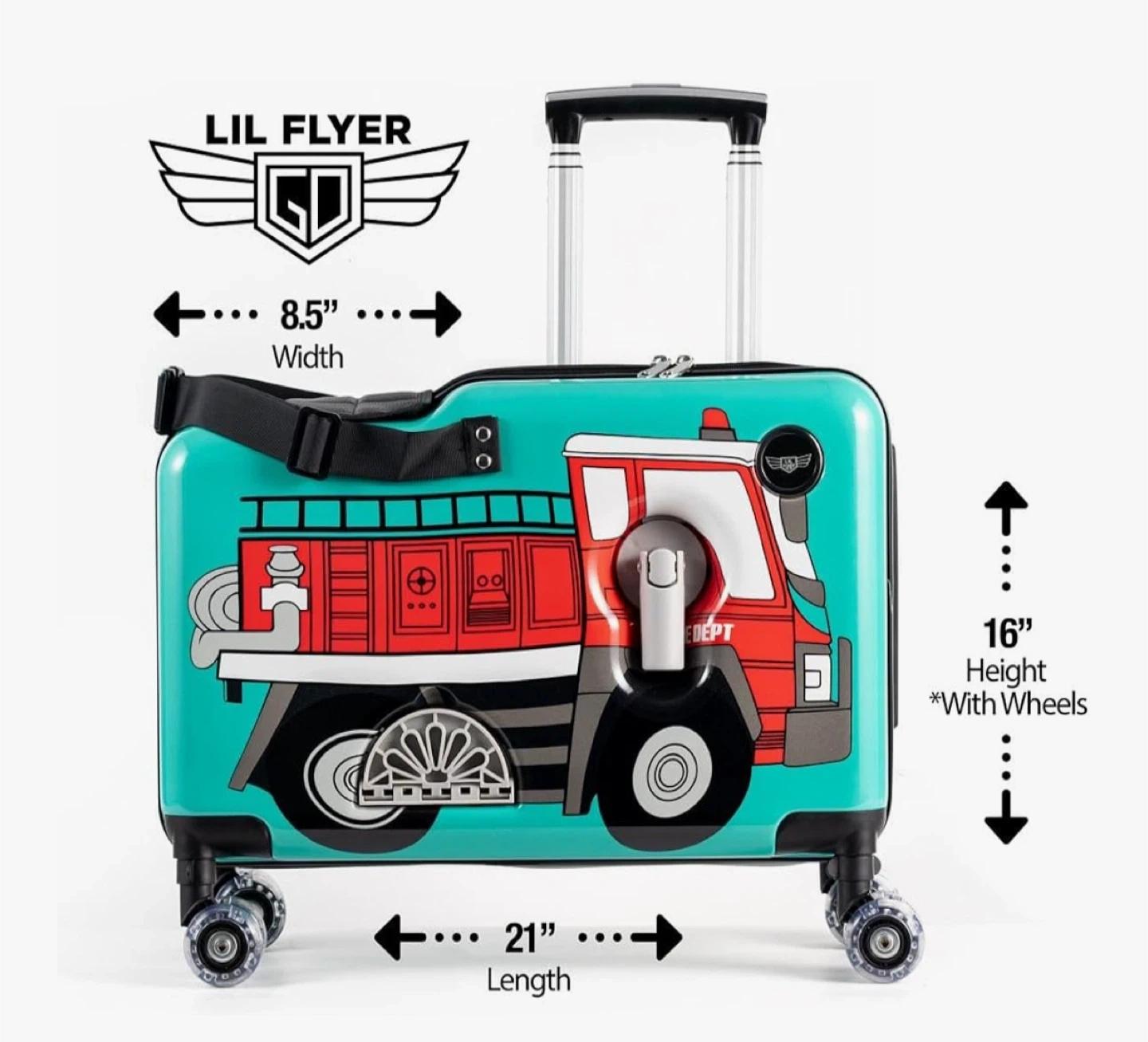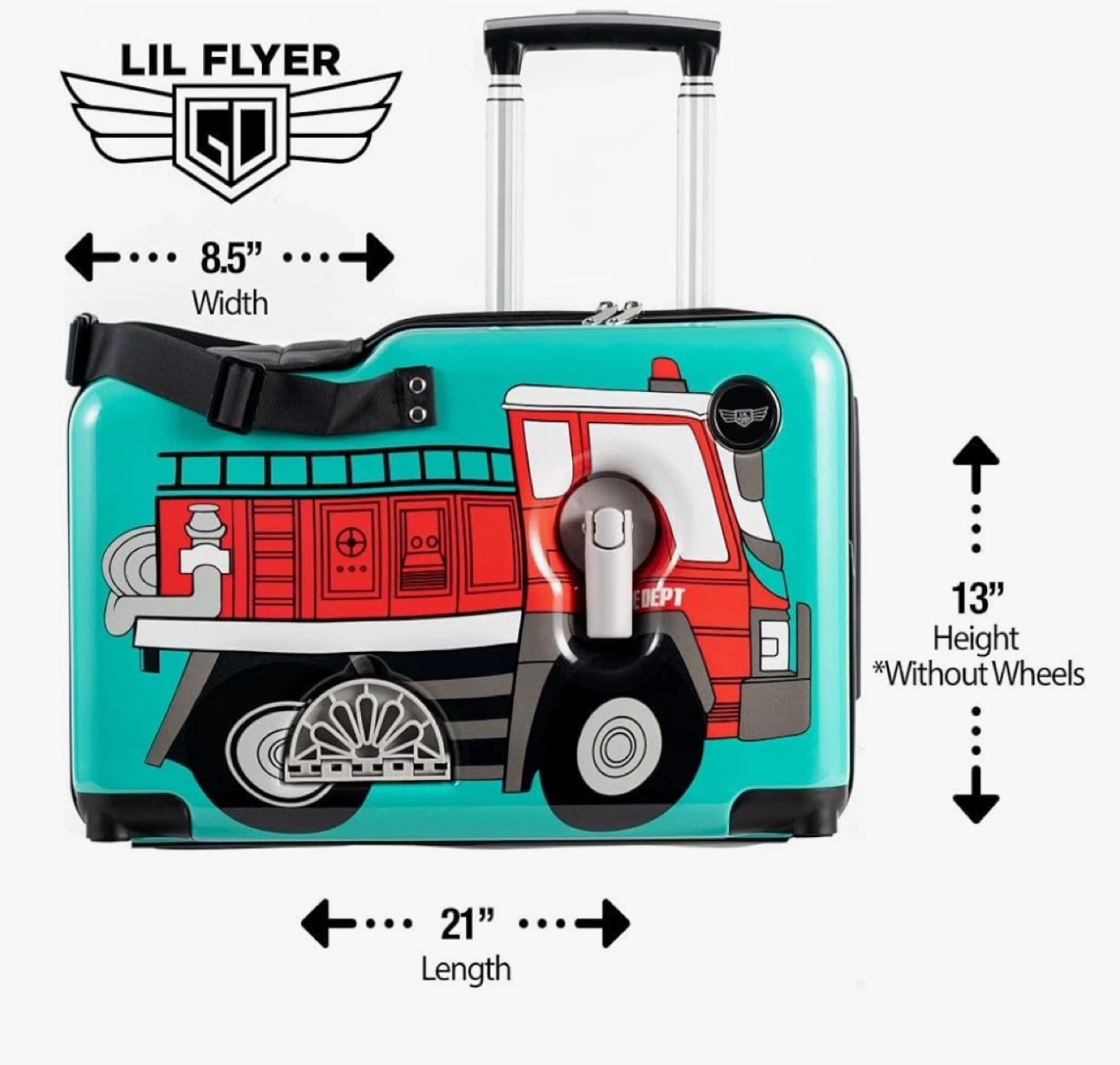 The Lil Flyer kids rolling suitcase is perfect for your little one's travels! This suitcase features a fun fire truck design and removable 360° wheels, making it easy to maneuver. It meets carry-on requirements for most major airlines worldwide. Dimensions are approximately 21" length, 8.5" width, and 16" height (with wheels)