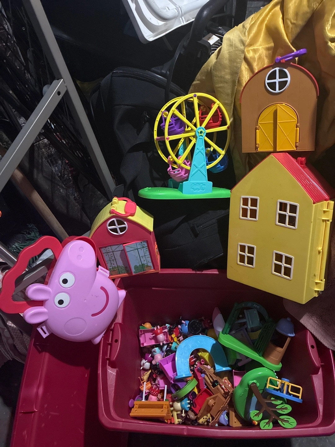 Offering a wonderful toy set. Contains a Peppa Pig container. Also contains other toy structures and pieces. Playing with these toys can be a calming way to spend an afternoon.