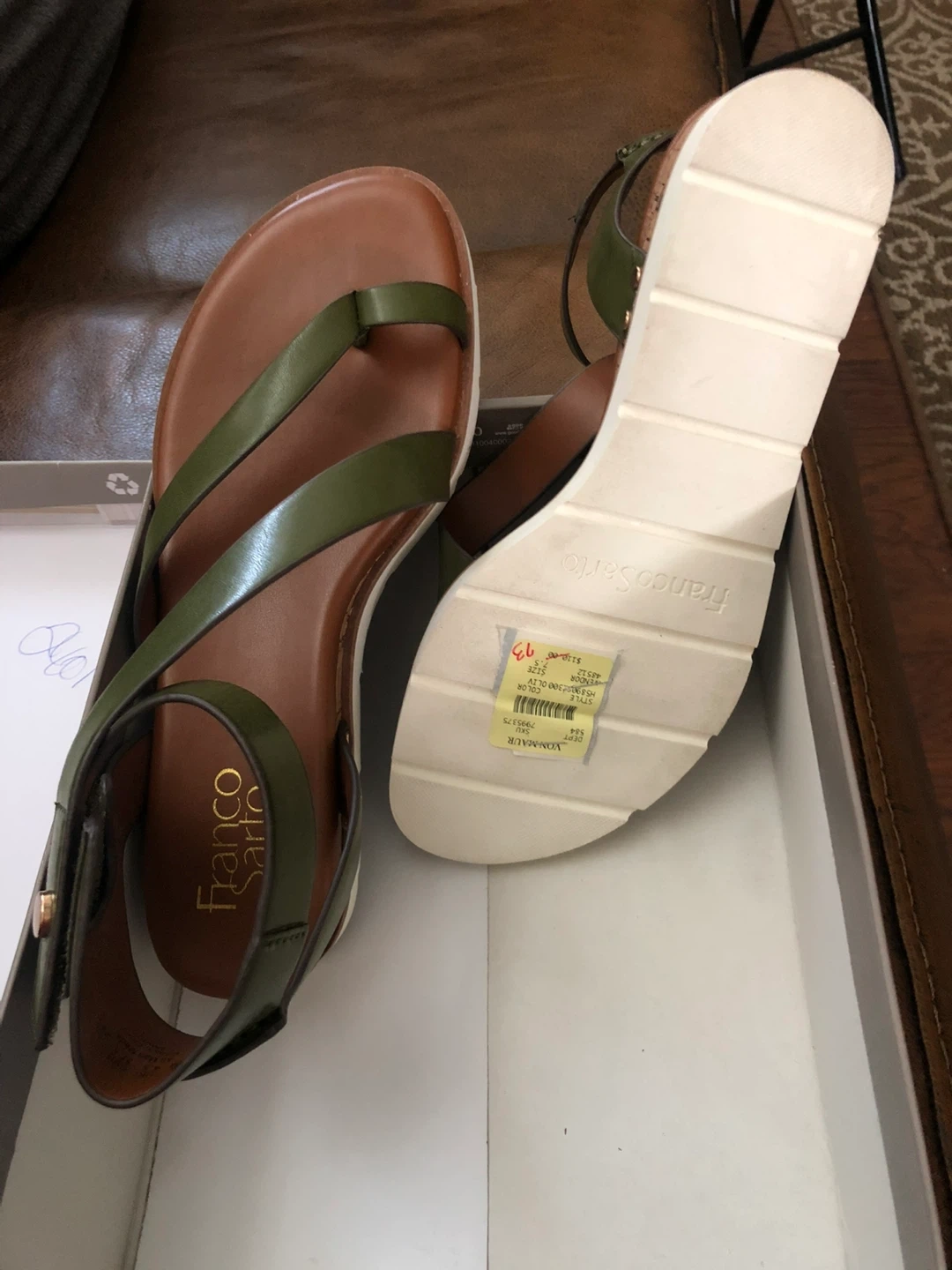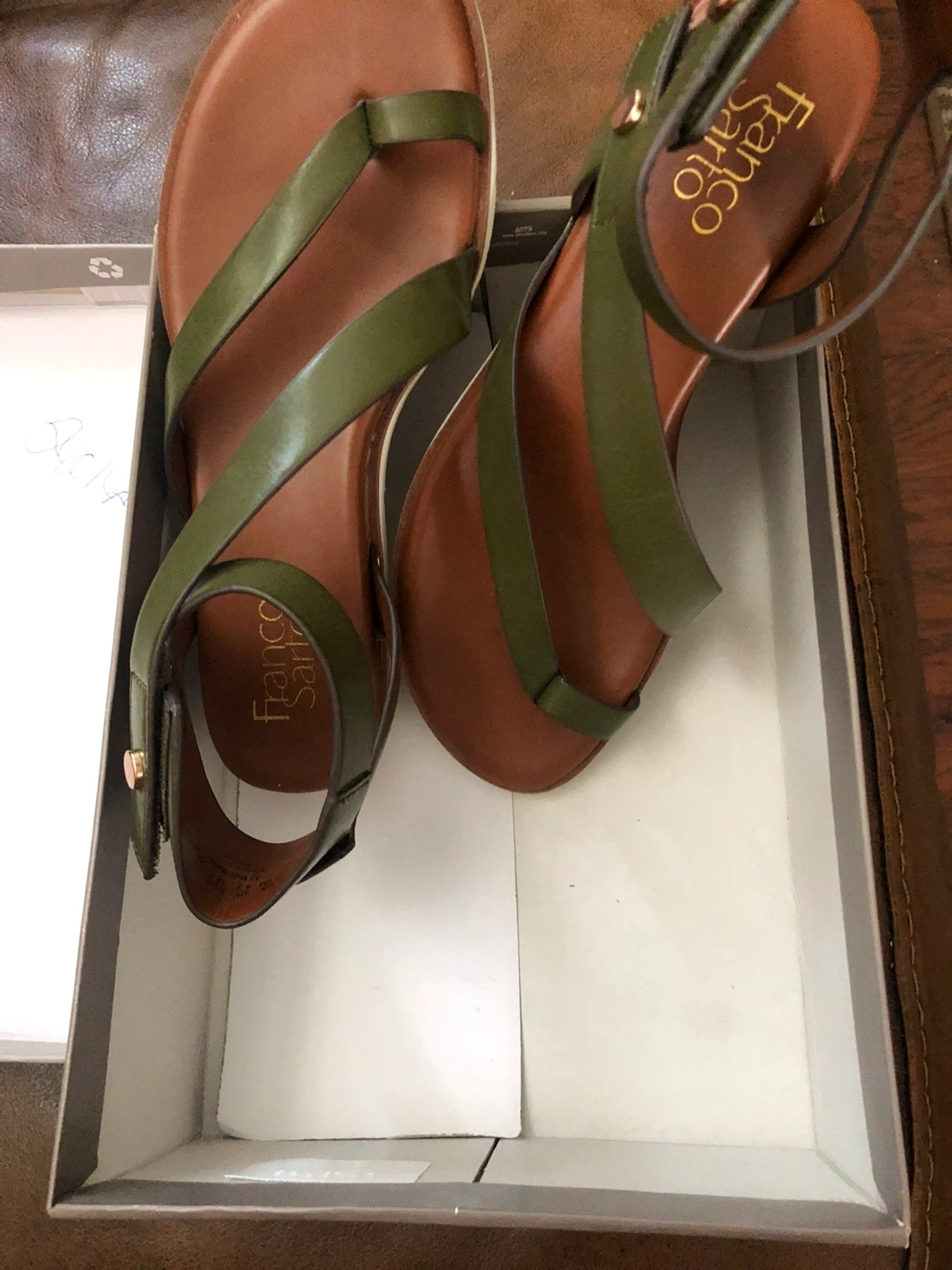 These Franco Sarto sandals are brand new and ready for a new owner! They are a size 7.5M and come in a stylish olive green color. The sandals have a unique design with straps and a comfortable sole. They come with the original box
