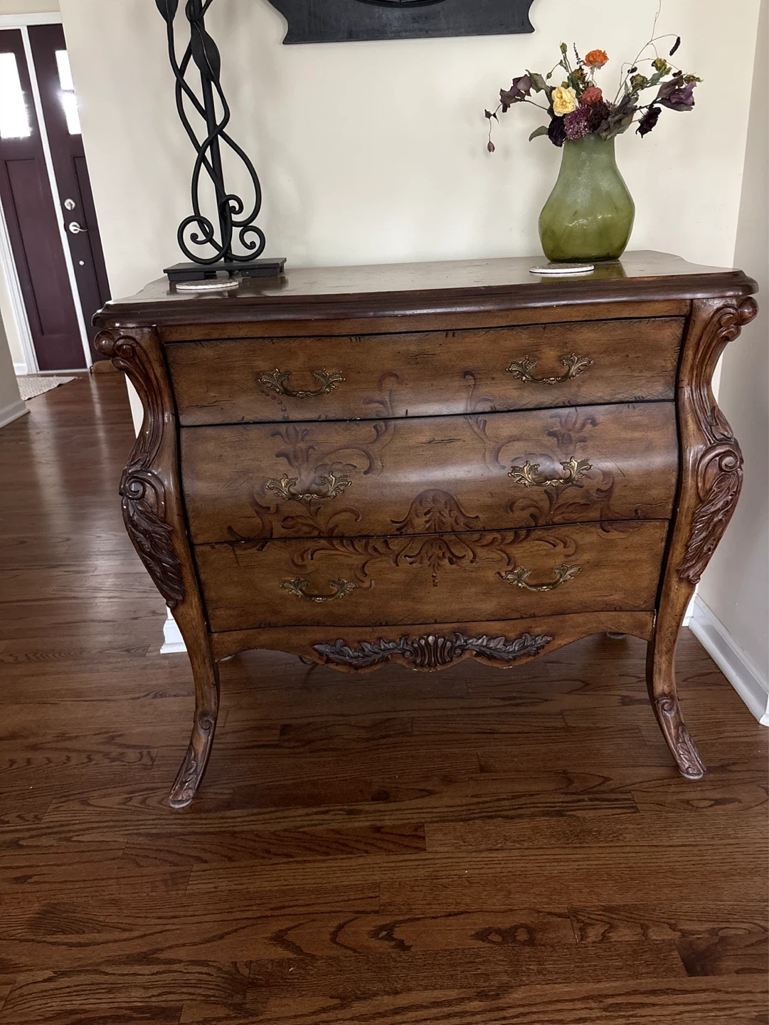 Beautifully ornate 3-drawer chest with intricate carvings and brass hardware. This piece features a classic bombe shape and cabriole legs. Its rich wood finish and detailed scrollwork add a touch of elegance to any room. Wood construction.