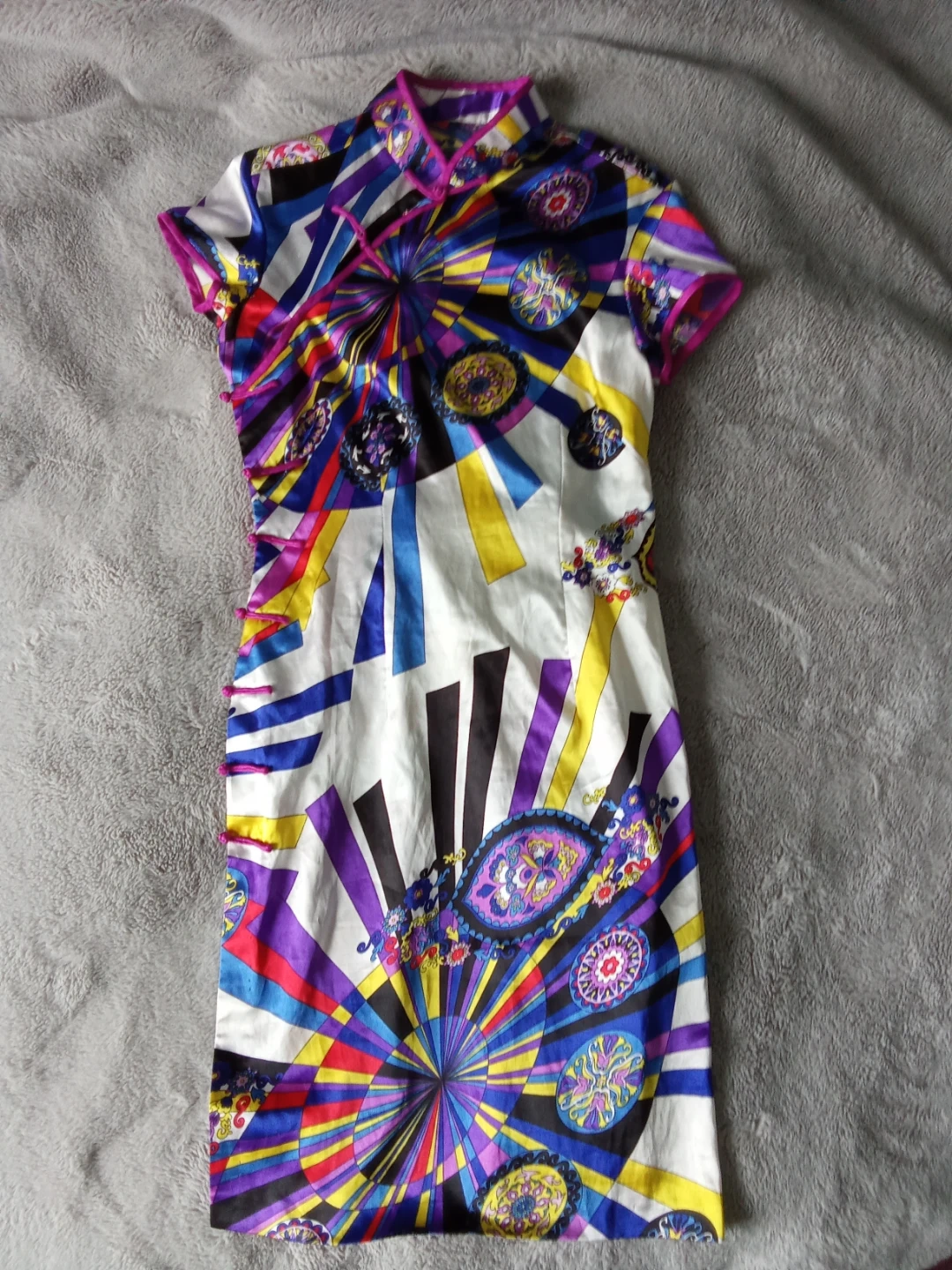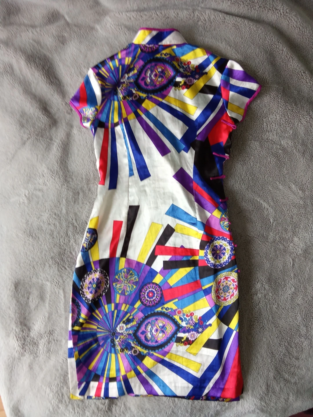This dress features a bold, colourful abstract print all over. It has a mandarin collar and short sleeves, with traditional frog closures on the side. The fabric appears to be a silky material, offering a slight sheen.