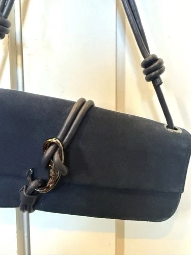 This Dolce Vita Alice navy suede asymmetrical shoulder bag is a stylish and versatile accessory for women. Made with leather and suede exterior materials in a solid navy color, this small-sized bag features an asymmetrical design. It has a zip closure, inner pockets, and a shoulder strap, perfect for everyday use or special occasions.