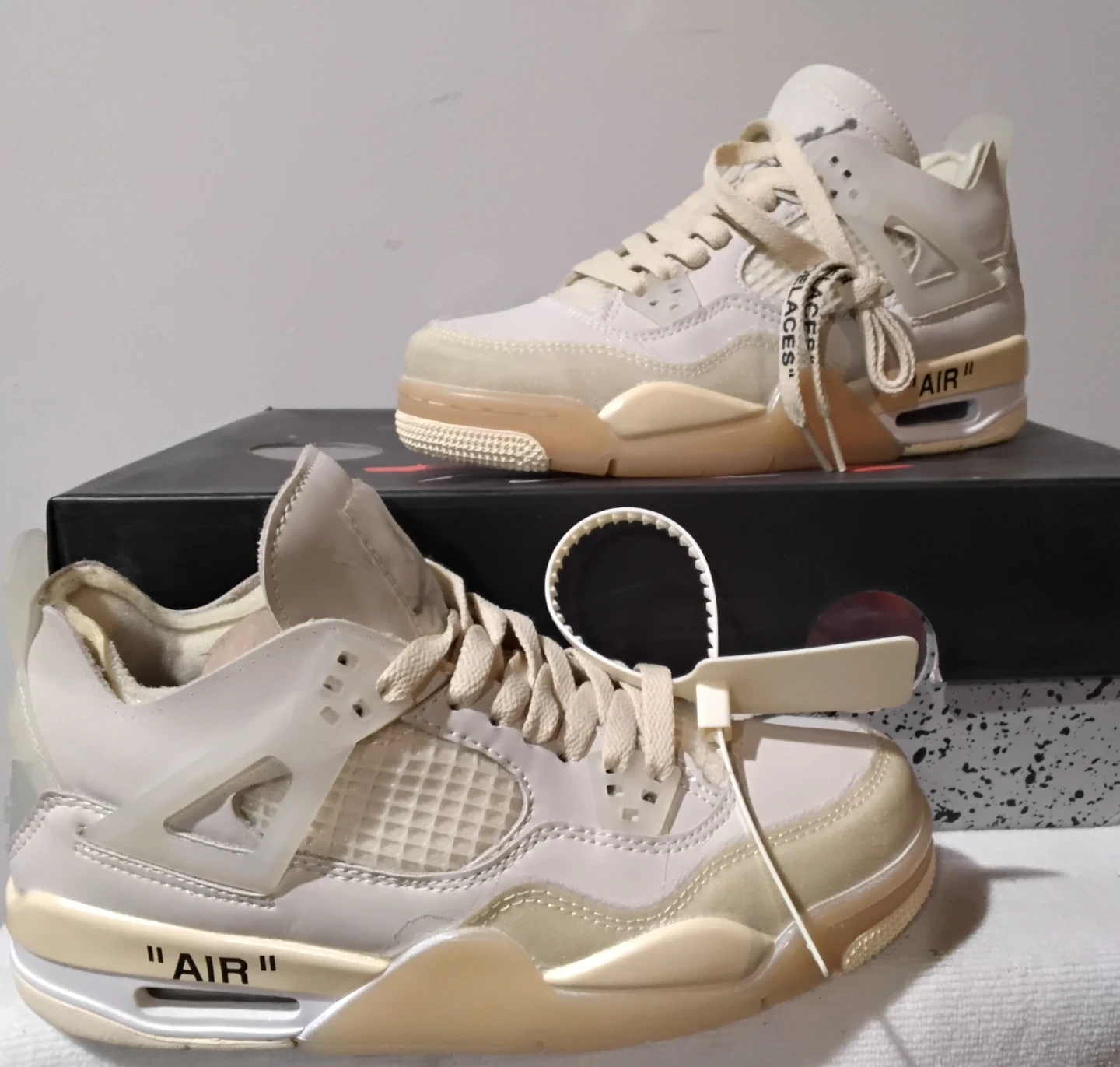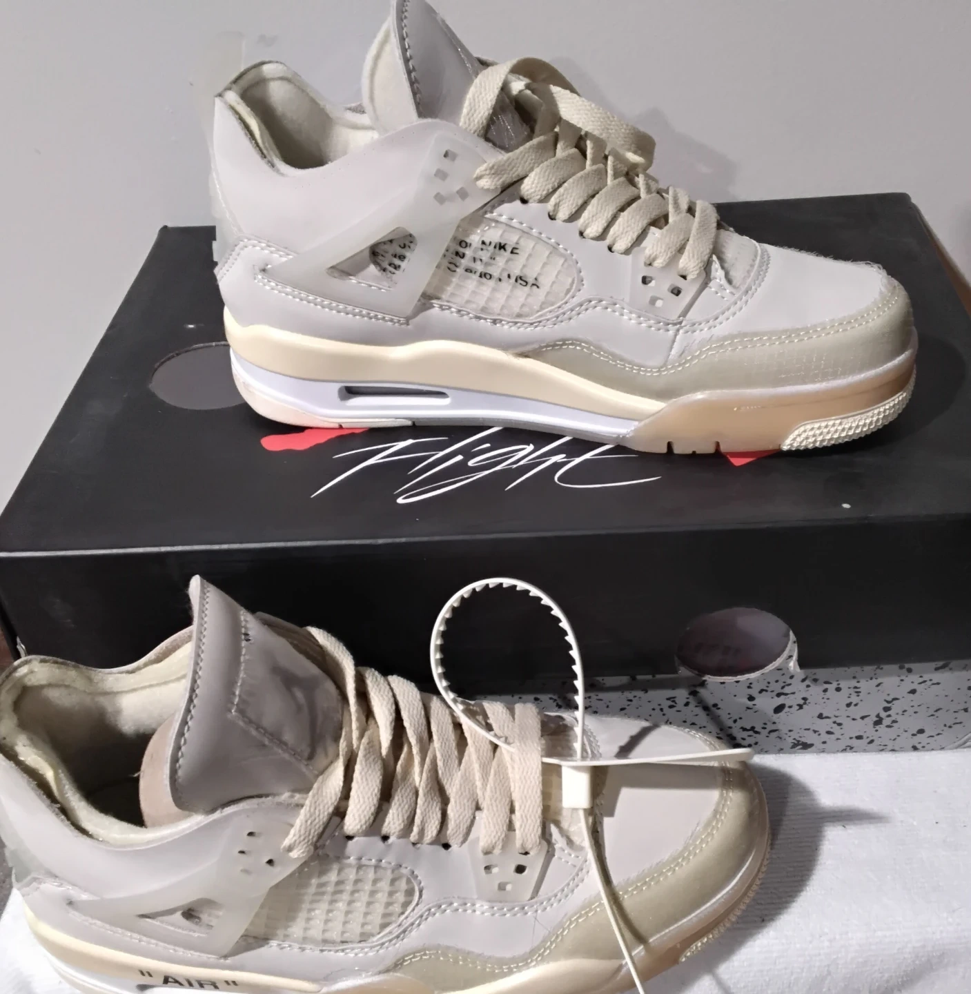 These are the Air Jordan 4 Retro Off-White 'Sail' sneakers. They feature a light sail colorway with signature Off-White details. The original box is included.