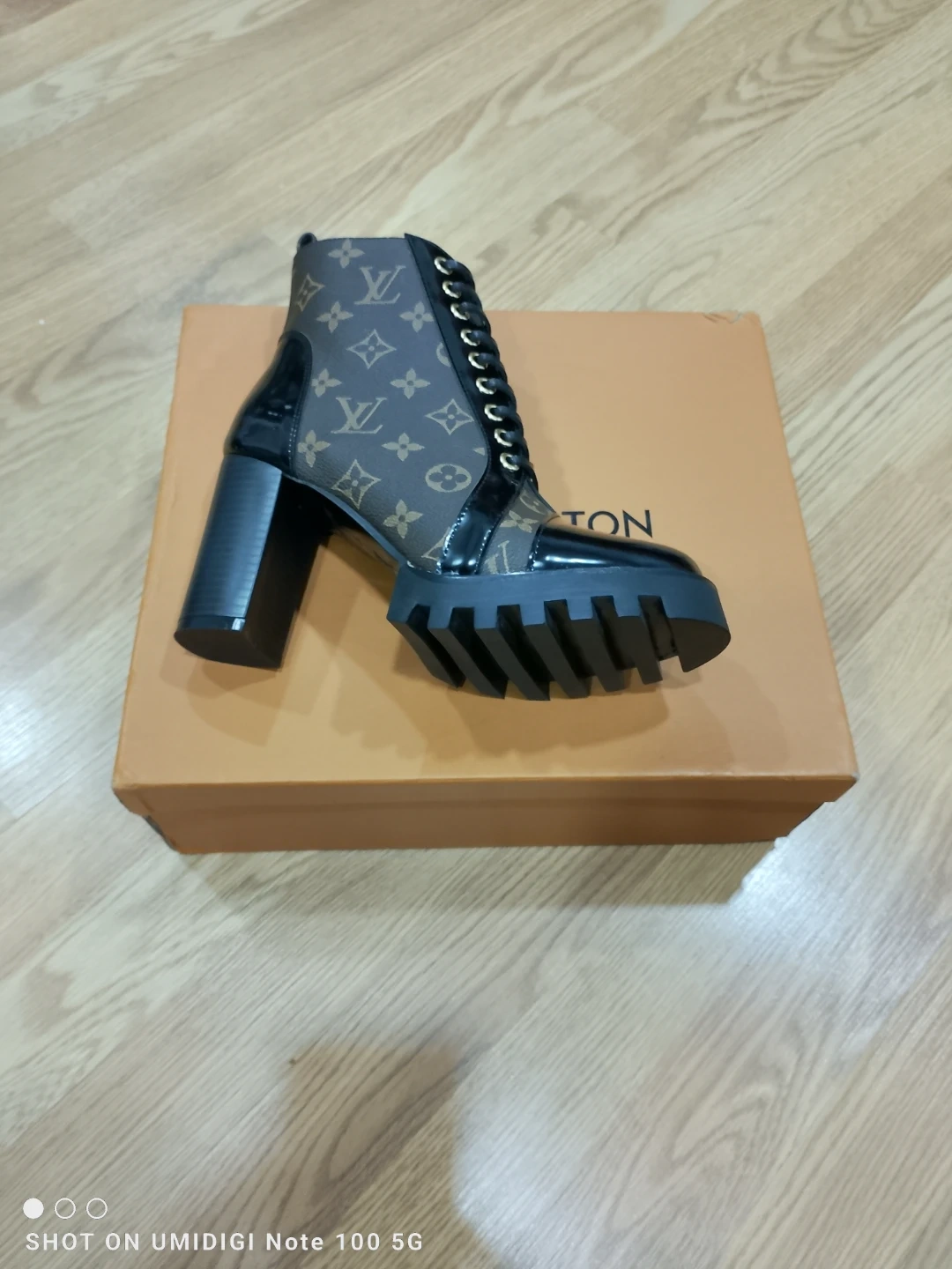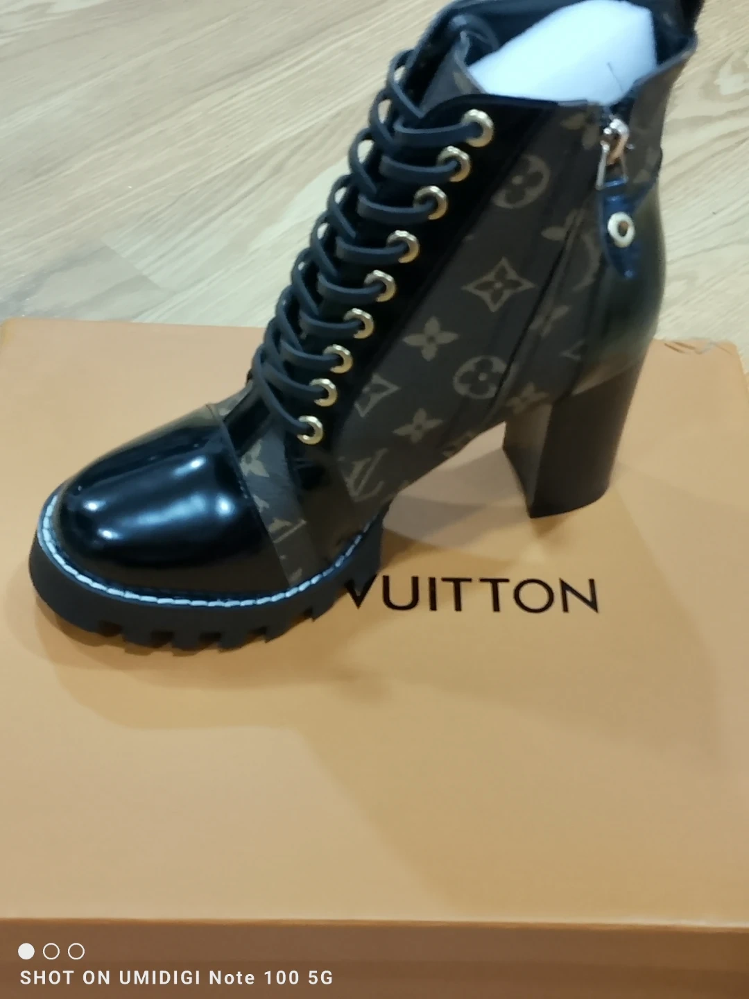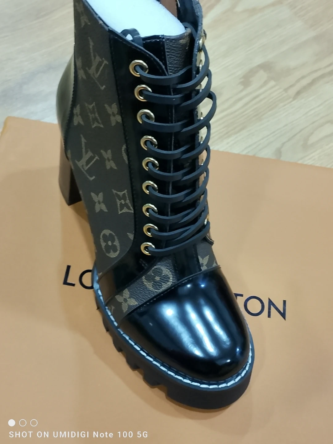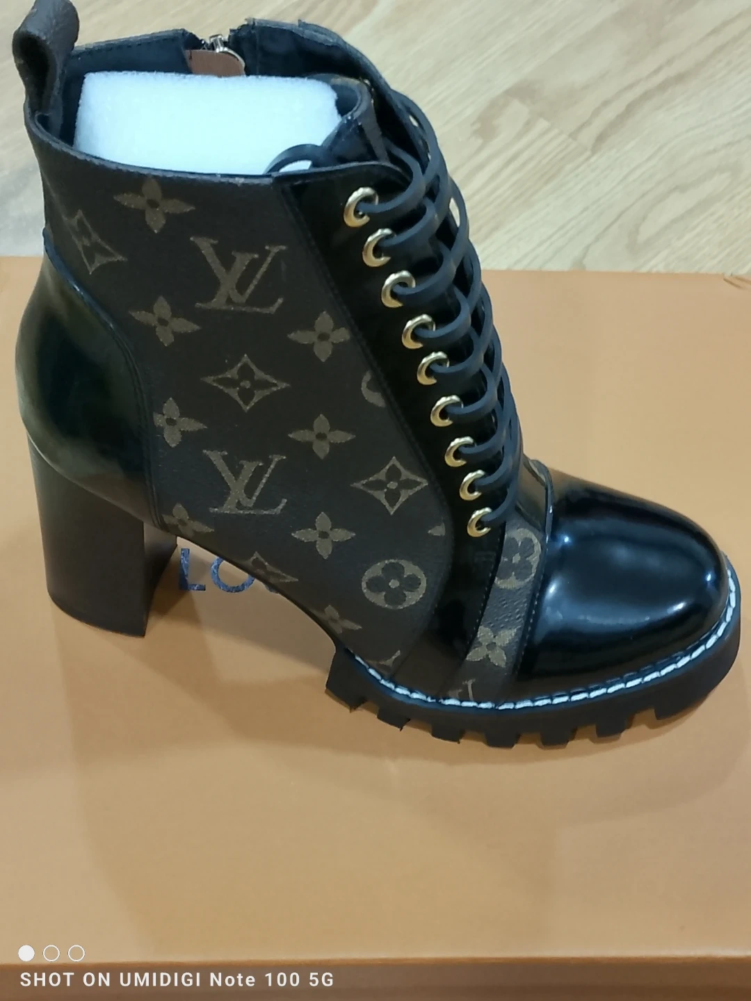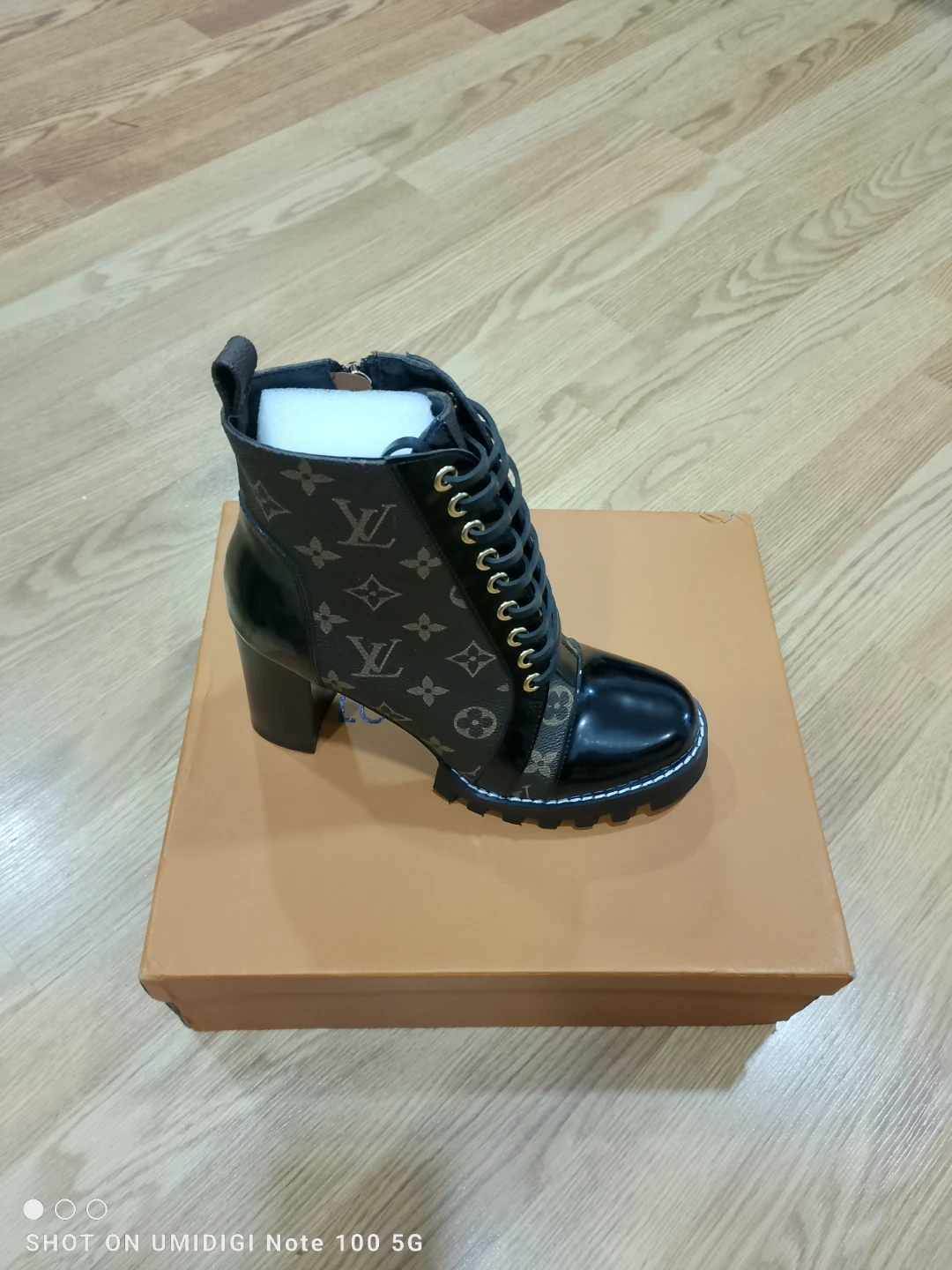 Stylish Louis Vuitton monogram lace-up boots with a high heel and patent toe. Features a side zipper for easy on and off. These boots are perfect for adding a fashionable touch to any outfit!