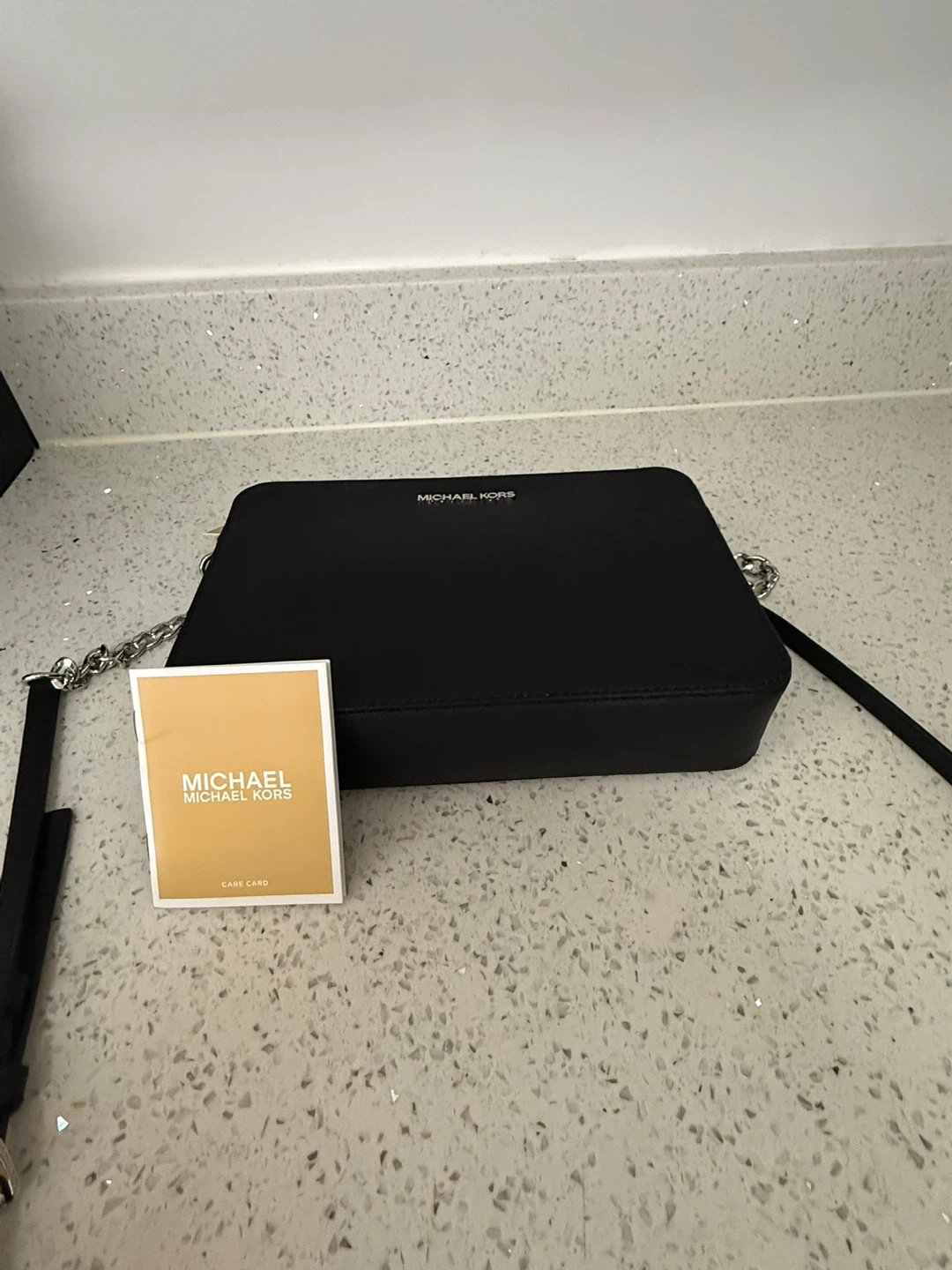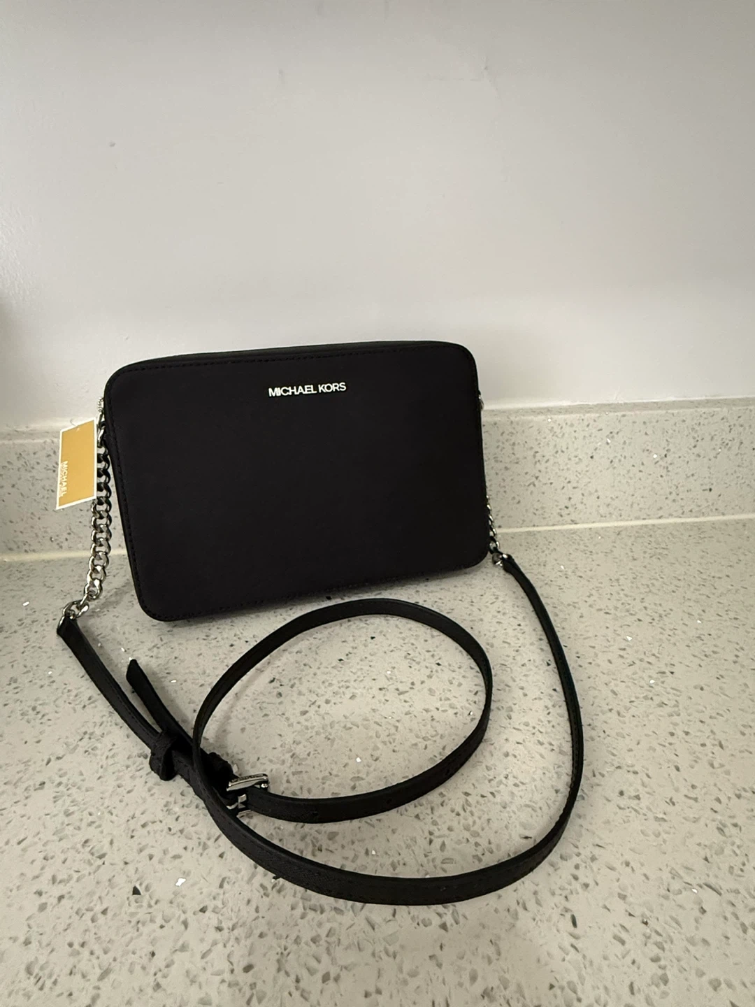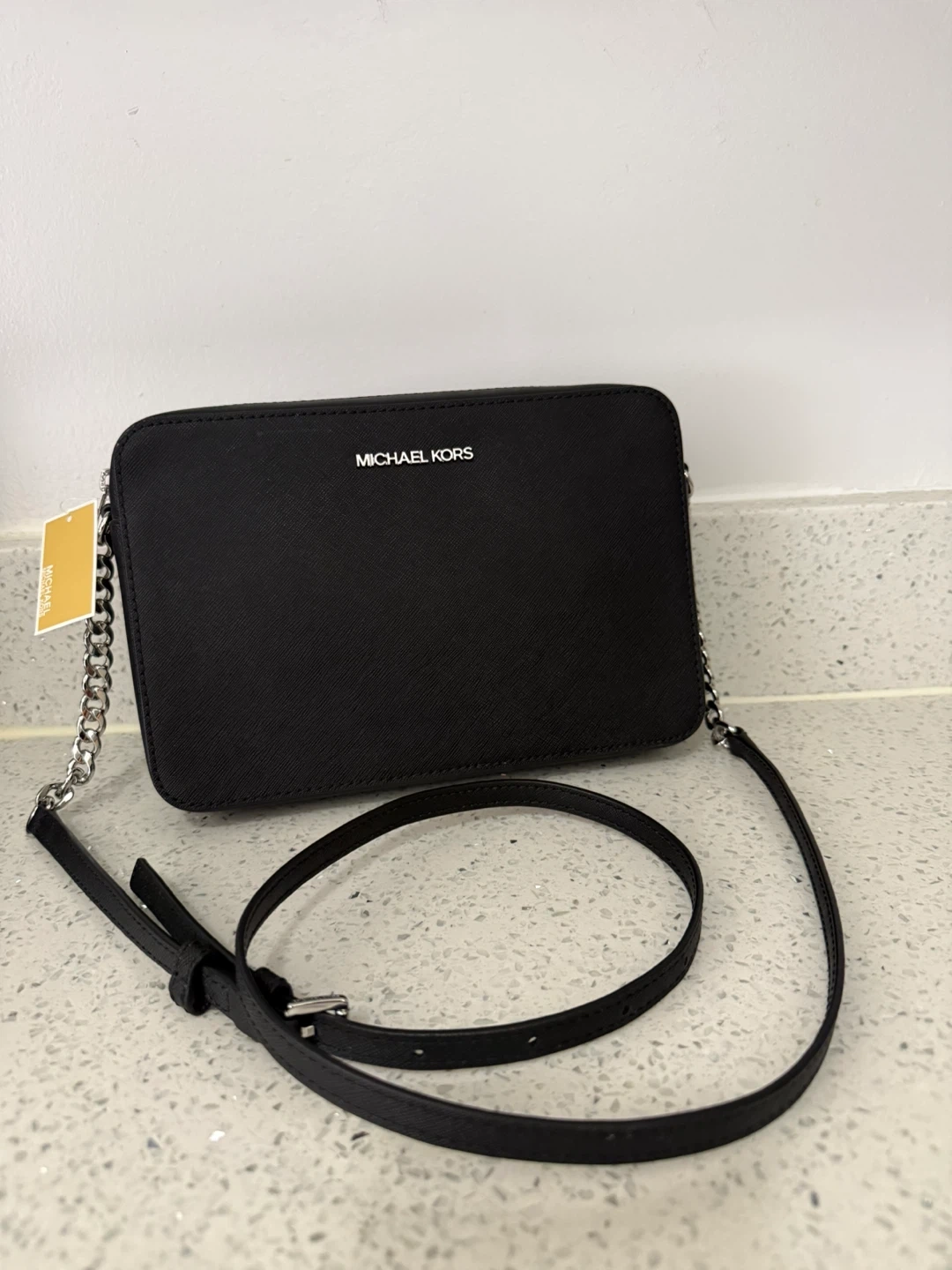 This is a black Michael Kors Jet Set Item small crossbody bag. It's made of saffiano leather. Includes the care card.