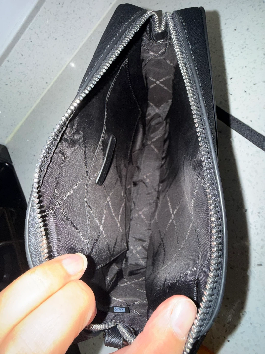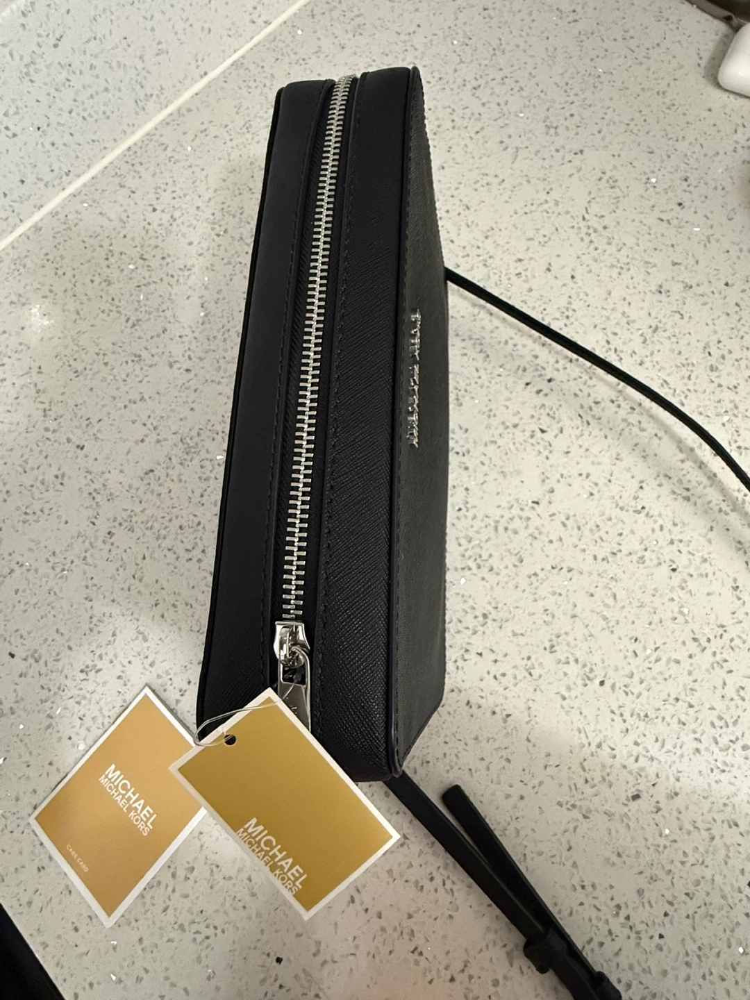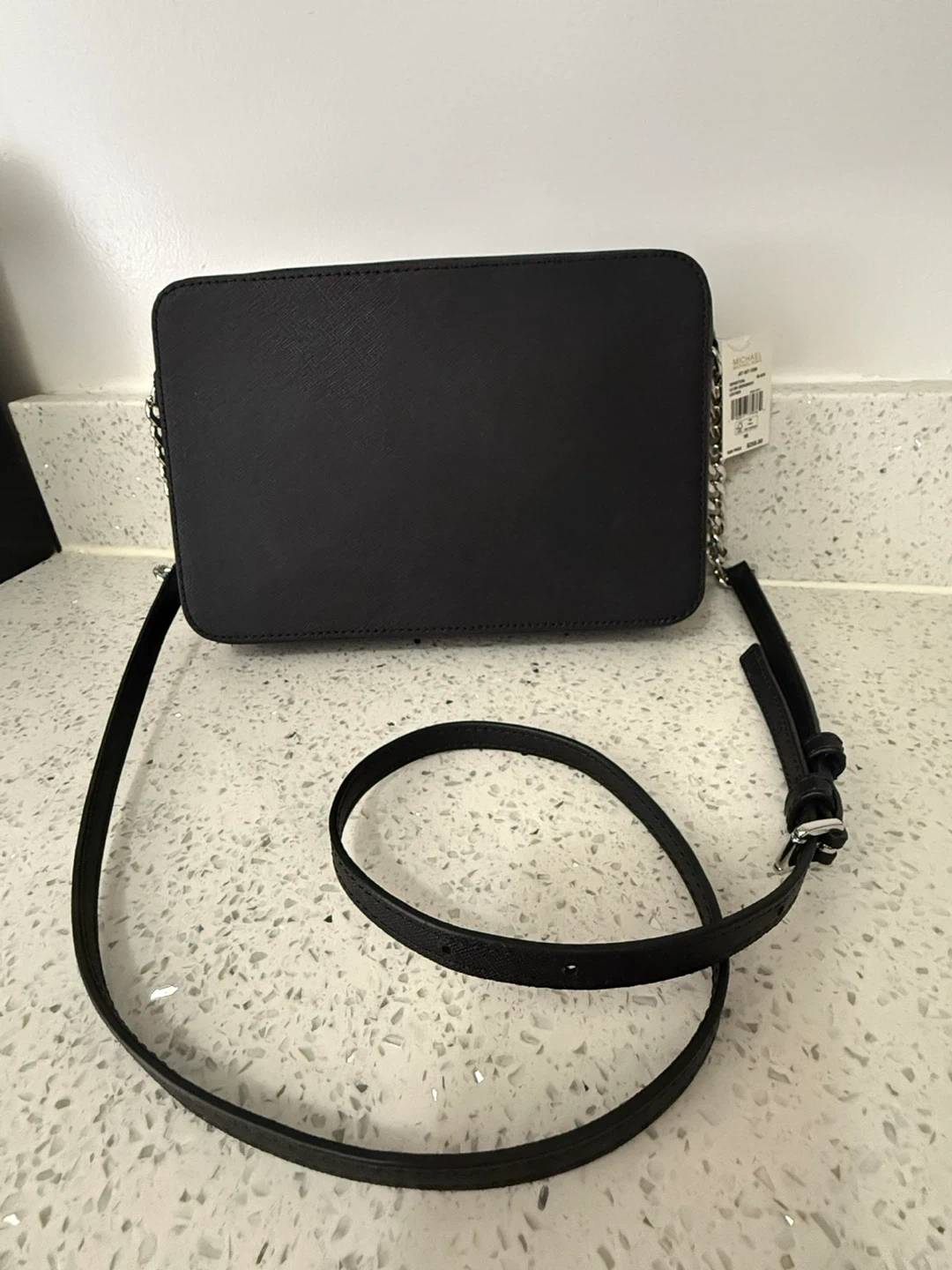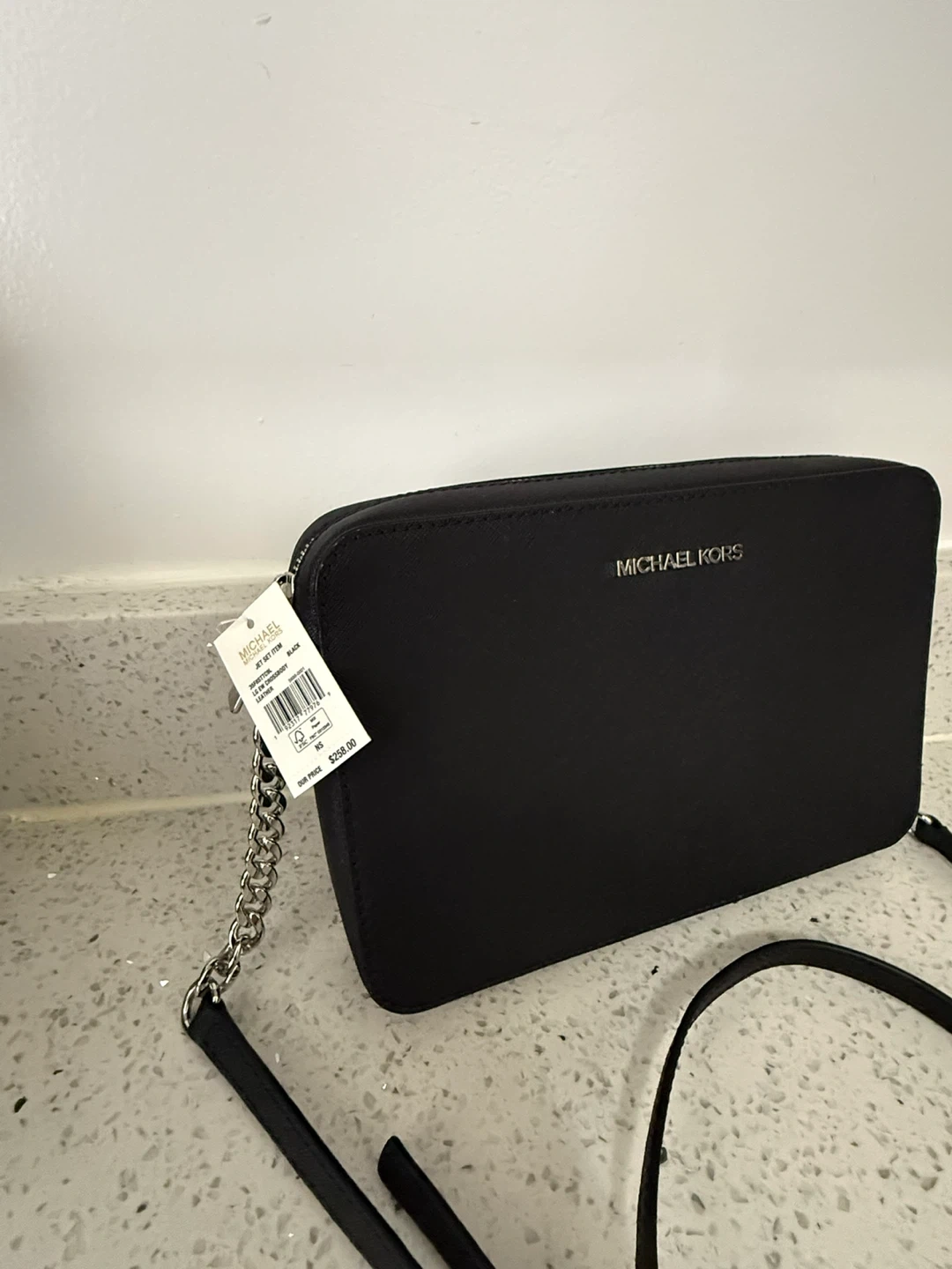 This is a black Michael Kors Jet Set Item small crossbody bag. It's made of saffiano leather. Includes the care card.