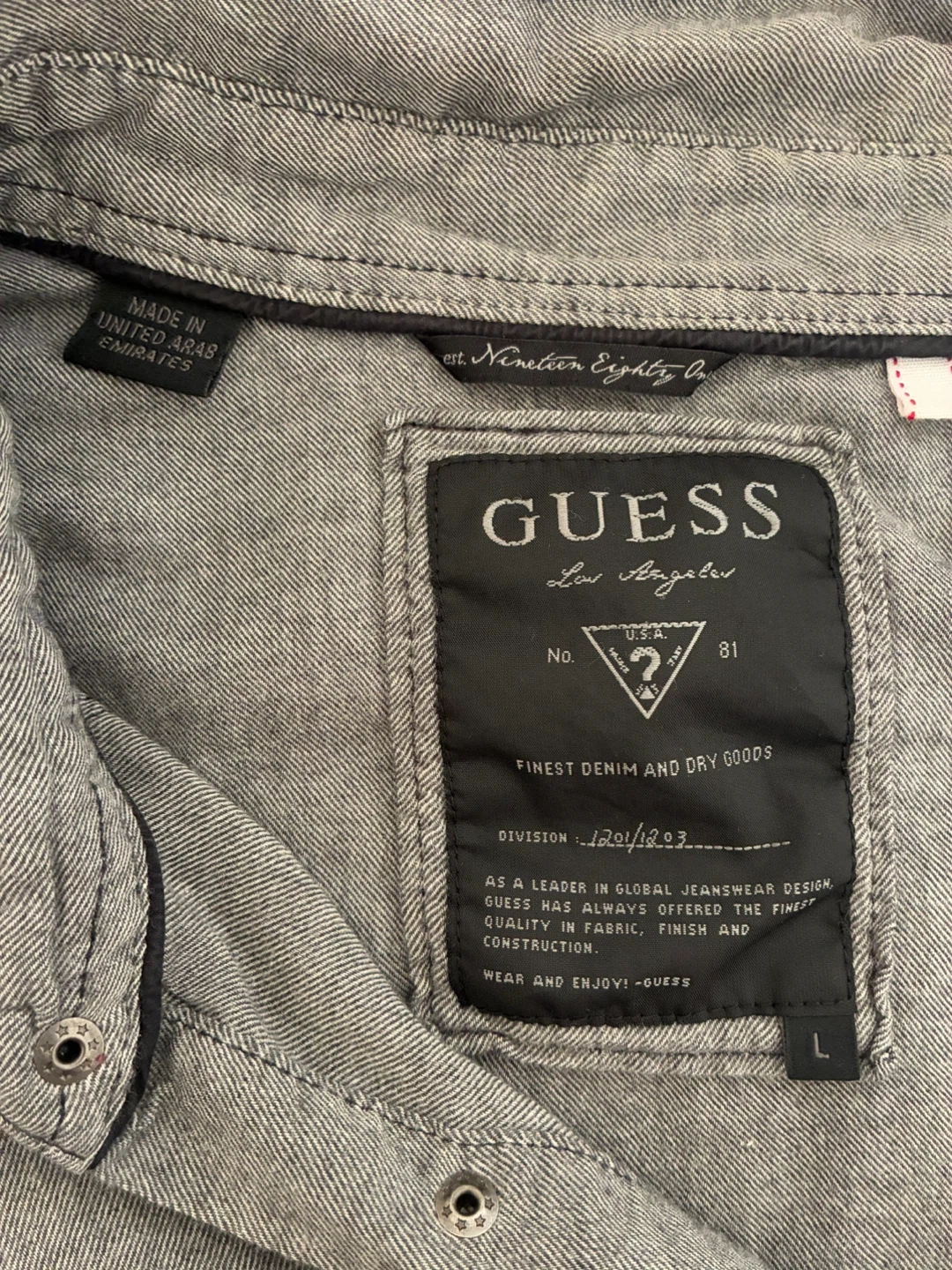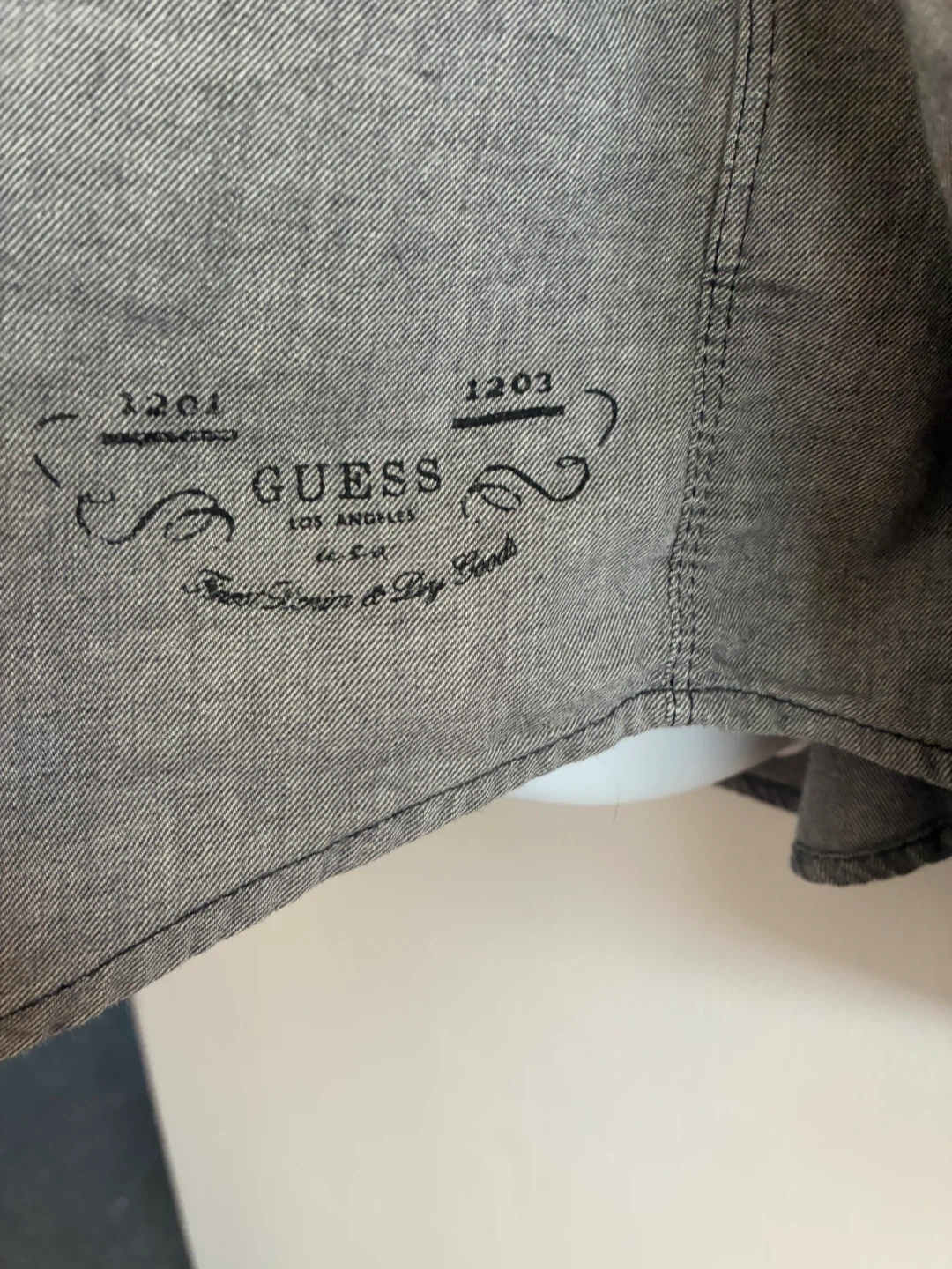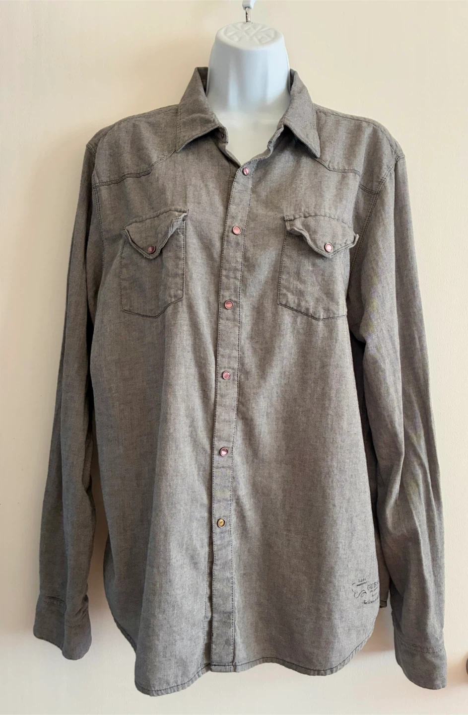 Selling a Guess Los Angeles western style shirt. It's a grey color and has a unique design with snap buttons. Great for casual wear or adding a bit of western flair to your wardrobe!