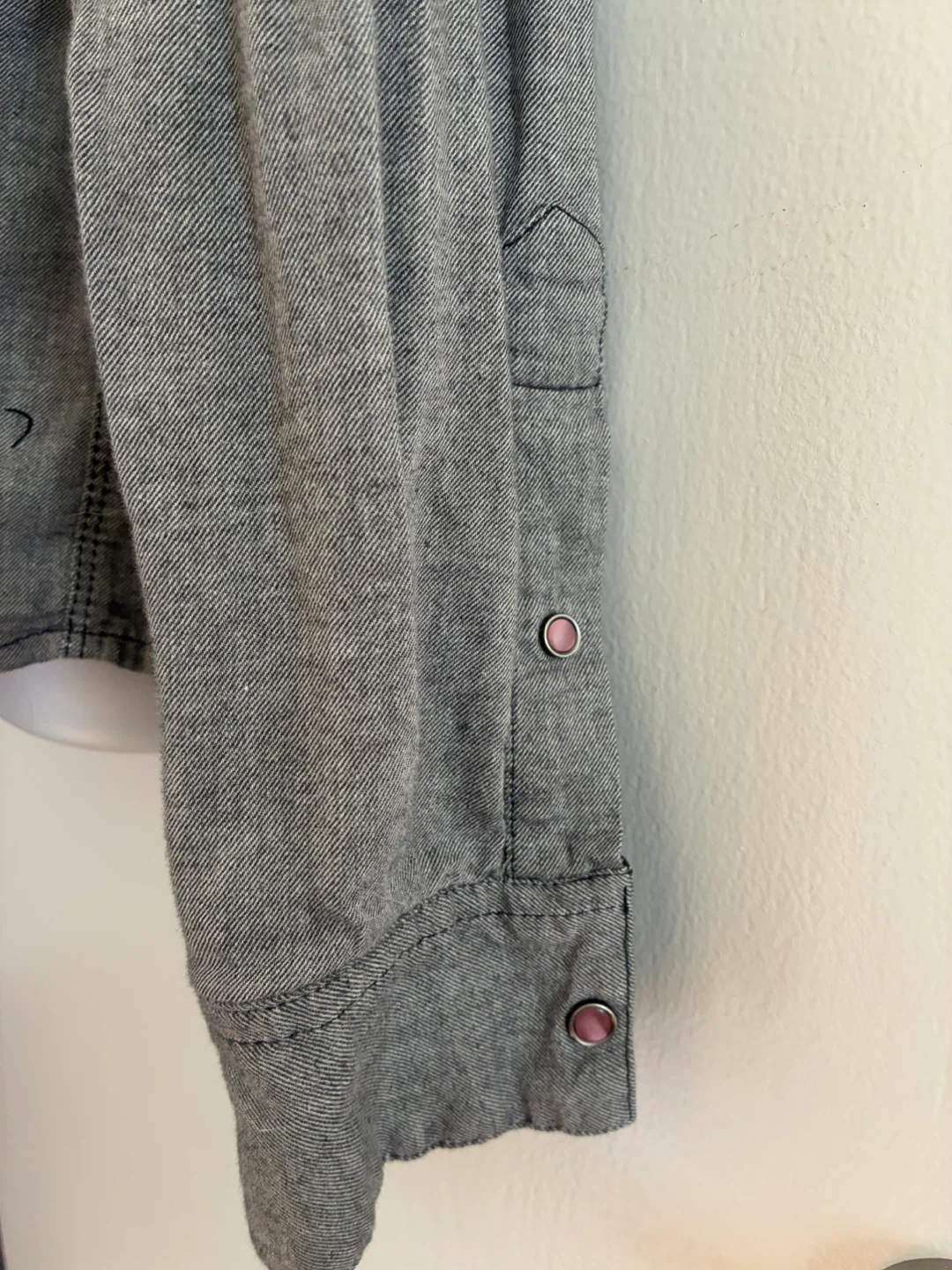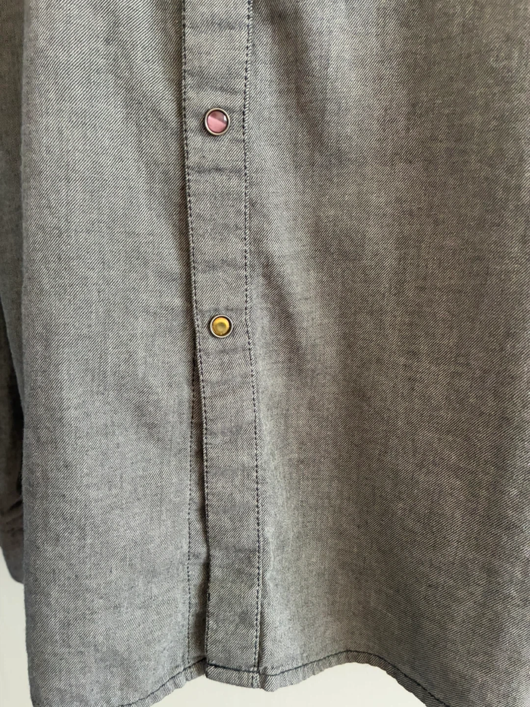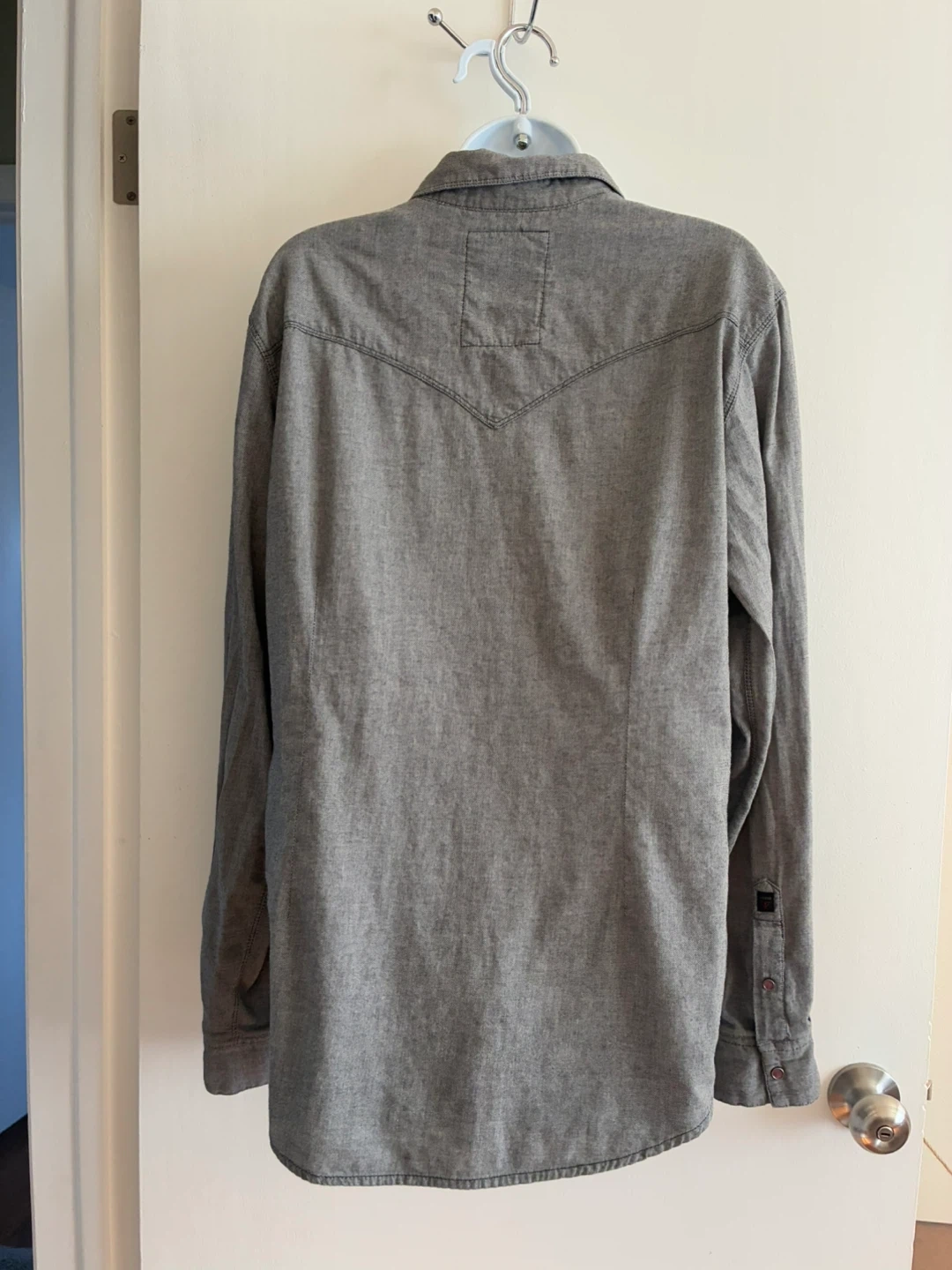 Selling a Guess Los Angeles western style shirt. It's a grey color and has a unique design with snap buttons. Great for casual wear or adding a bit of western flair to your wardrobe!
