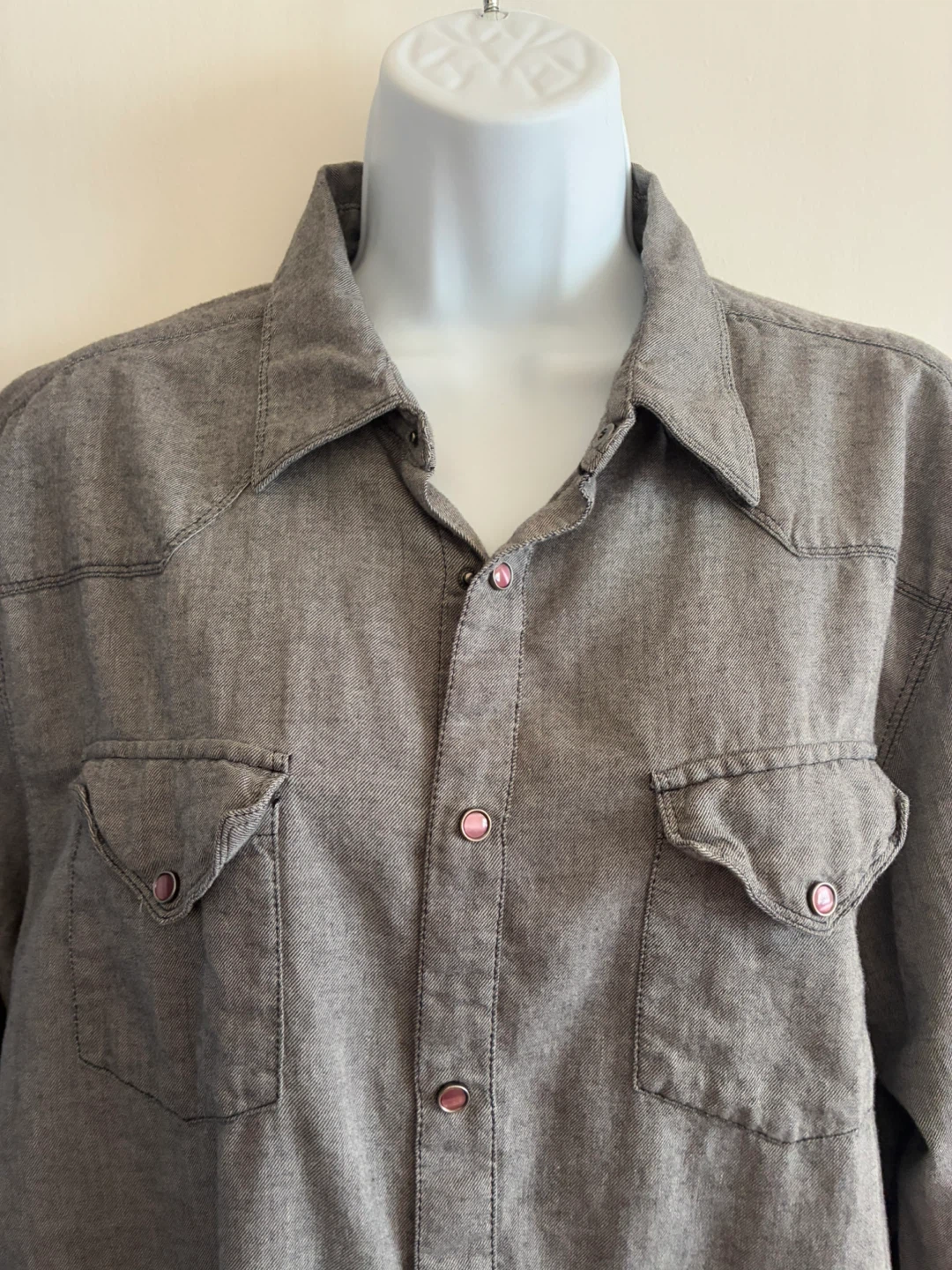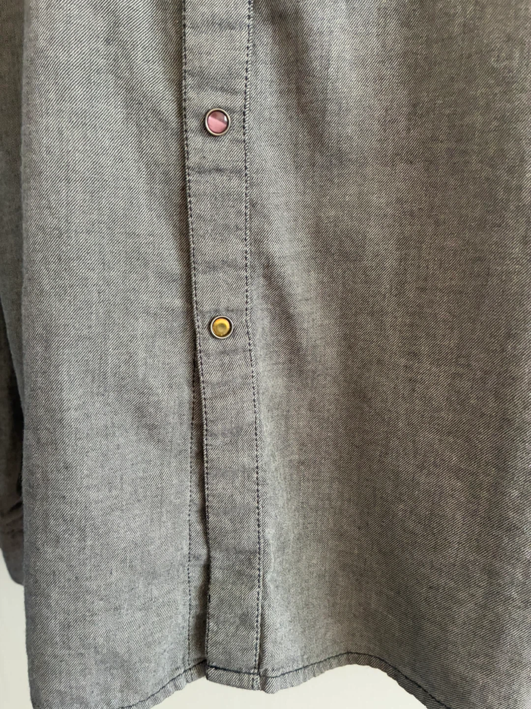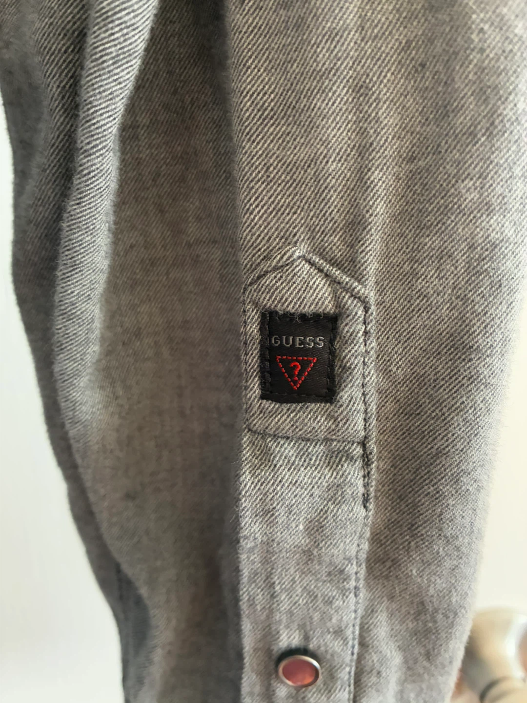 Selling a Guess Los Angeles western style shirt. It's a grey color and has a unique design with snap buttons. Great for casual wear or adding a bit of western flair to your wardrobe!