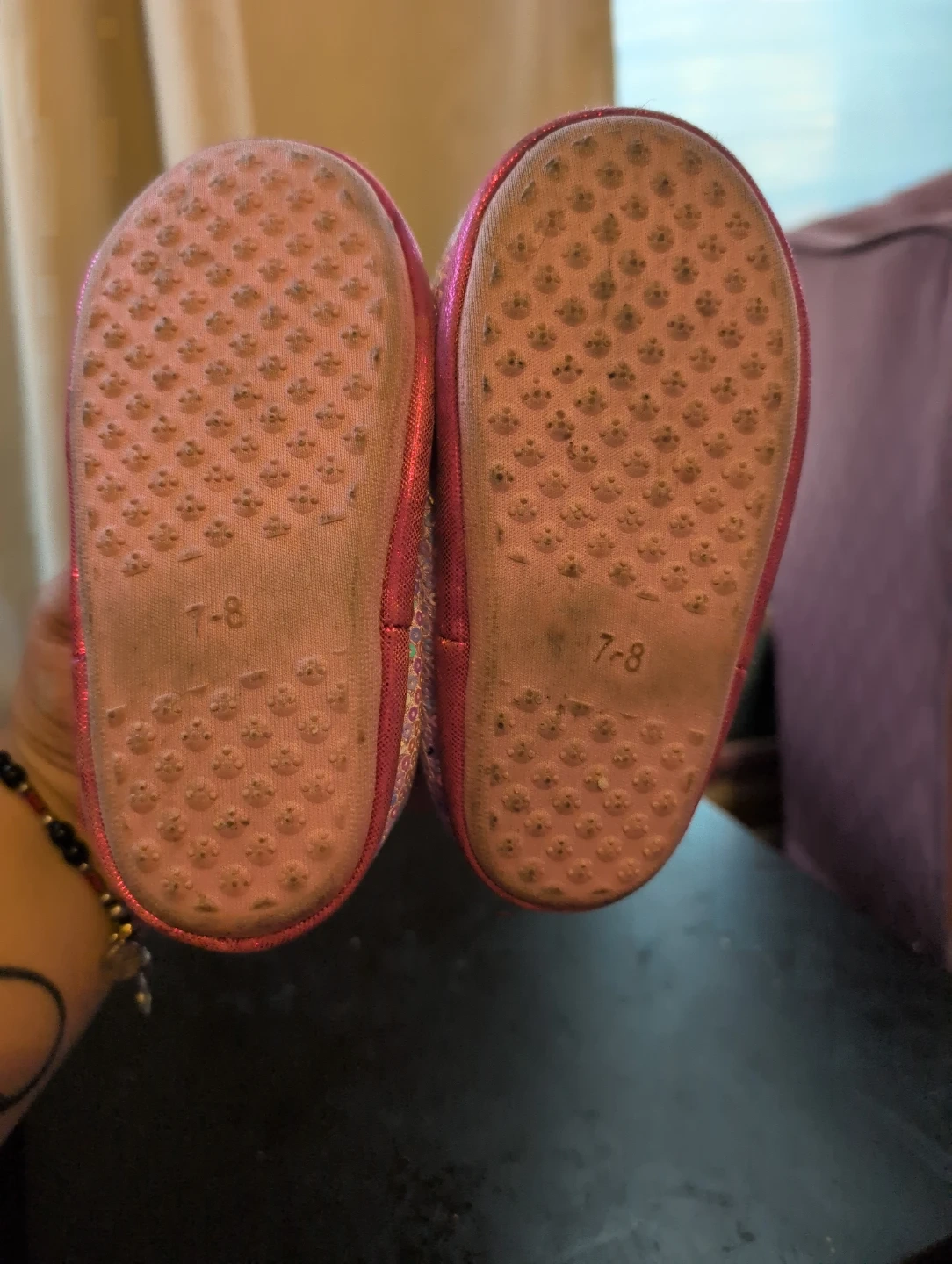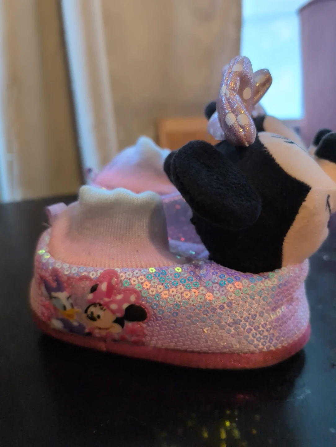 Cute Minnie Mouse slippers in size 7-8! These adorable slippers feature Minnie's face with a polka dot bow and sparkly accents. Perfect for keeping little feet warm and cozy!