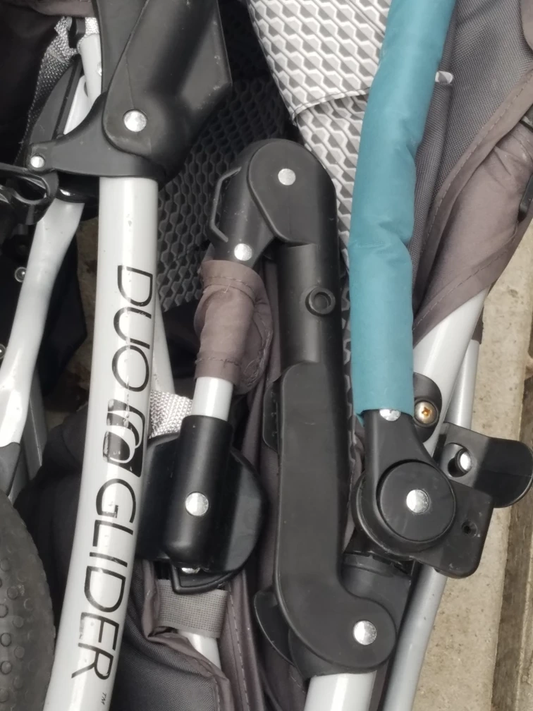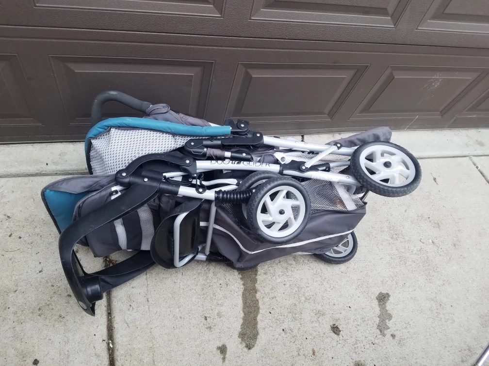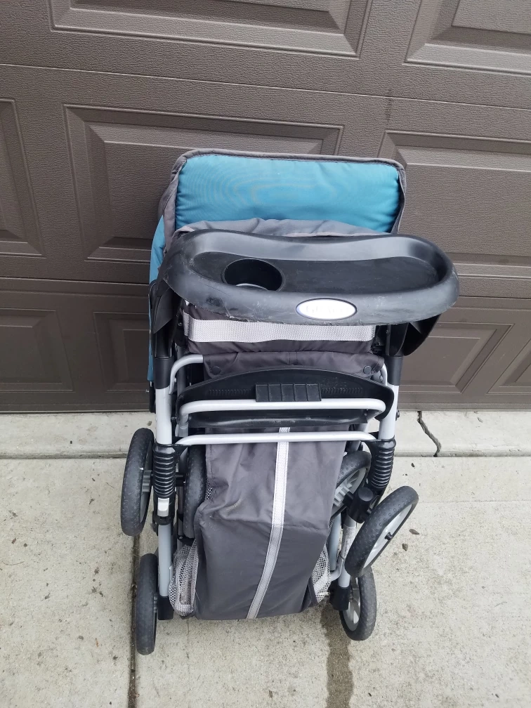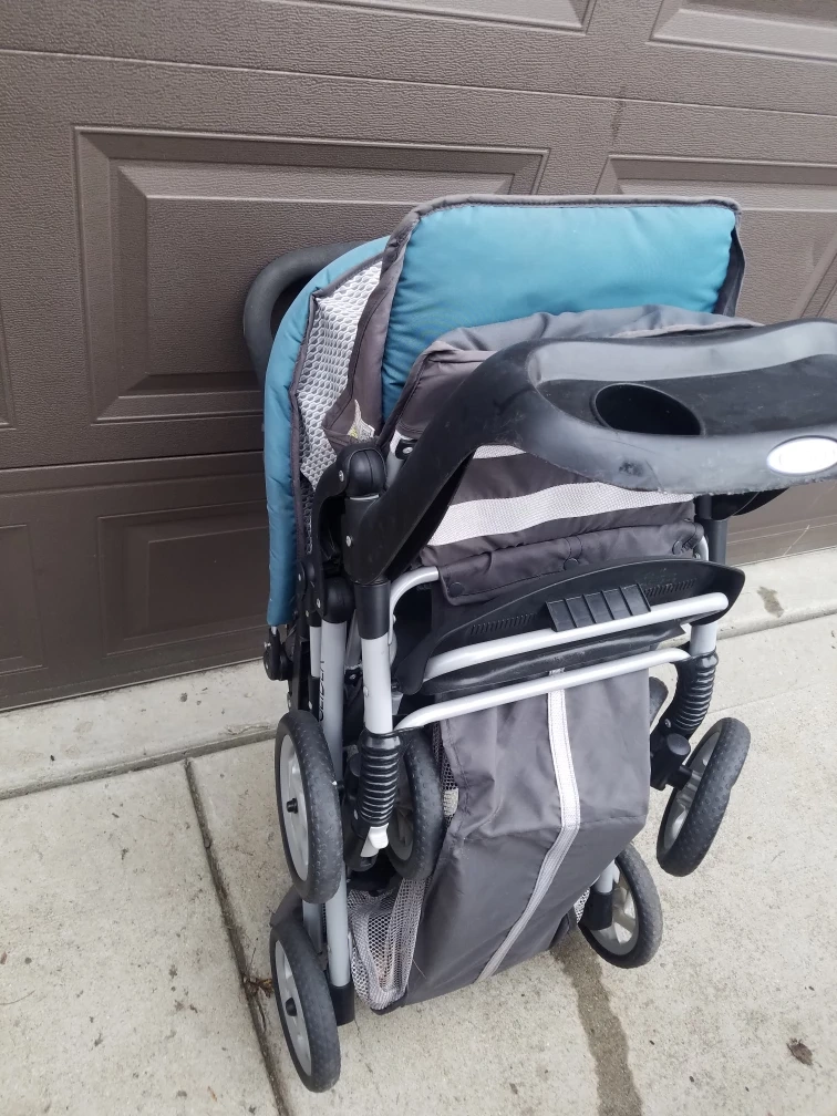 Graco DuoDuo Glider double stroller. Sturdy frame with comfortable seating for two. Easy to fold for storage and transport. Includes parent tray and large storage basket. do not know how to open it selling it as is