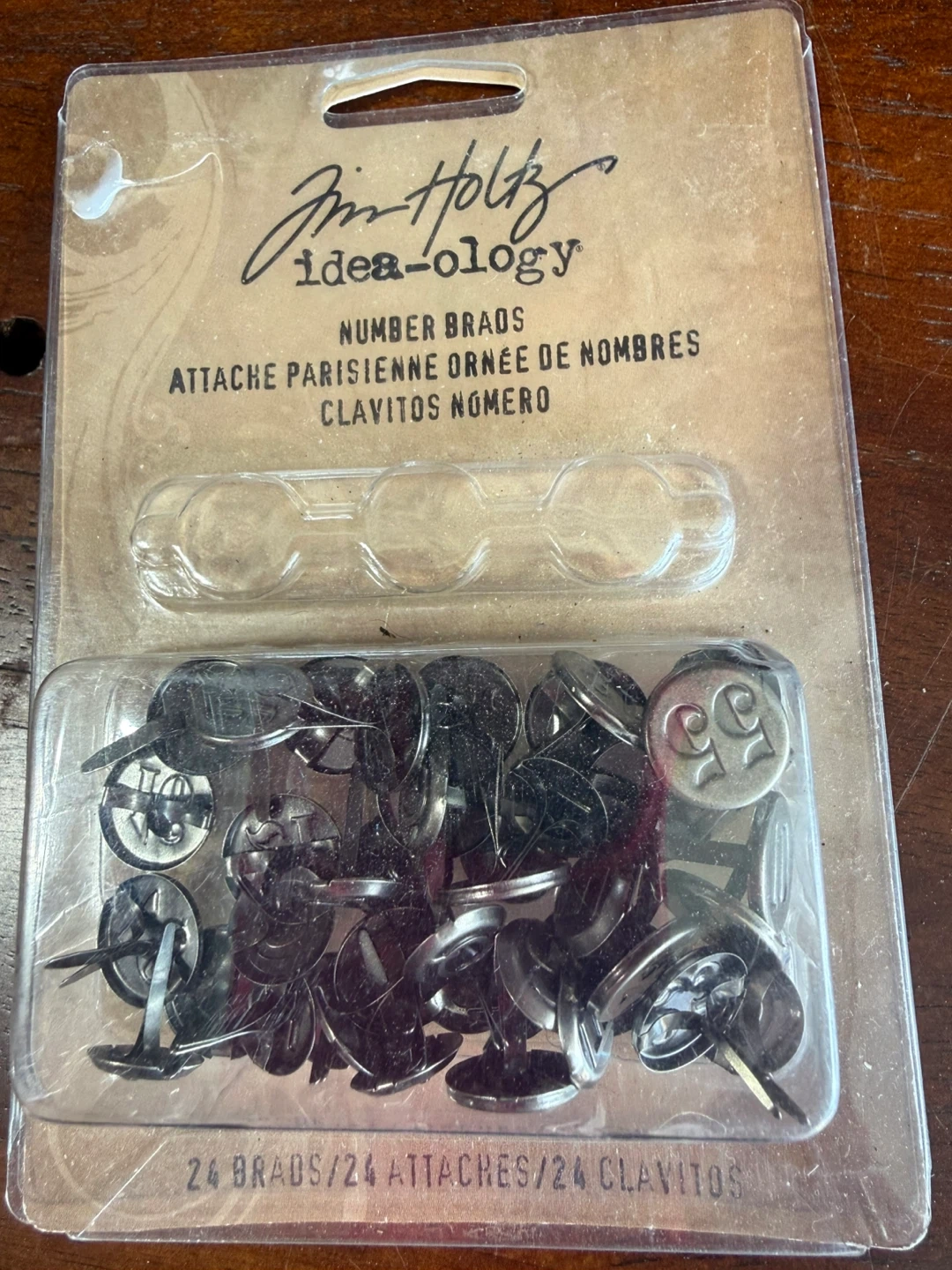 This package contains 24 Tim Holtz Idea-ology number brads. These metal embellishments are perfect for adding a decorative touch to craft projects. They are designed to secure paper or other materials.