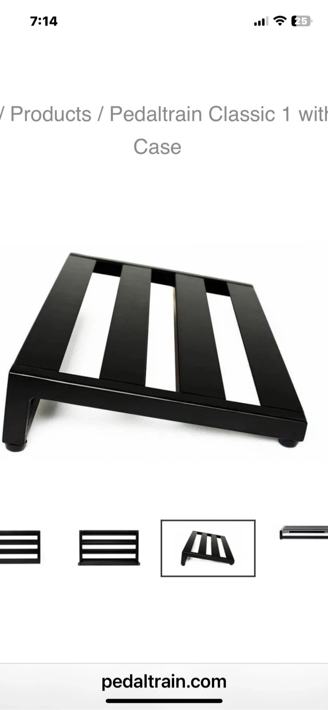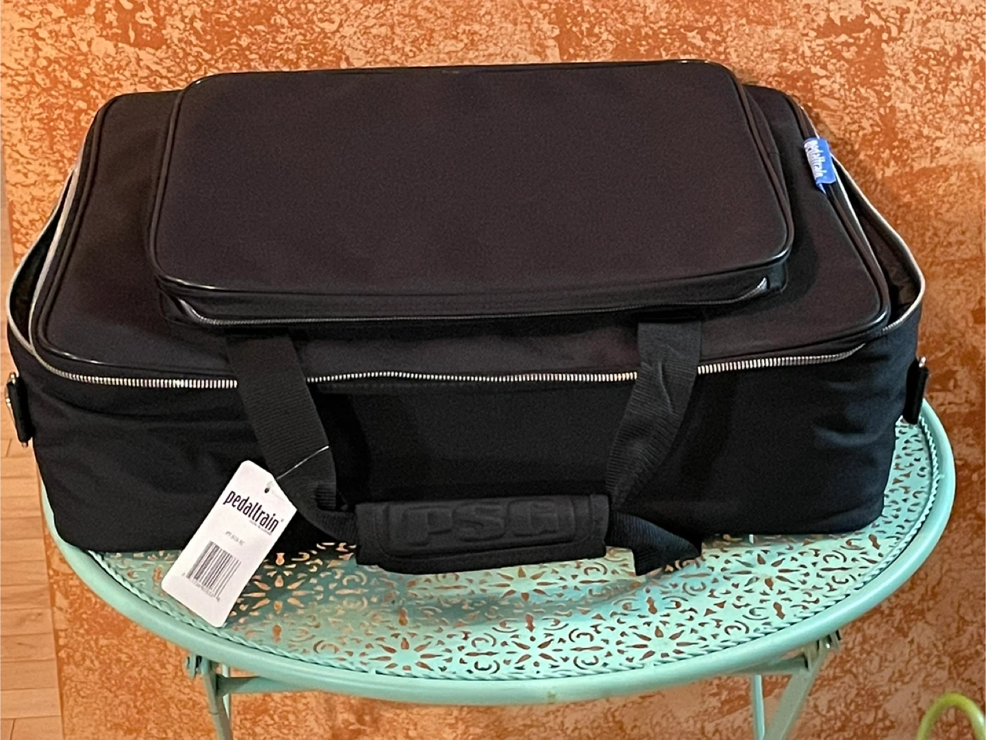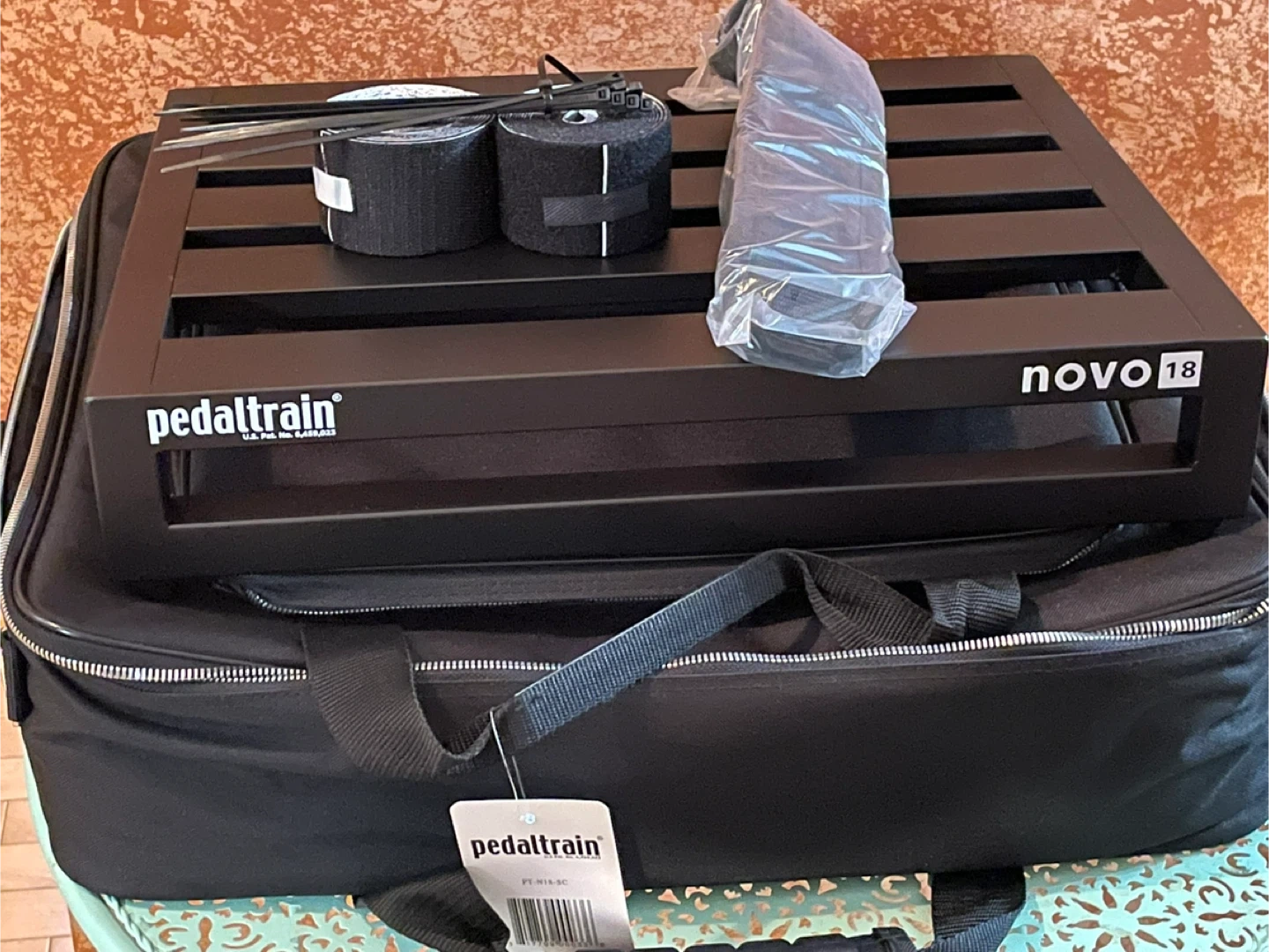 This is a Pedaltrain Classic 1 pedalboard. It's a lightweight and portable aluminum board. Includes a black soft case with shoulder strap and a power supply mounting bracket. Board dimensions: 18 x 5.5 inches.