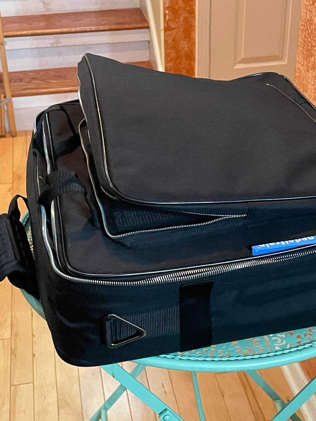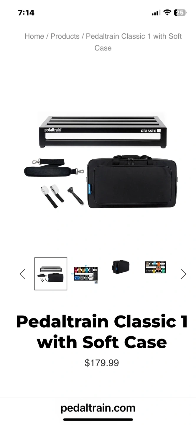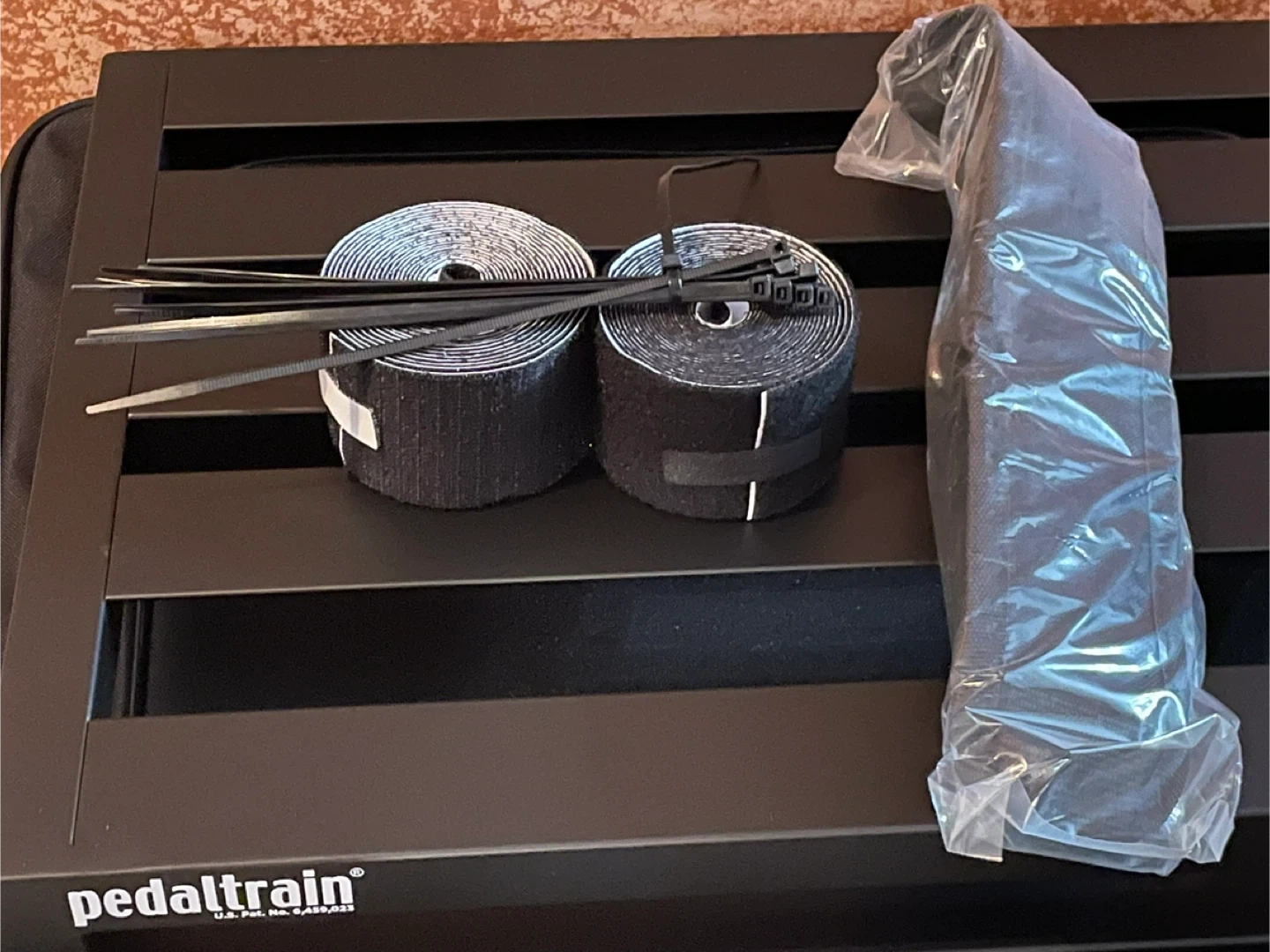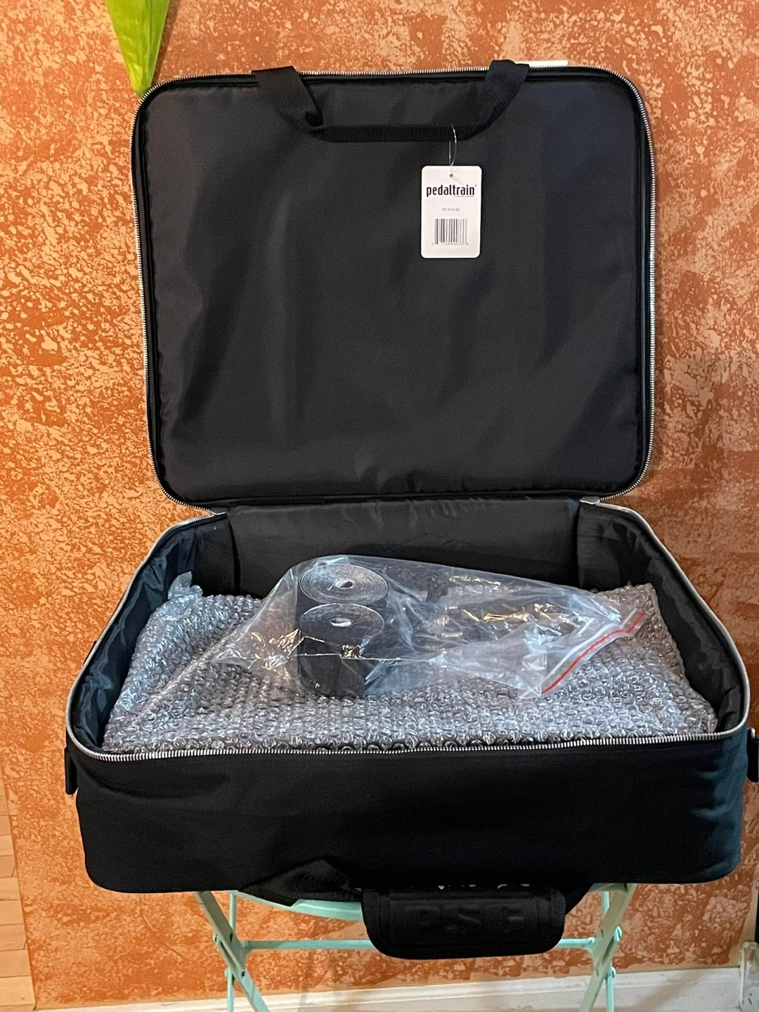 This is a Pedaltrain Classic 1 pedalboard. It's a lightweight and portable aluminum board. Includes a black soft case with shoulder strap and a power supply mounting bracket. Board dimensions: 18 x 5.5 inches.