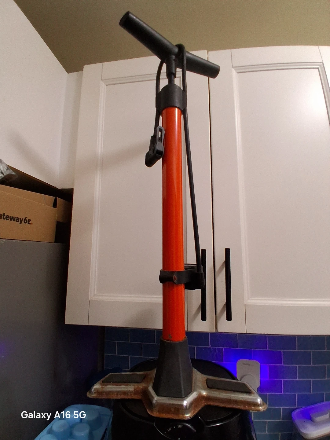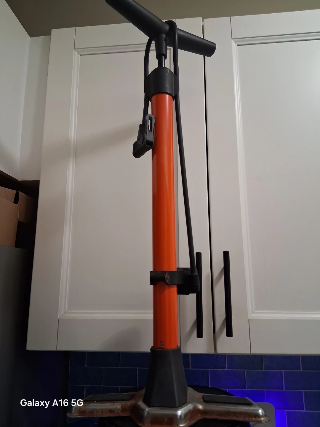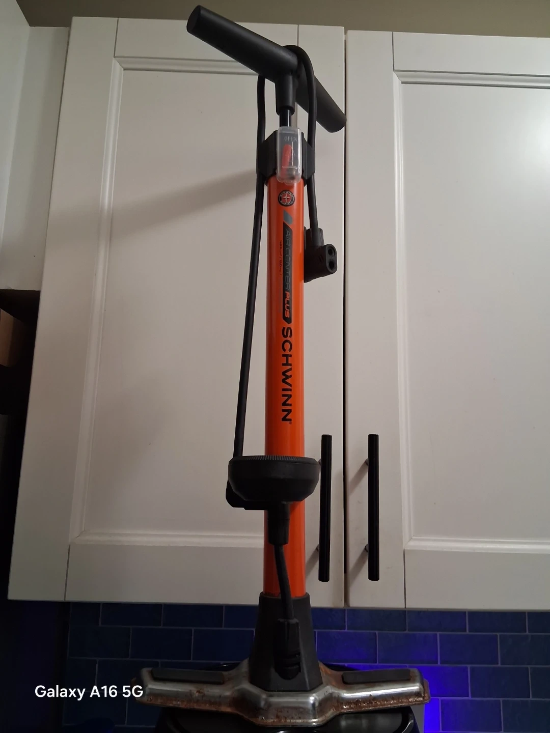 Orange Schwinn floor pump. Features a sturdy base and a flexible hose. It's great for keeping your bike tires properly inflated!