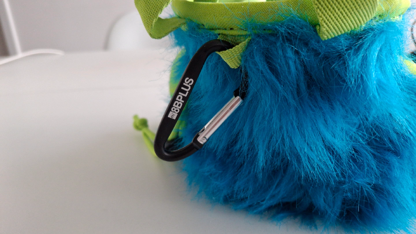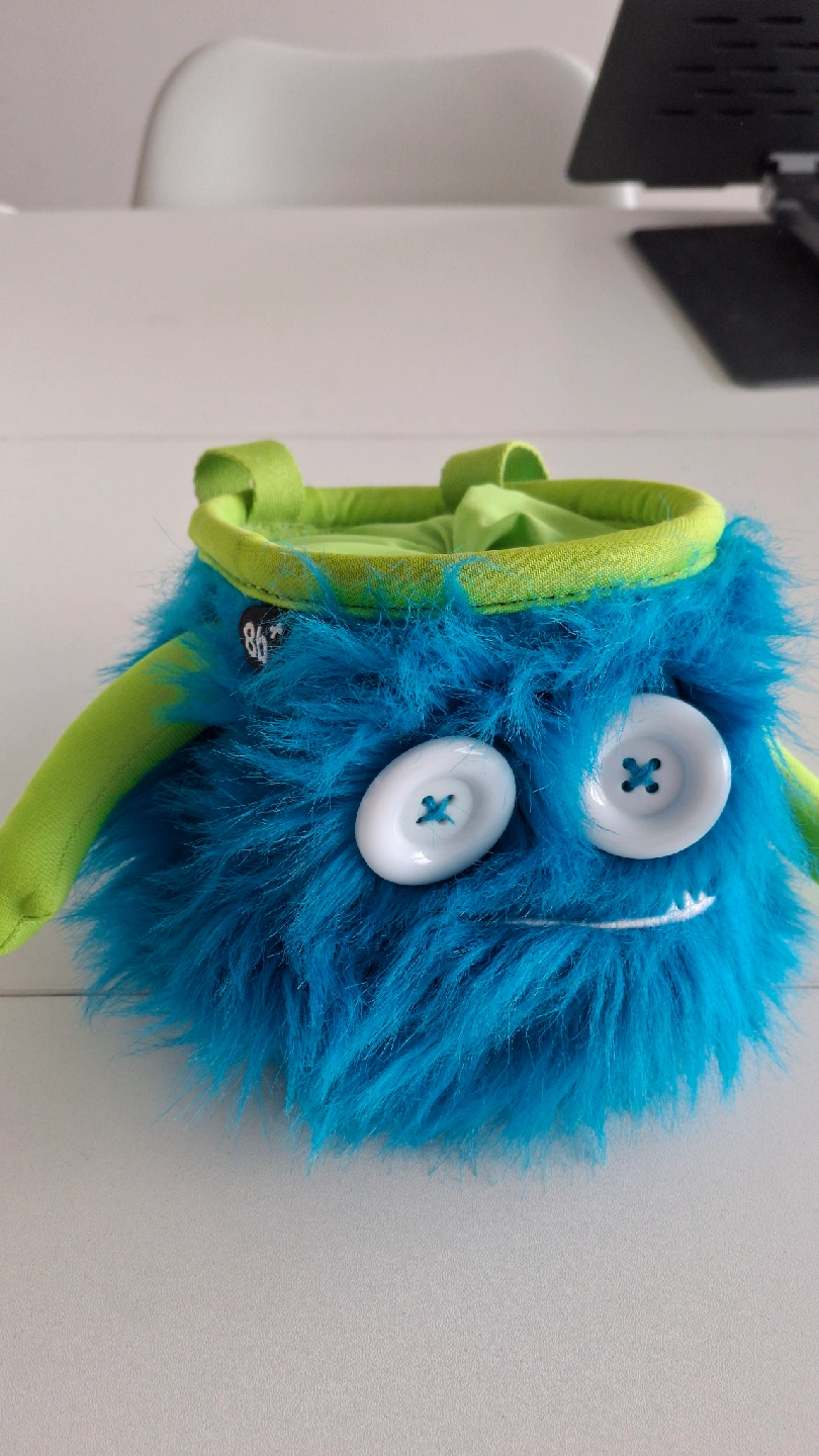 Selling a fun 8BPlus chalk bag in a vibrant blue monster design! It's perfect for climbing and bouldering. The bag has a soft lining and a secure closure to keep your chalk in place. It also includes a carabiner for easy attachment to your harness
